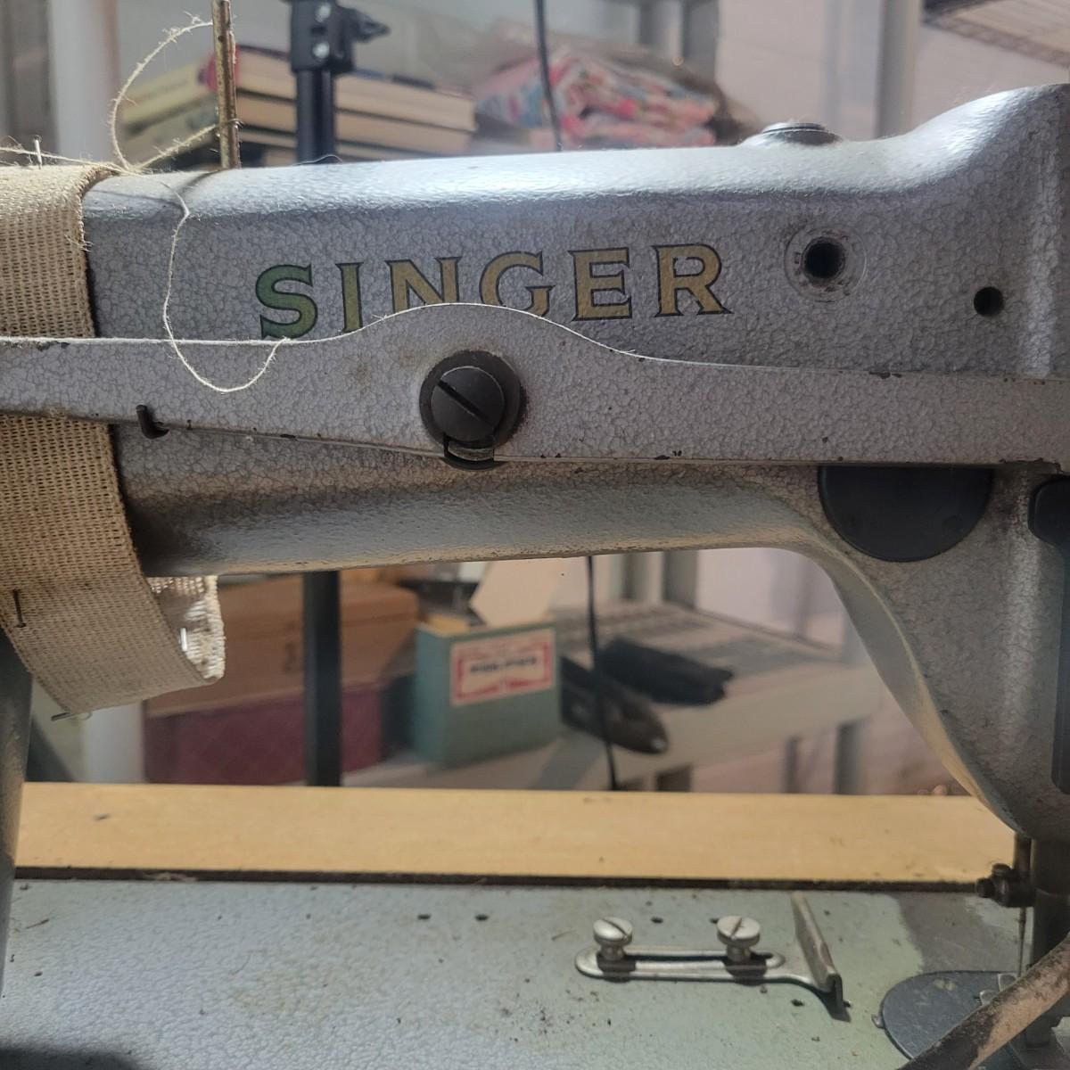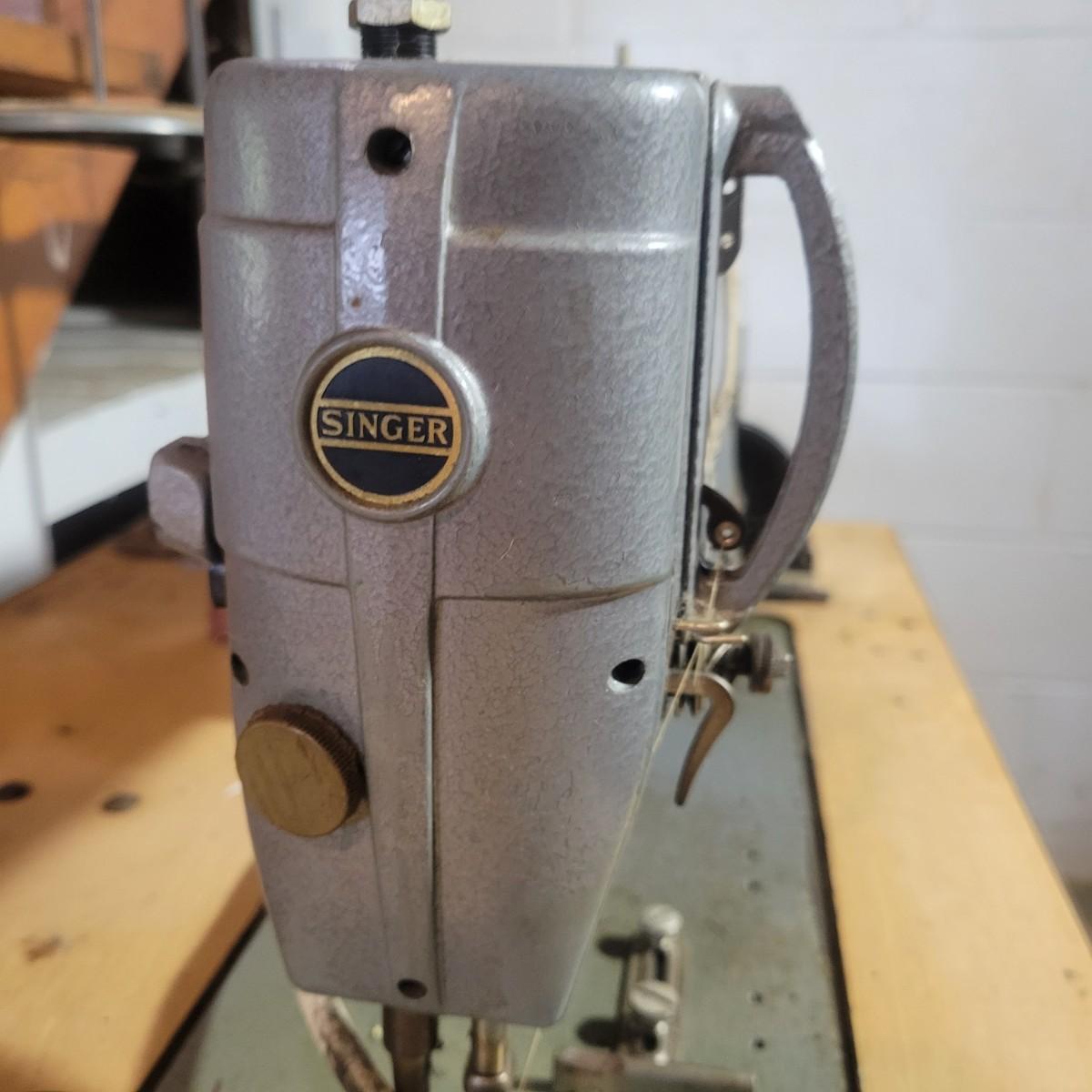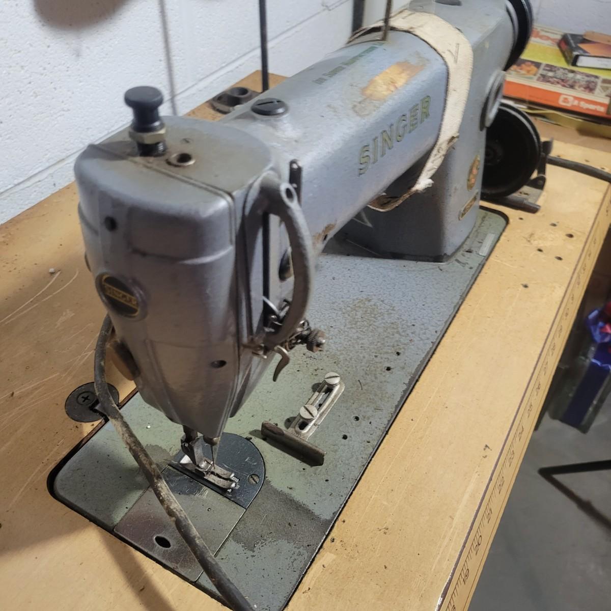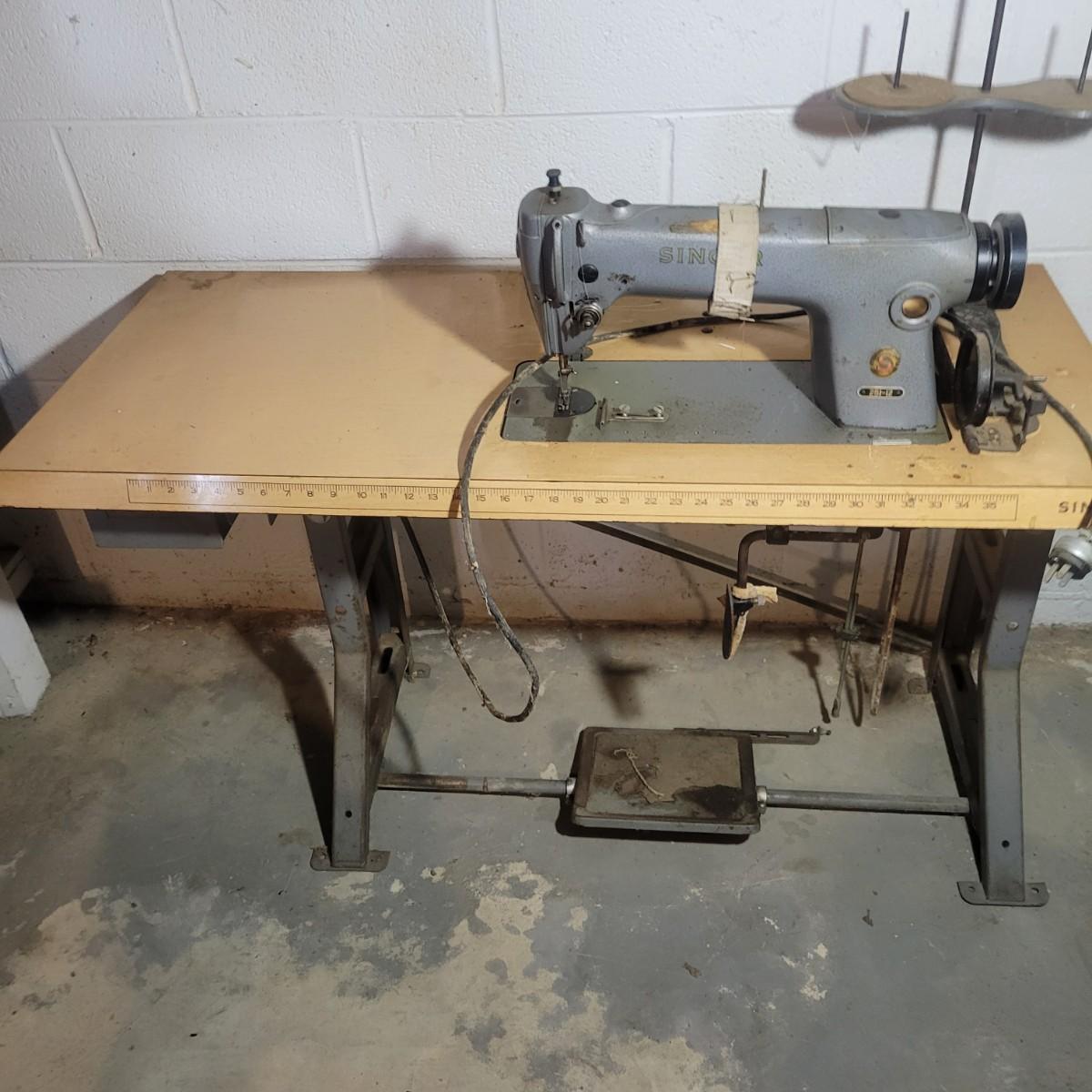A Singer S51-12 industrial sewing machine in good condition, but shows some use and age. The foot pedal is not connected to its rod and the belt from the motor to the machine pulley is not attached. Motor was tested and works. Wood table is mounted on a heavy duty metal frame. Table includes a tower to hold large spools of thread. Table is in good condition, although quite dusty. There are some holes in the tabletop from what appears to be something screwed in in the past, and a little wear on the corners. Measures approximately 48" x 21" x 54". Local pickup only