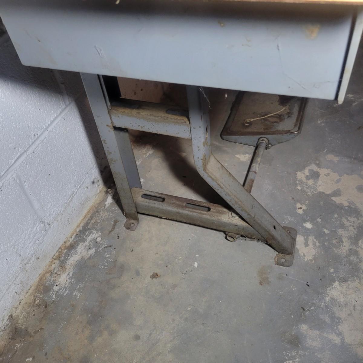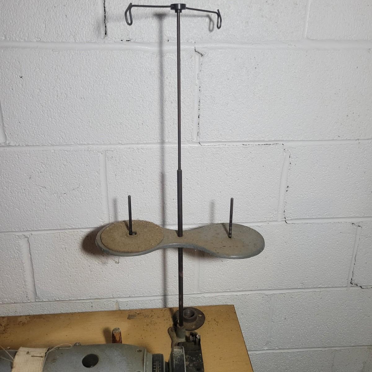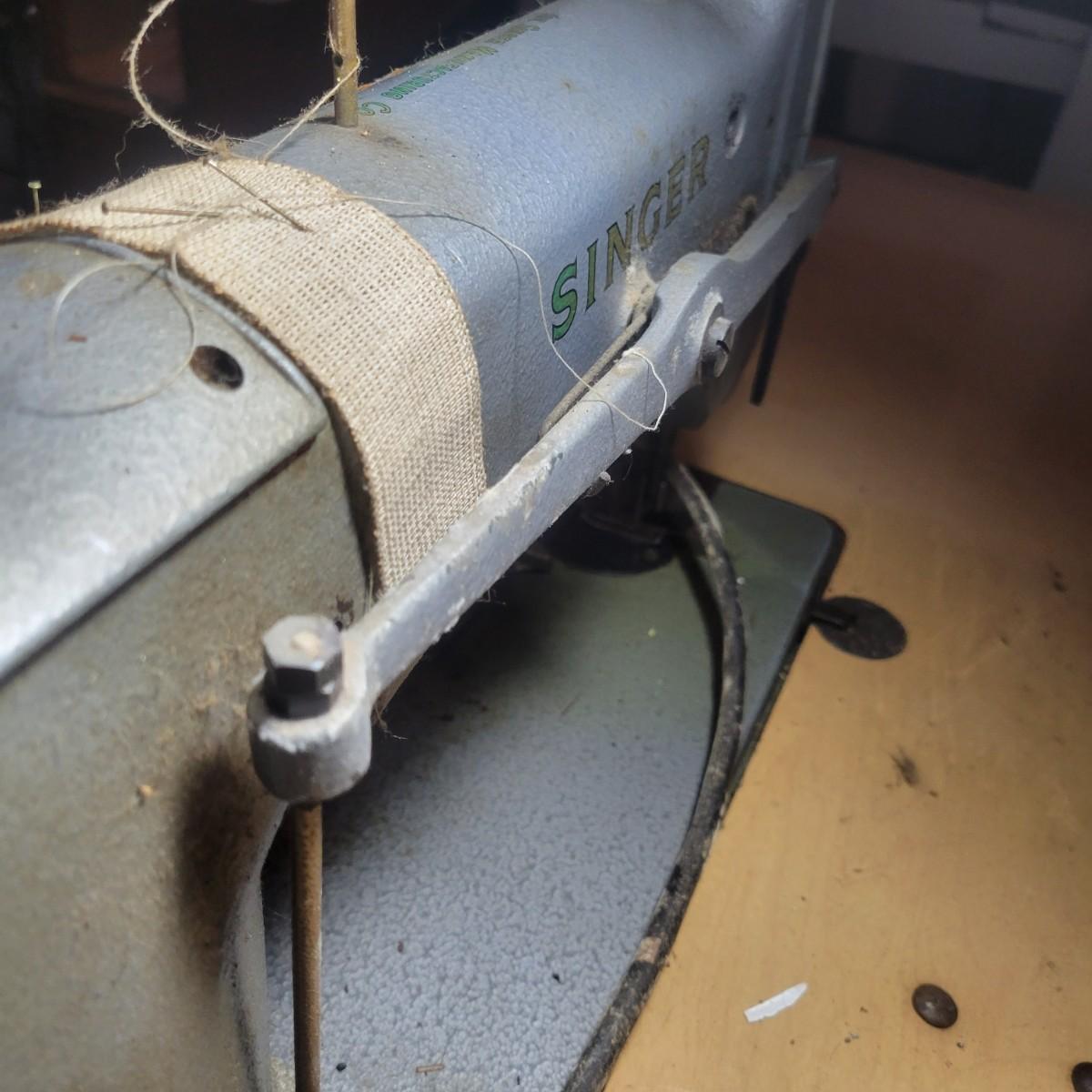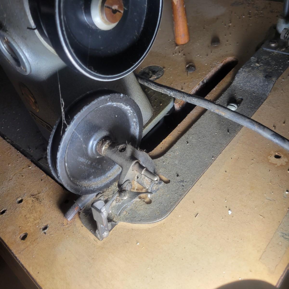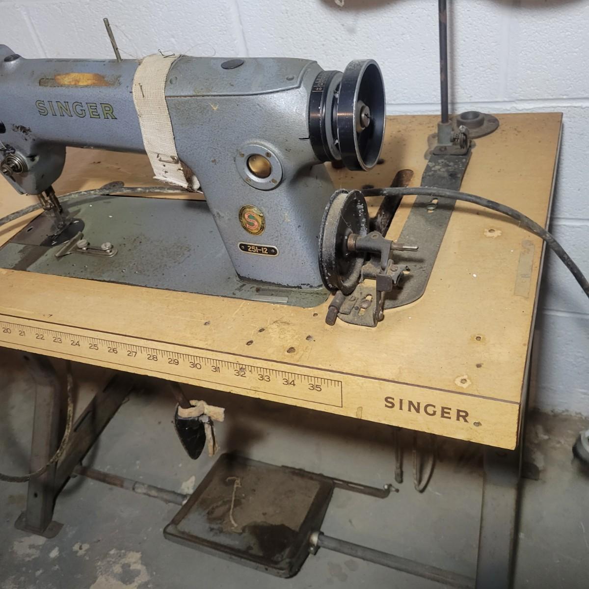 A Singer S51-12 industrial sewing machine in good condition, but shows some use and age. The foot pedal is not connected to its rod and the belt from the motor to the machine pulley is not attached. Motor was tested and works. Wood table is mounted on a heavy duty metal frame. Table includes a tower to hold large spools of thread. Table is in good condition, although quite dusty. There are some holes in the tabletop from what appears to be something screwed in in the past, and a little wear on the corners. Measures approximately 48" x 21" x 54". Local pickup only