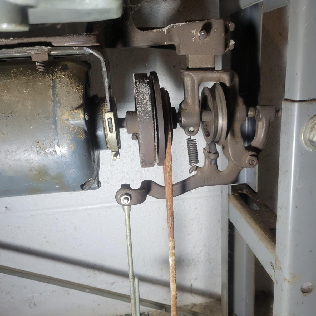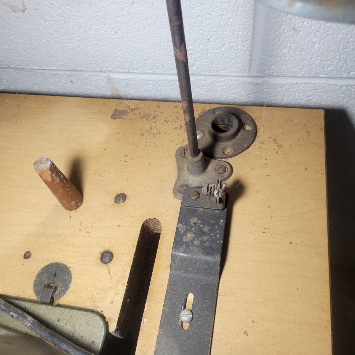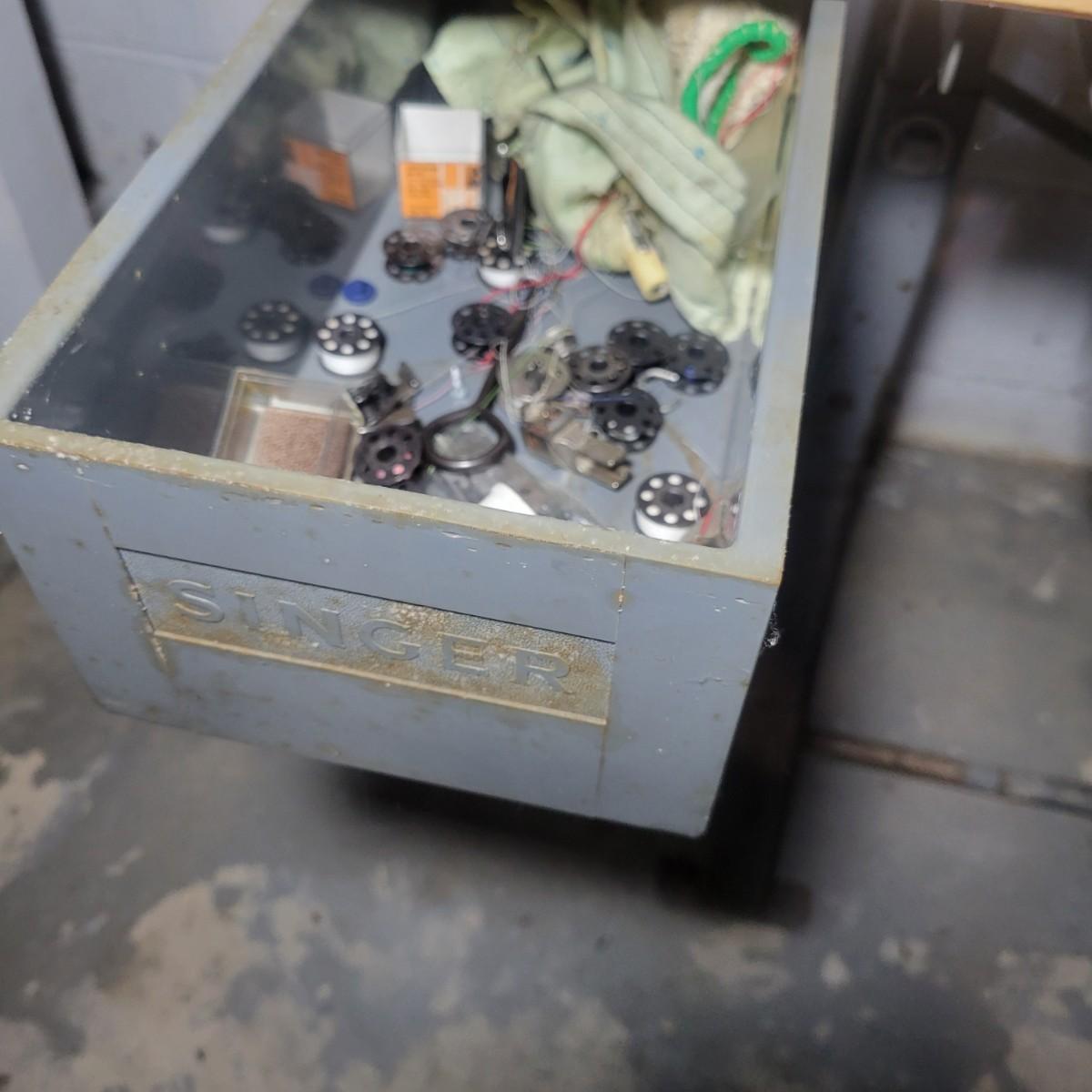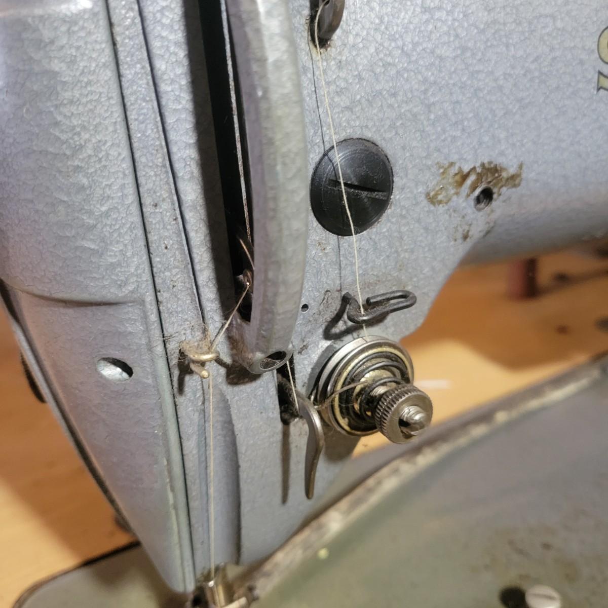 A Singer S51-12 industrial sewing machine in good condition, but shows some use and age. The foot pedal is not connected to its rod and the belt from the motor to the machine pulley is not attached. Motor was tested and works. Wood table is mounted on a heavy duty metal frame. Table includes a tower to hold large spools of thread. Table is in good condition, although quite dusty. There are some holes in the tabletop from what appears to be something screwed in in the past, and a little wear on the corners. Measures approximately 48" x 21" x 54". Local pickup only