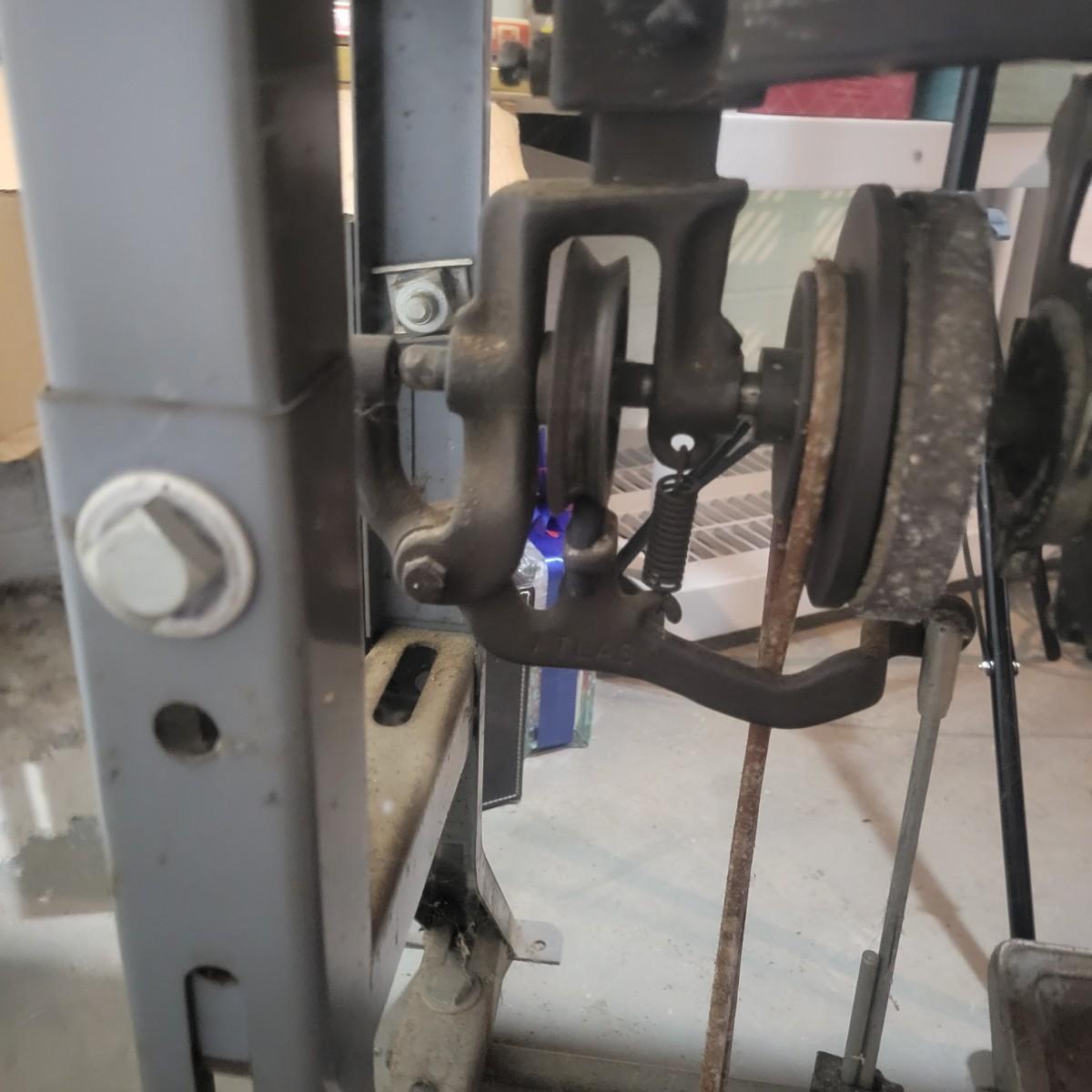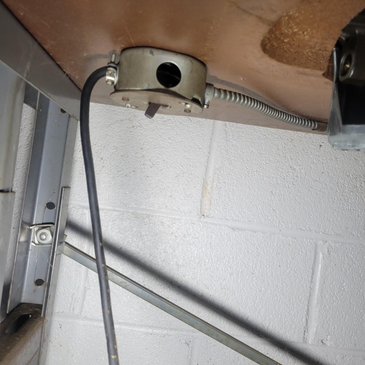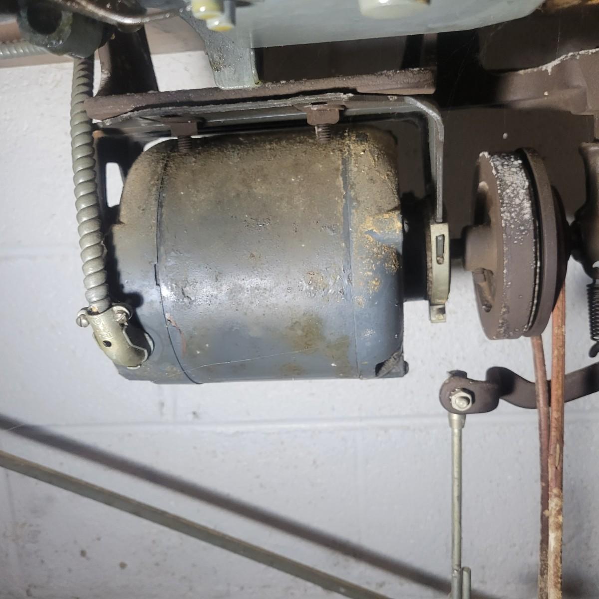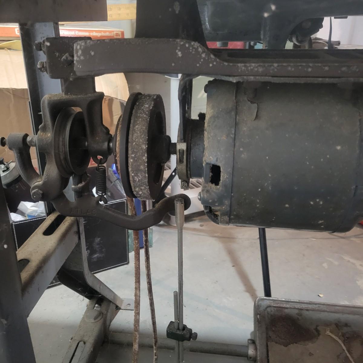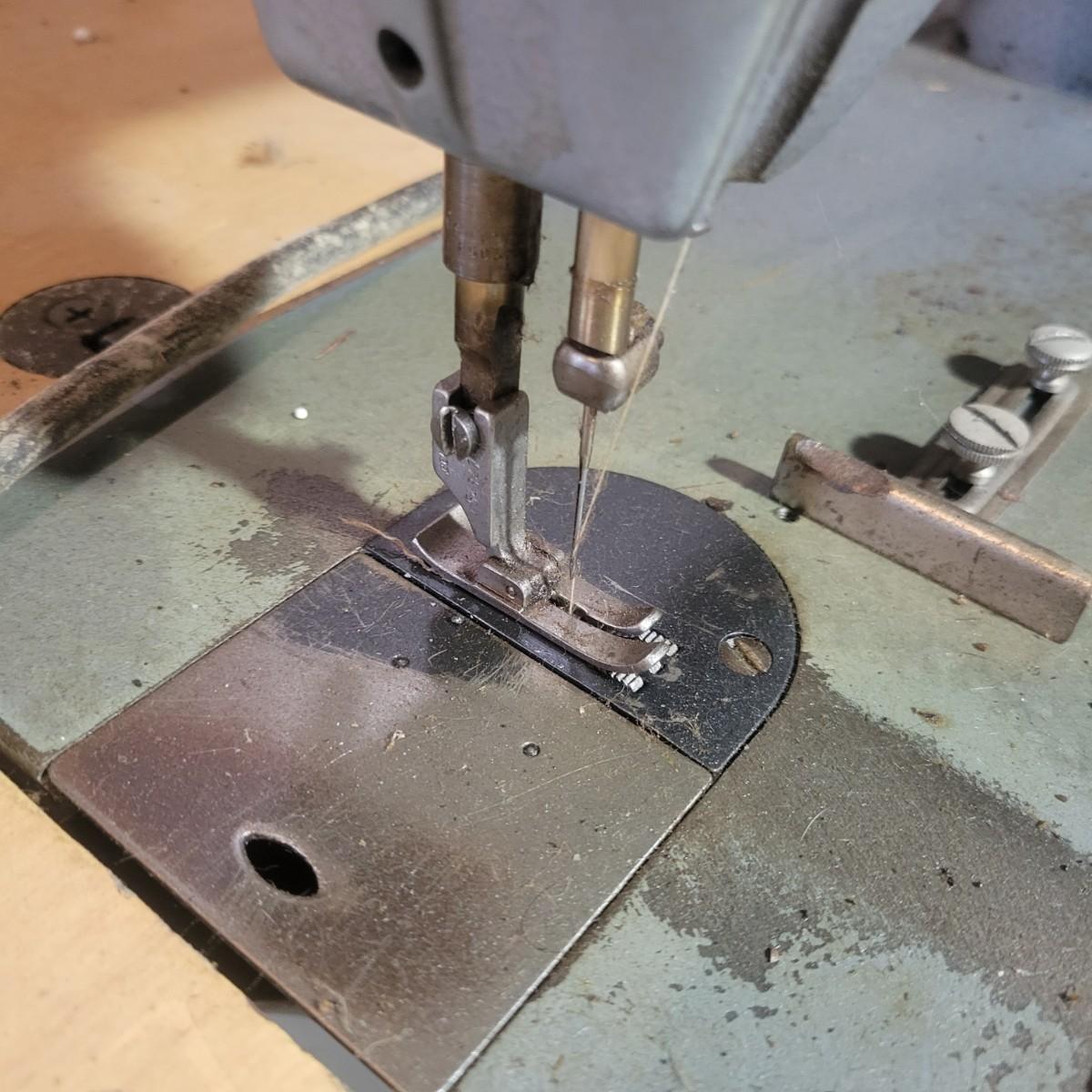 A Singer S51-12 industrial sewing machine in good condition, but shows some use and age. The foot pedal is not connected to its rod and the belt from the motor to the machine pulley is not attached. Motor was tested and works. Wood table is mounted on a heavy duty metal frame. Table includes a tower to hold large spools of thread. Table is in good condition, although quite dusty. There are some holes in the tabletop from what appears to be something screwed in in the past, and a little wear on the corners. Measures approximately 48" x 21" x 54". Local pickup only