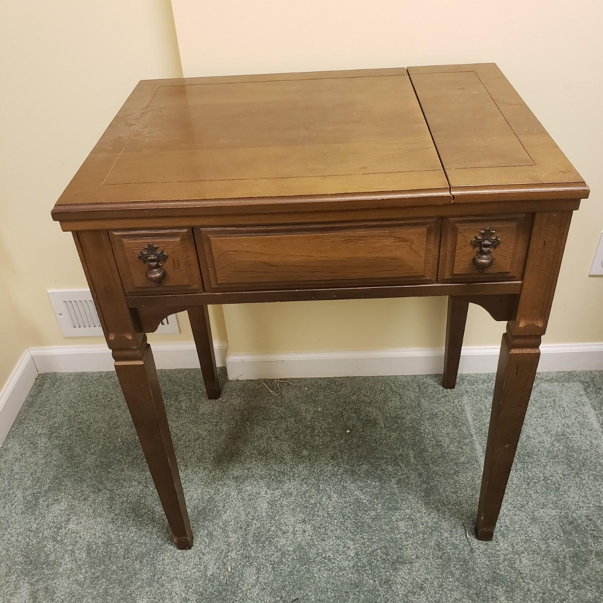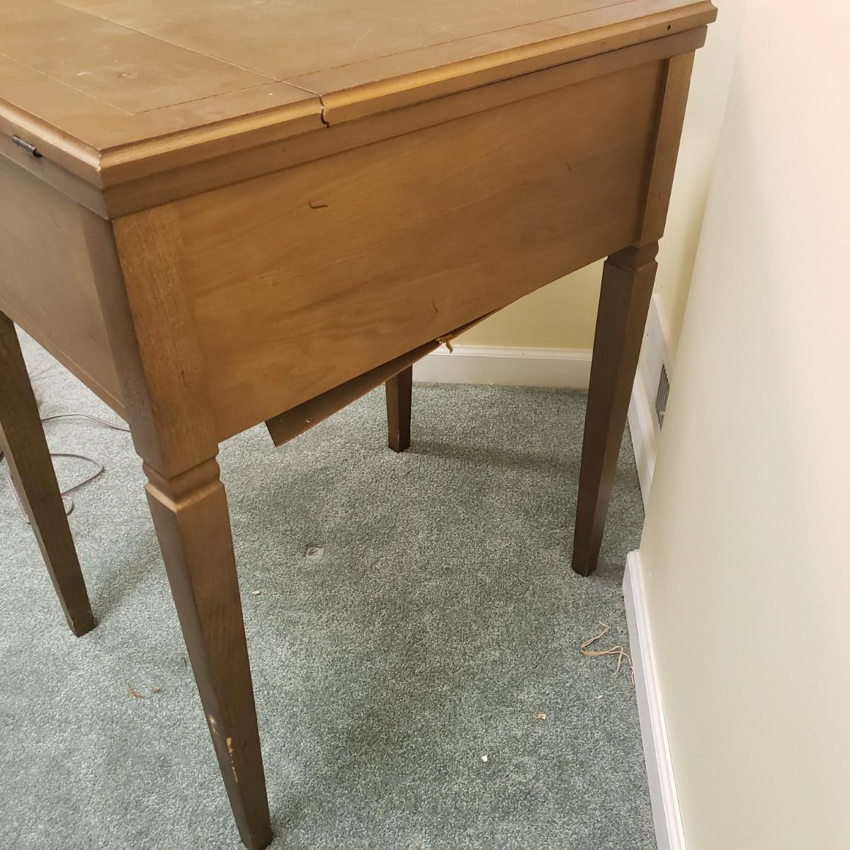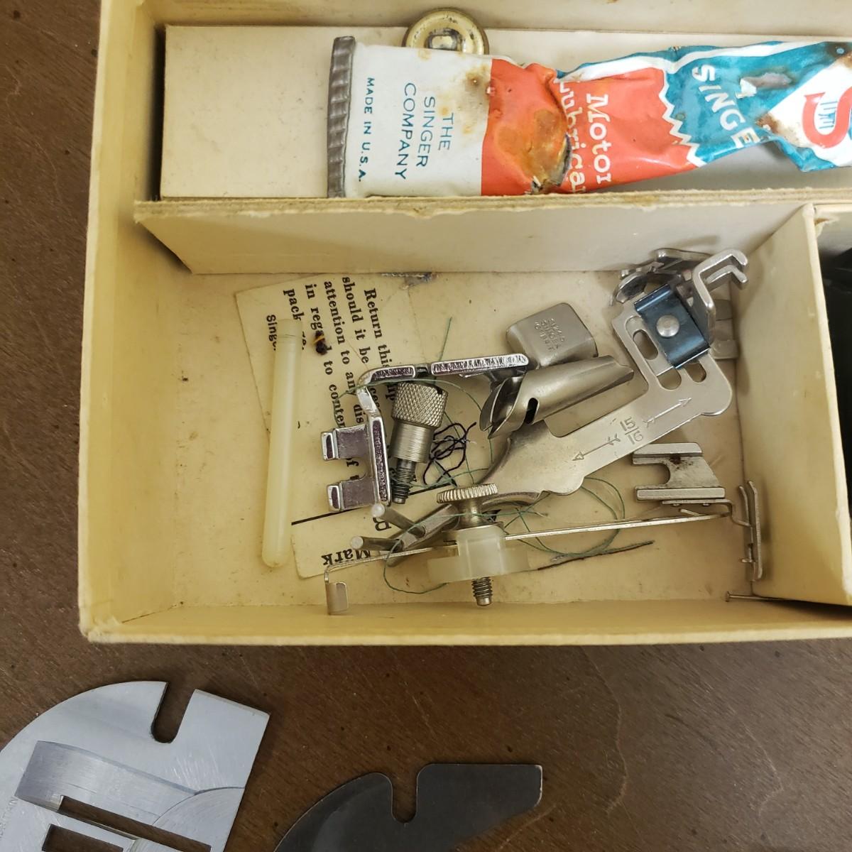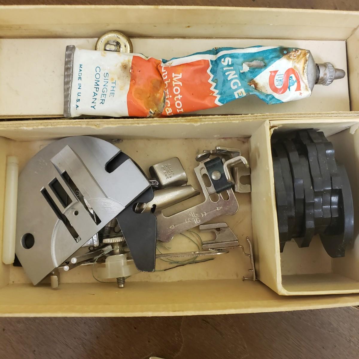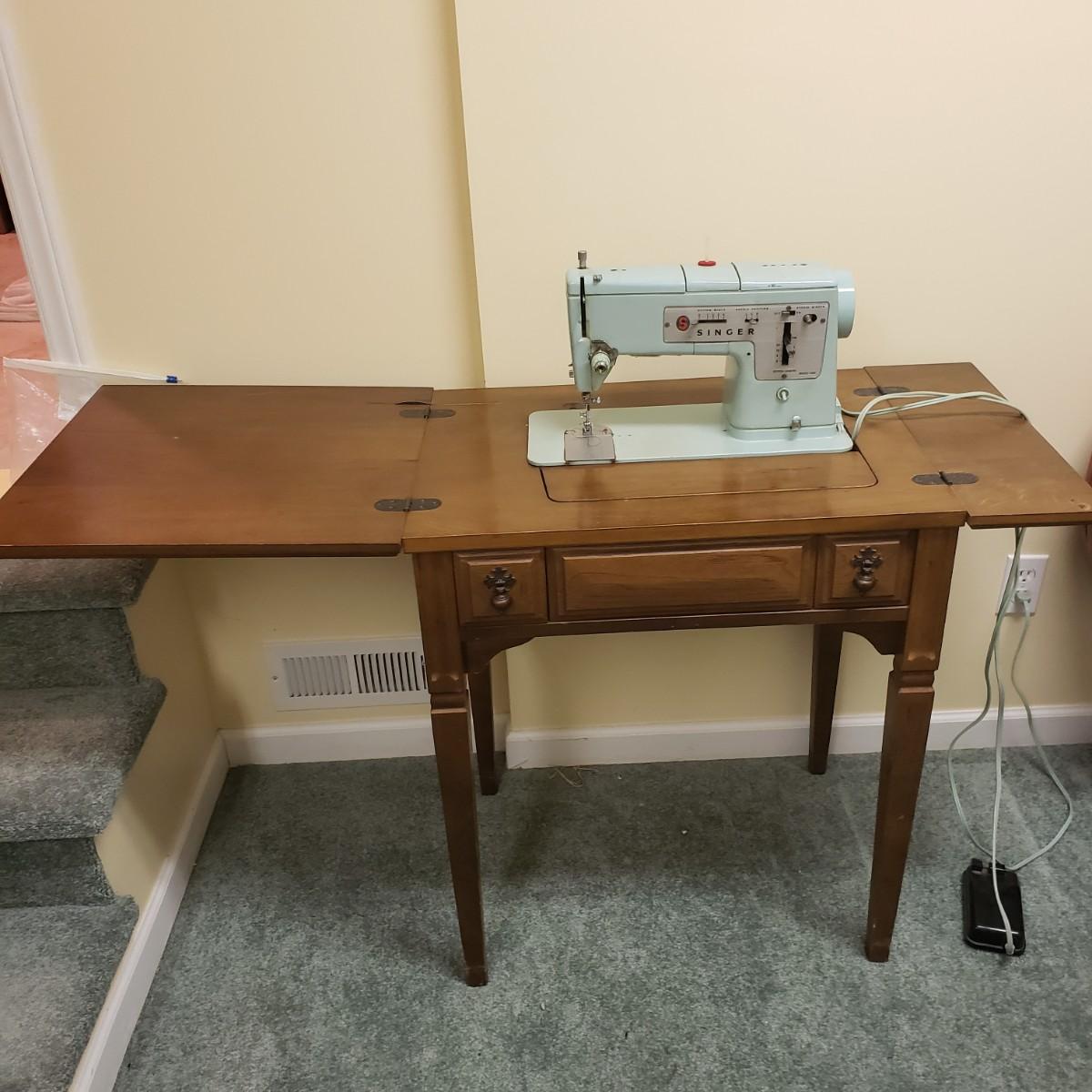 This vintage Singer Sewing machine cabinet measures 26" x 19" x 30"H fold up. The cabinet is made of wood and the front section with one drawer and one faux drawer is a plastic front. The machine fit in table for easy storage. When unfolded, the table measures 51" x 19" x 30"H. The sewing machine powers on when plugged in. The foot press will turn the spindle for a little bit, then stop, so it will need some maintenance to functional a sewing machine. The table itself would make a great side table! The box of feet and instruction manuals are included. The back bottom is hanging, but appears to be fixable.