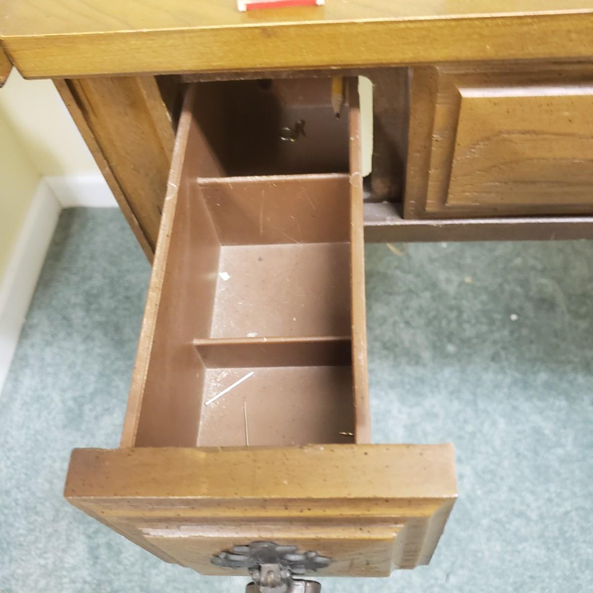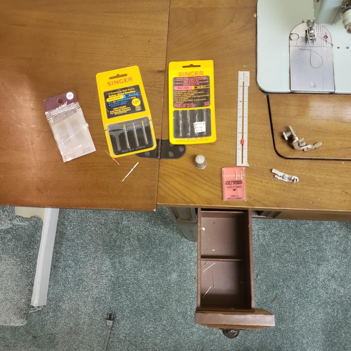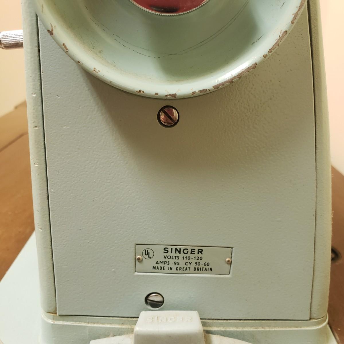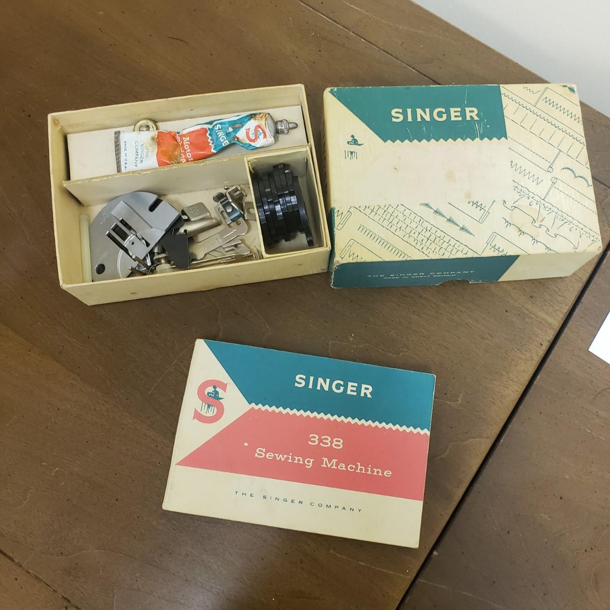 This vintage Singer Sewing machine cabinet measures 26" x 19" x 30"H fold up. The cabinet is made of wood and the front section with one drawer and one faux drawer is a plastic front. The machine fit in table for easy storage. When unfolded, the table measures 51" x 19" x 30"H. The sewing machine powers on when plugged in. The foot press will turn the spindle for a little bit, then stop, so it will need some maintenance to functional a sewing machine. The table itself would make a great side table! The box of feet and instruction manuals are included. The back bottom is hanging, but appears to be fixable.