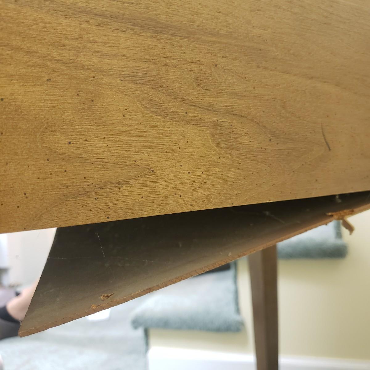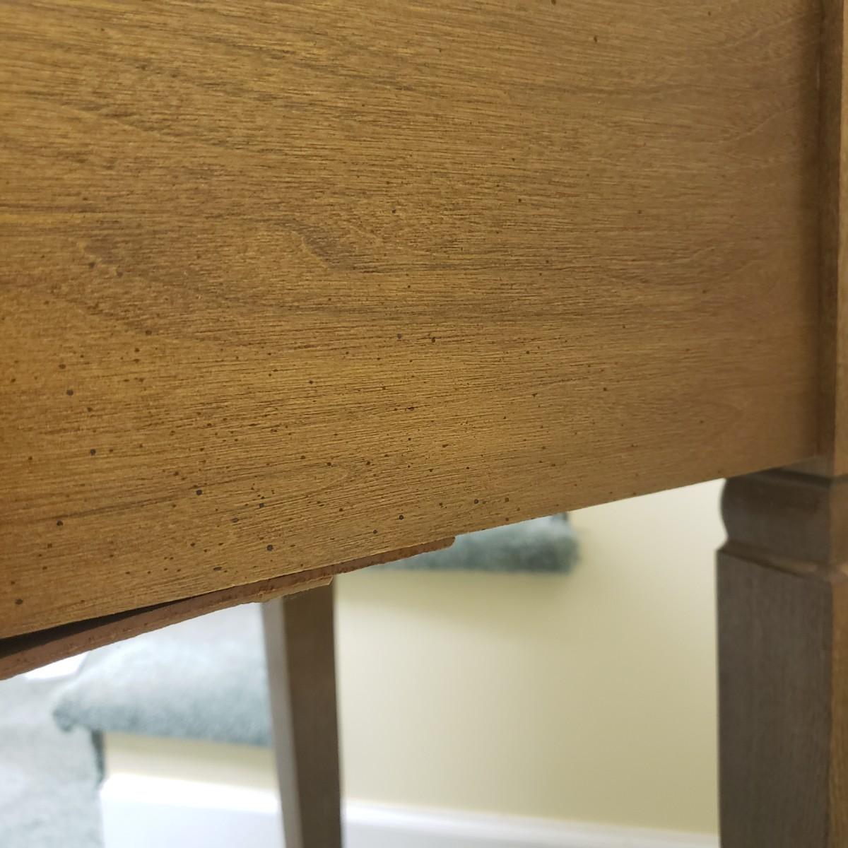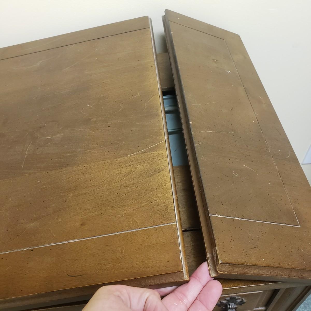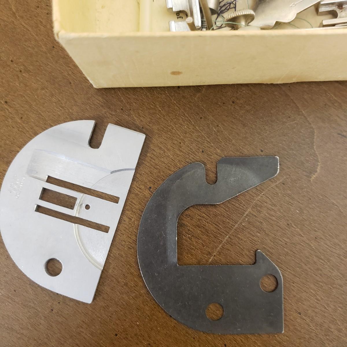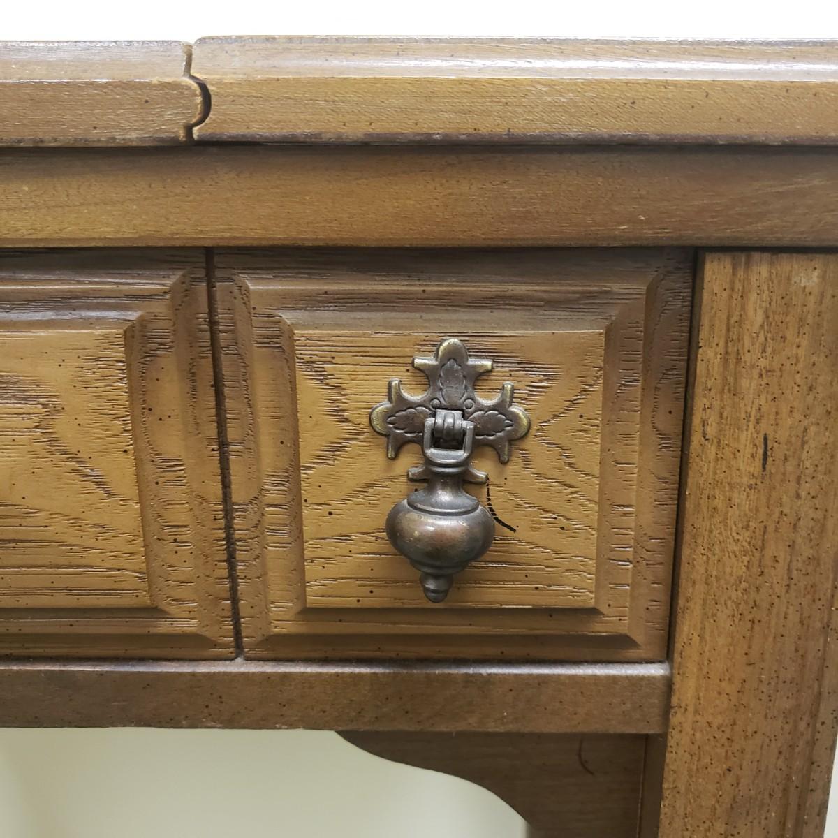This vintage Singer Sewing machine cabinet measures 26" x 19" x 30"H fold up. The cabinet is made of wood and the front section with one drawer and one faux drawer is a plastic front. The machine fit in table for easy storage. When unfolded, the table measures 51" x 19" x 30"H. The sewing machine powers on when plugged in. The foot press will turn the spindle for a little bit, then stop, so it will need some maintenance to functional a sewing machine. The table itself would make a great side table! The box of feet and instruction manuals are included. The back bottom is hanging, but appears to be fixable.