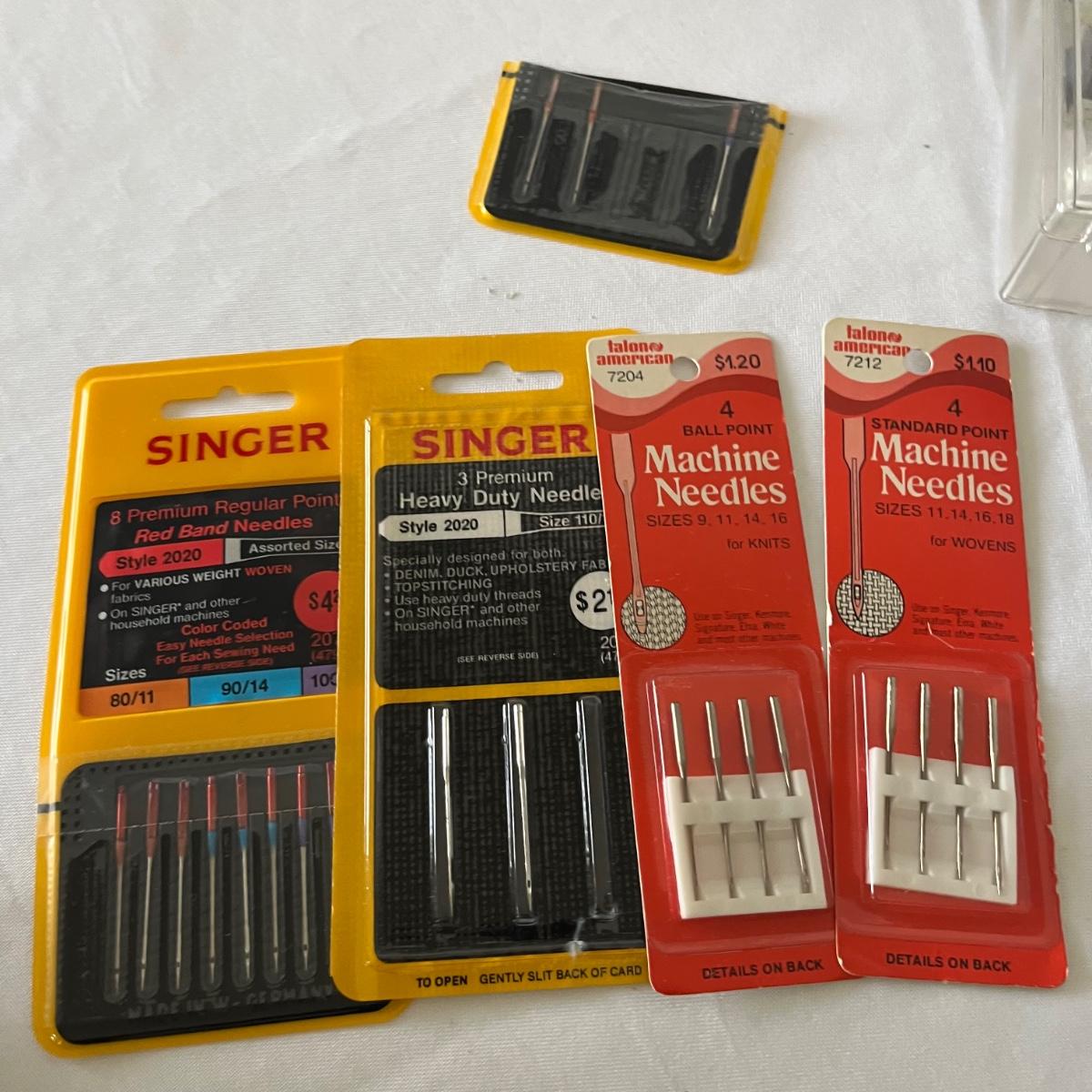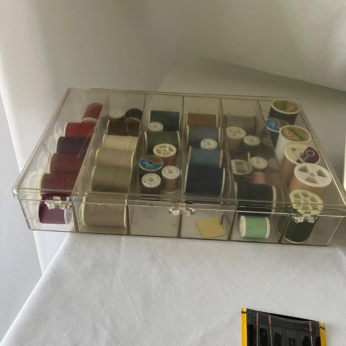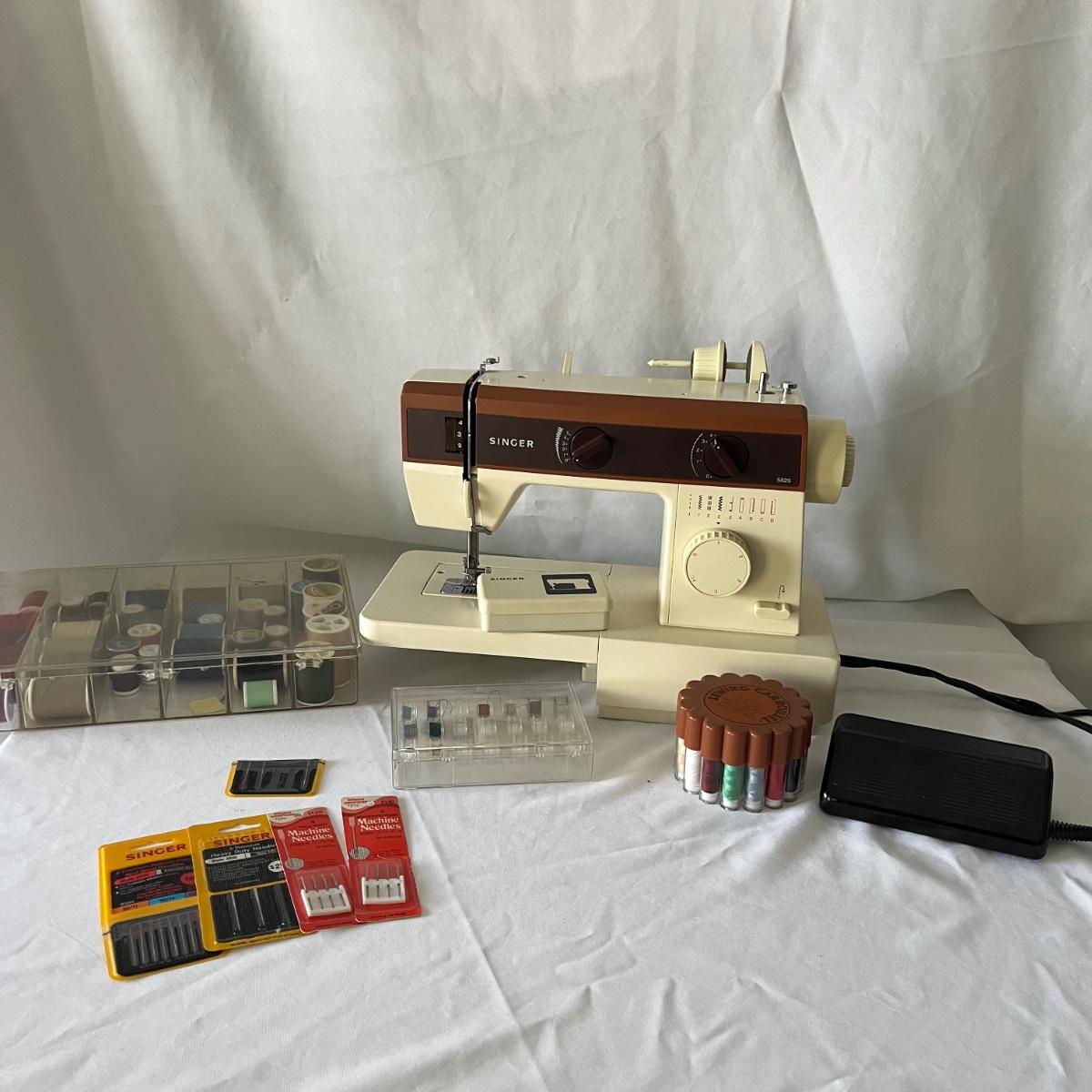 Lot includes a Singer sewing machine that powered on when plugged in. Also includes thread, needles, bobbins and more.