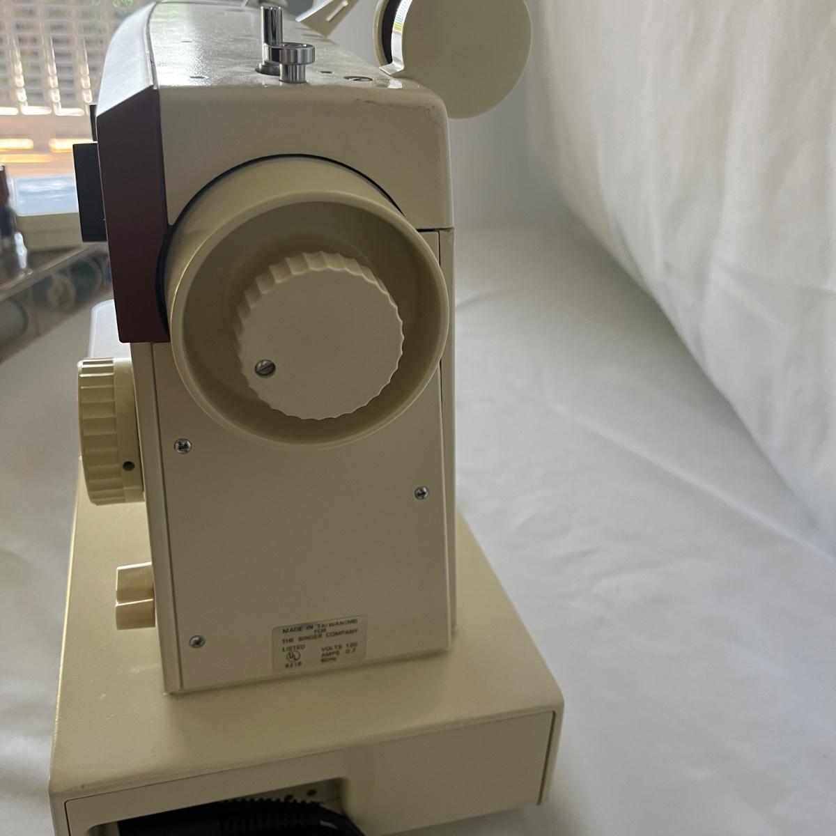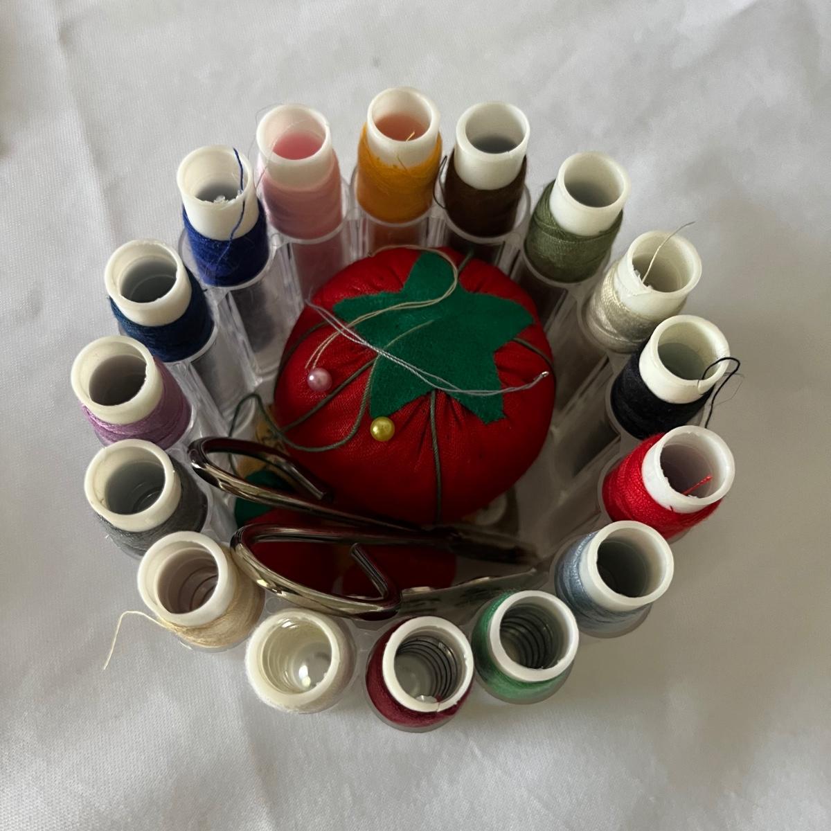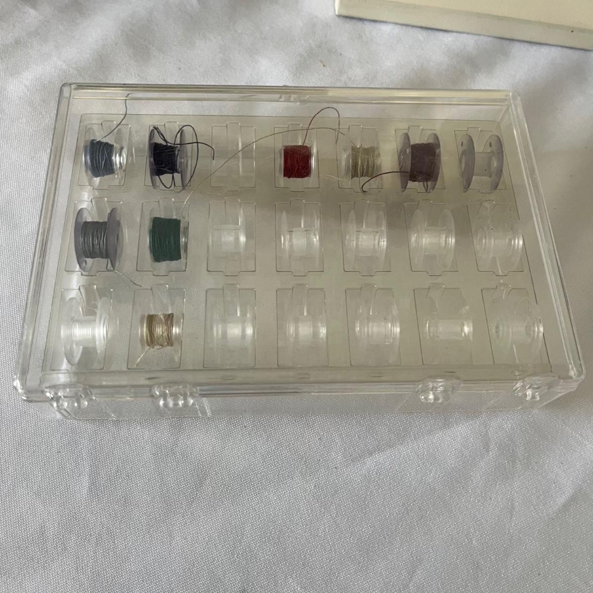 Lot includes a Singer sewing machine that powered on when plugged in. Also includes thread, needles, bobbins and more.