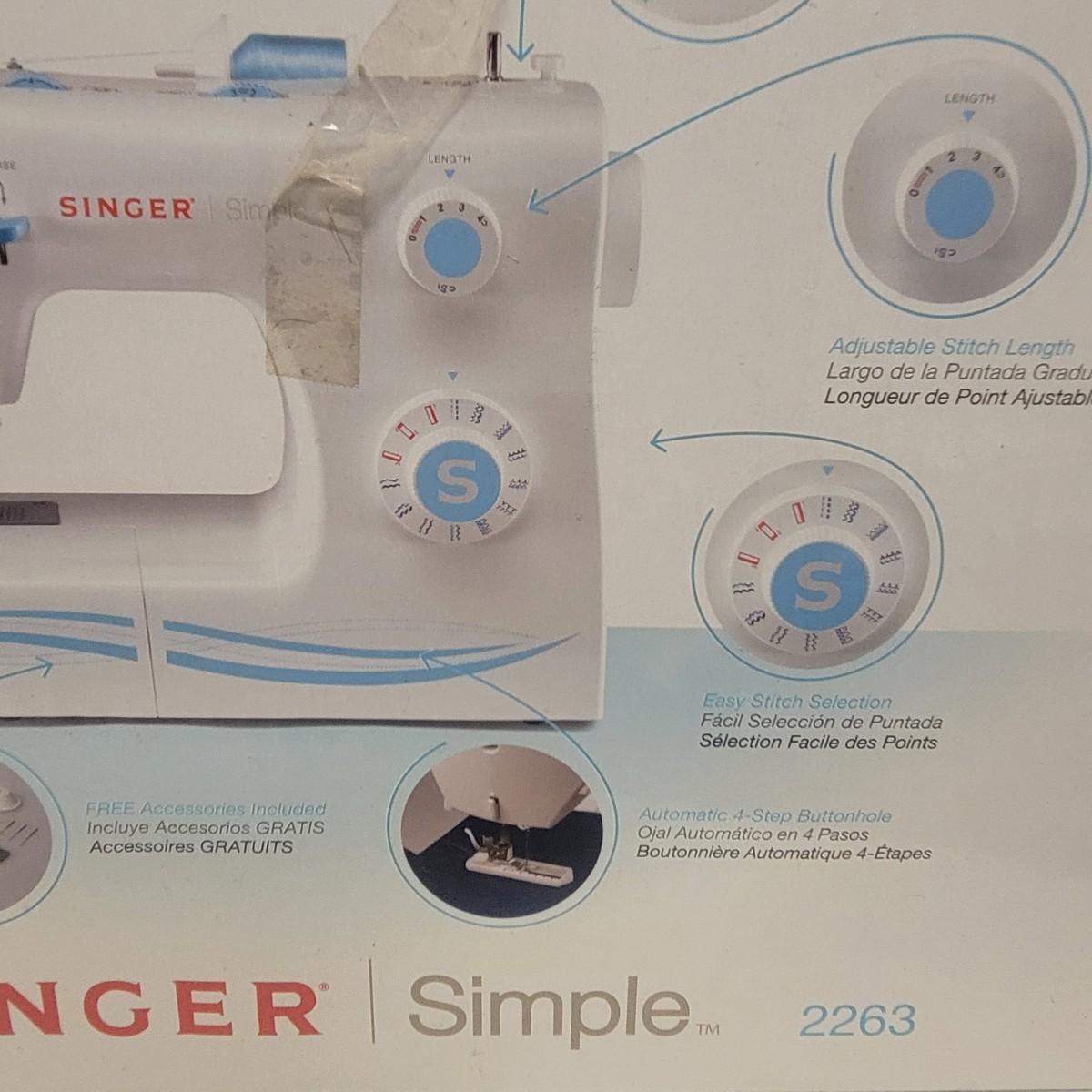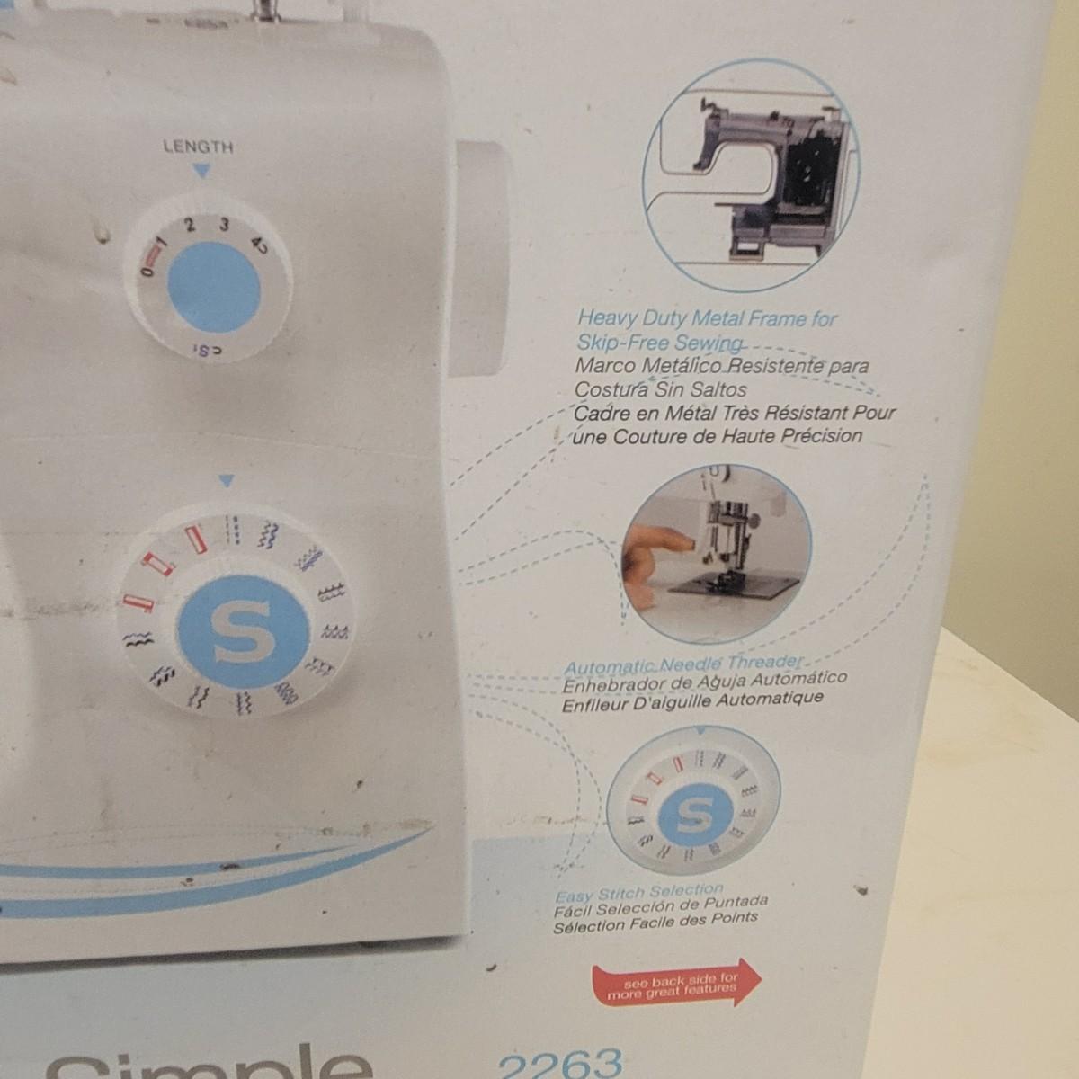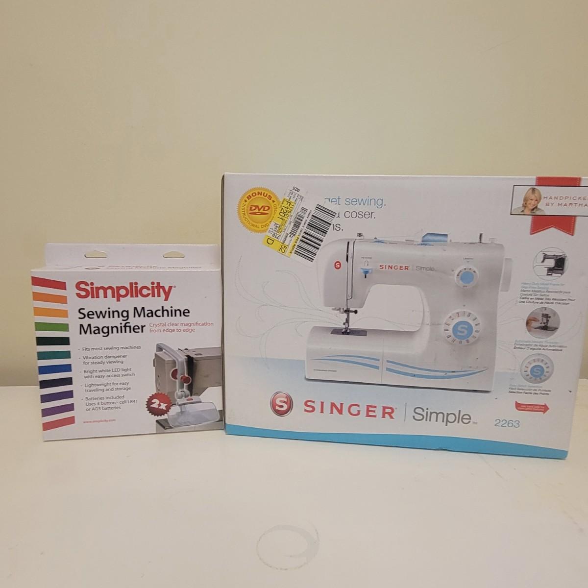 Singer Simple sewing machine 2263, new in box. Has heavy duty metal frame, automatic needle threader and easy stitch selection. Also included is a Simplicity sewing machine 2x magnifier, new in original box. Local pickup only