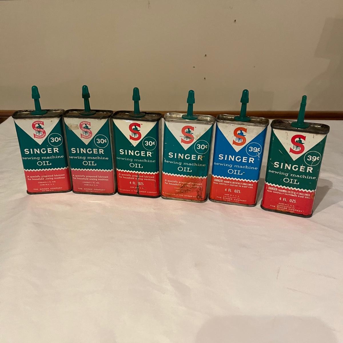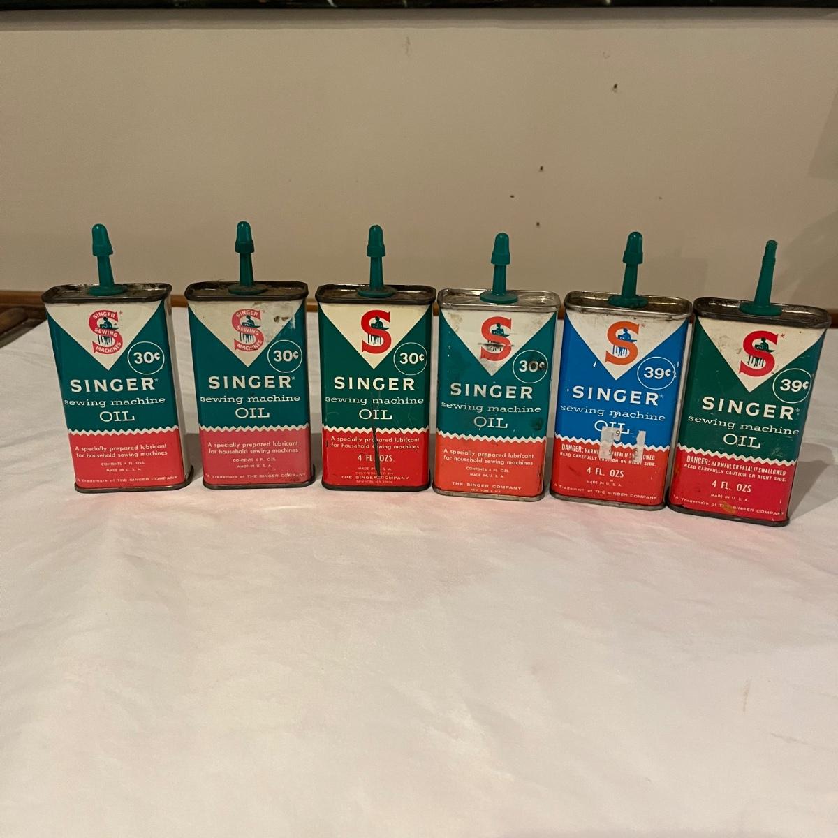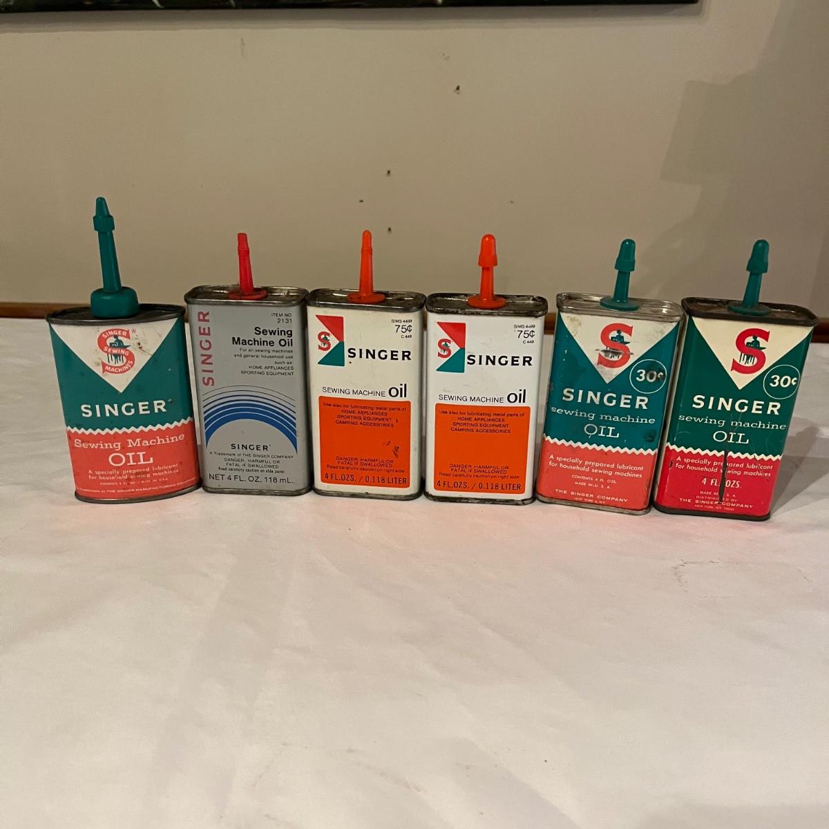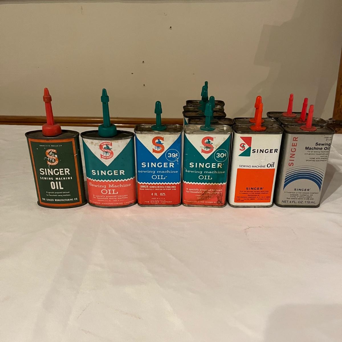 Lot contains eleven vintage cans of Singer sewing machine oil in a variety of styles. The last picture has the six cans that have oil in them.