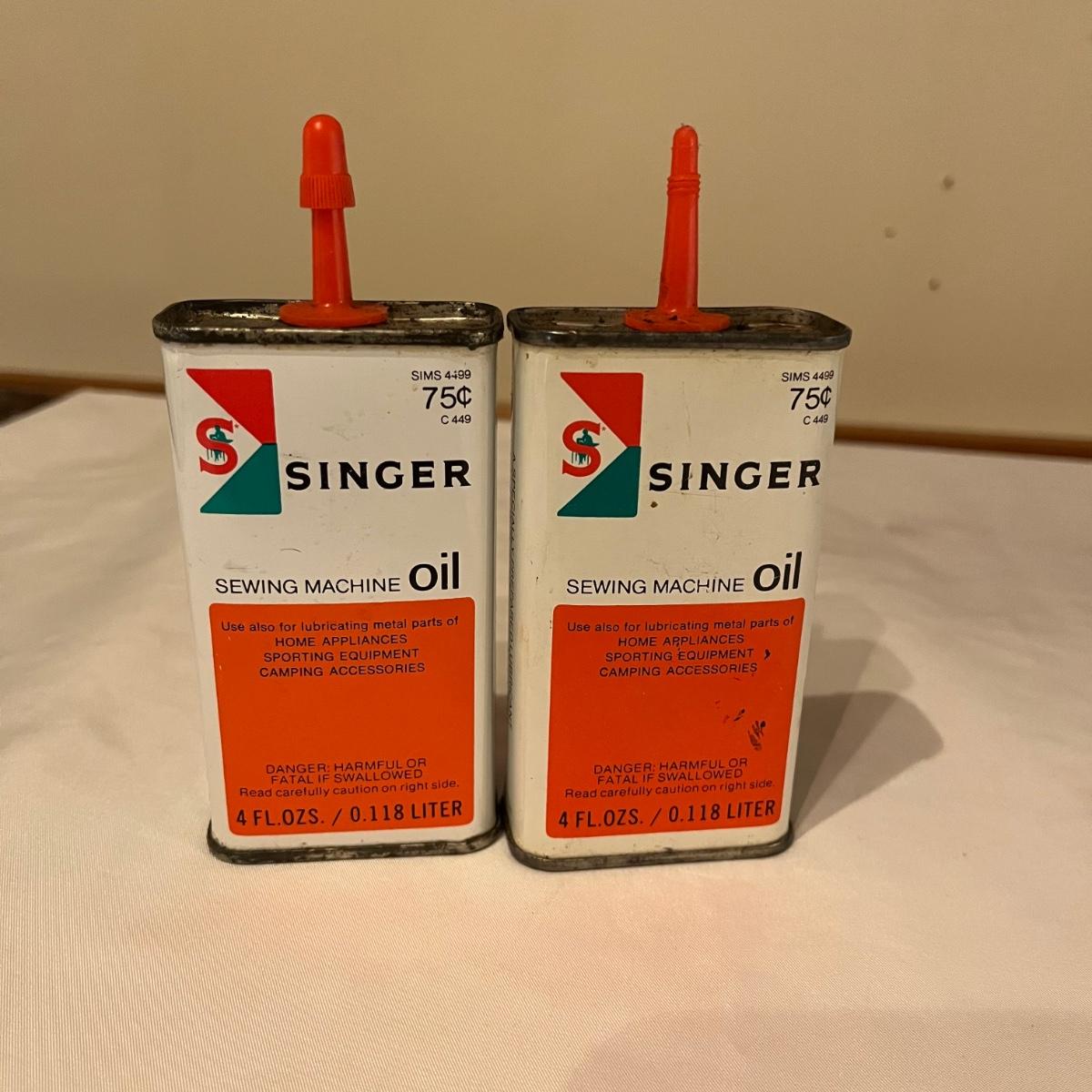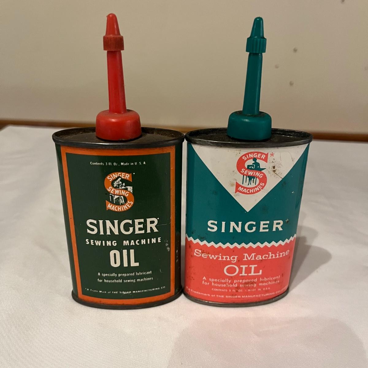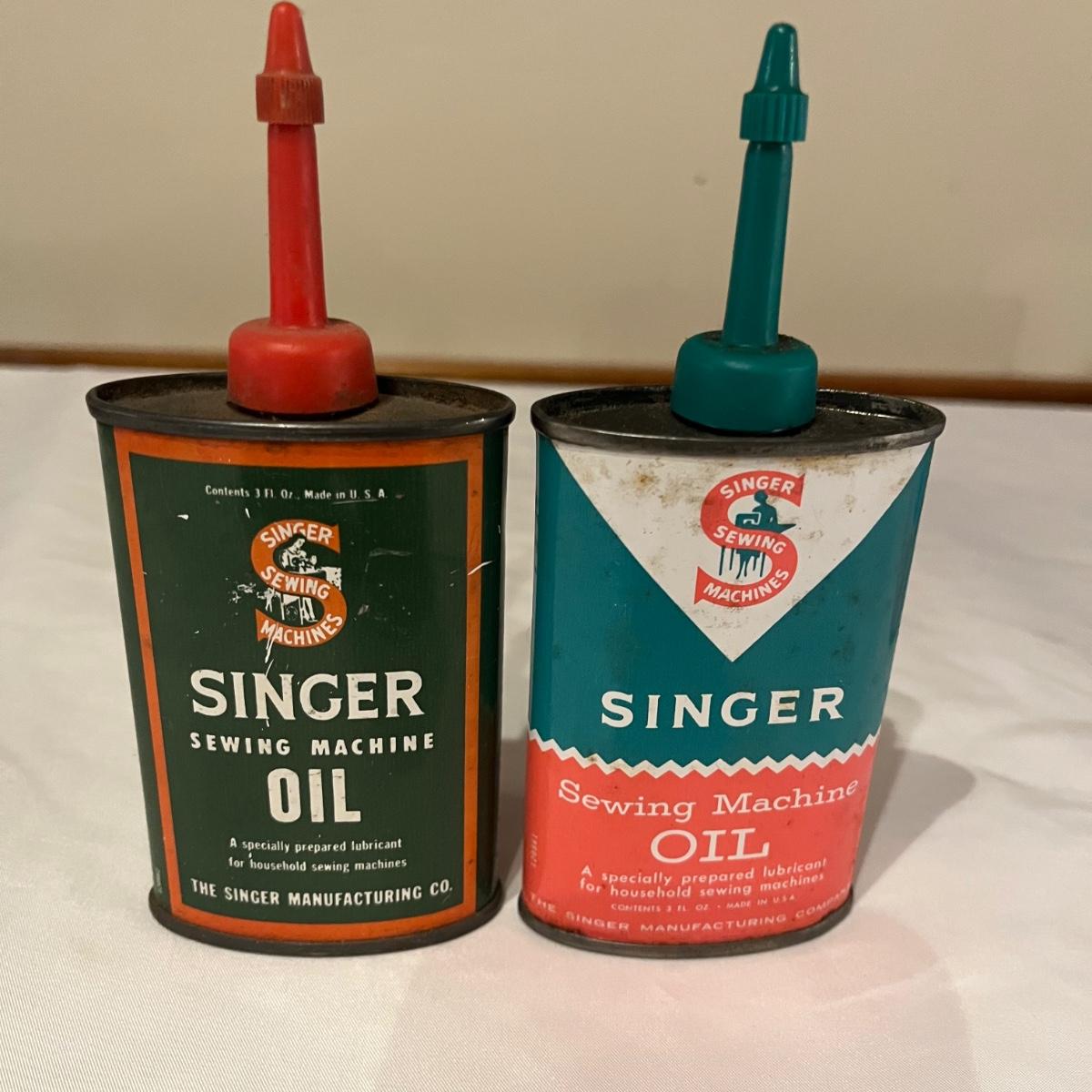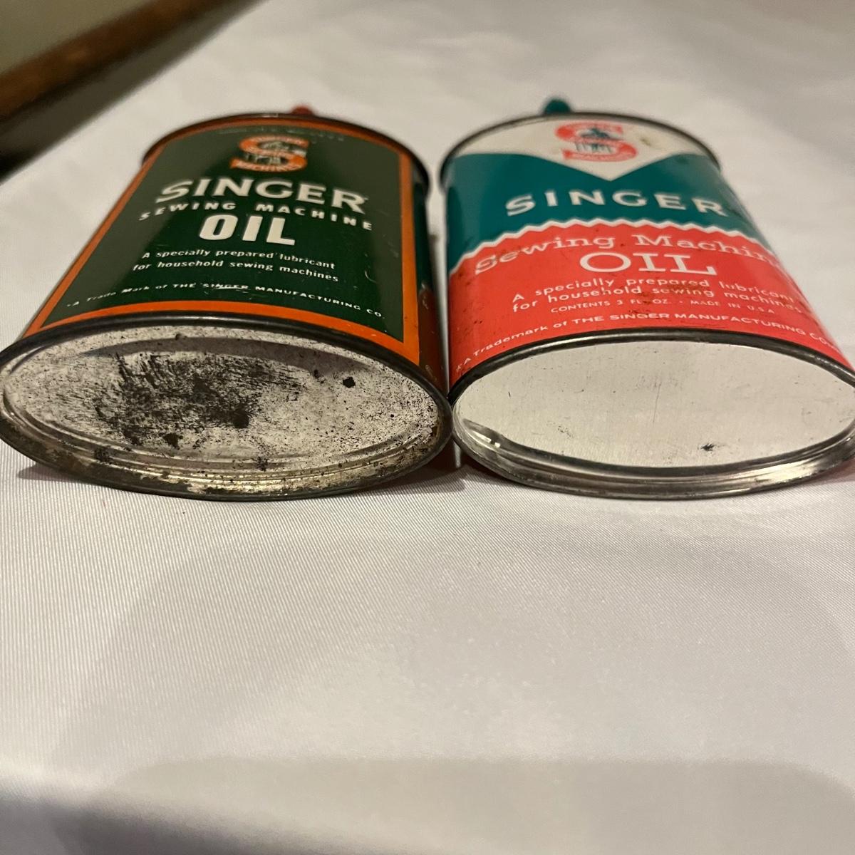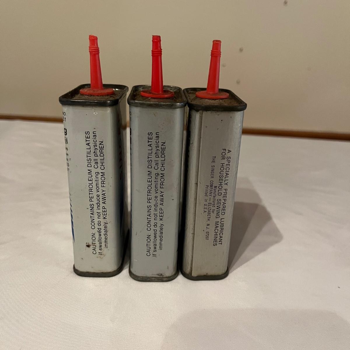 Lot contains eleven vintage cans of Singer sewing machine oil in a variety of styles. The last picture has the six cans that have oil in them.