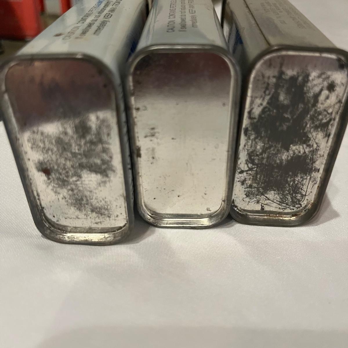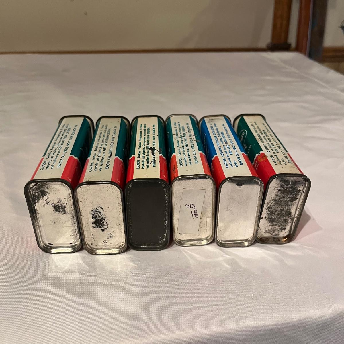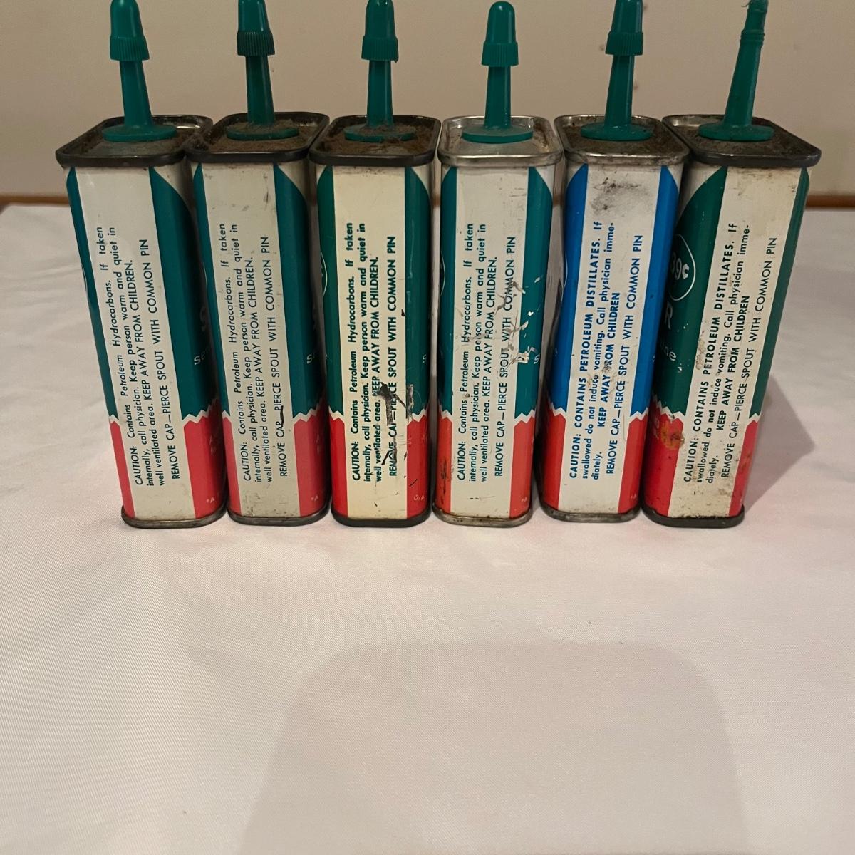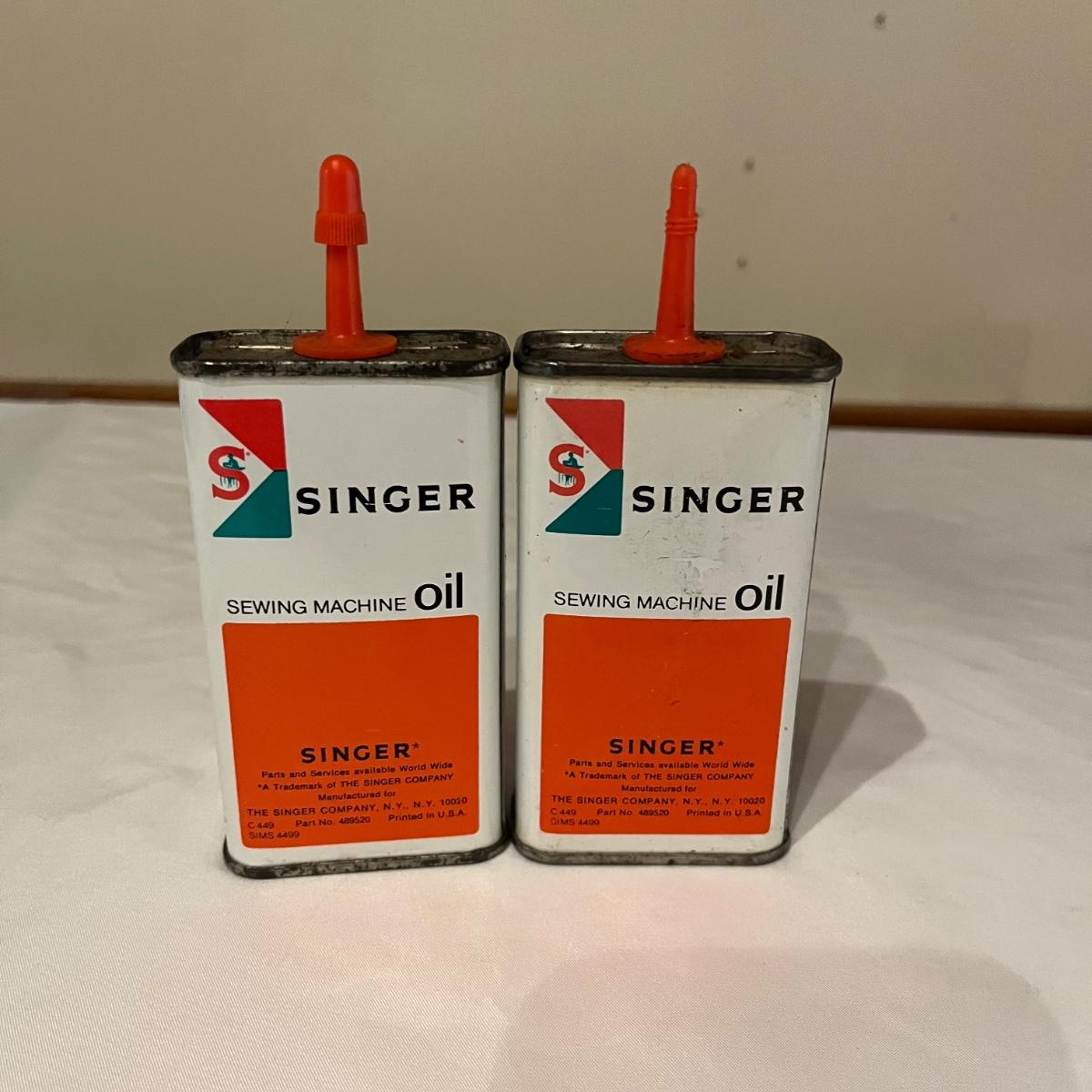 Lot contains eleven vintage cans of Singer sewing machine oil in a variety of styles. The last picture has the six cans that have oil in them.