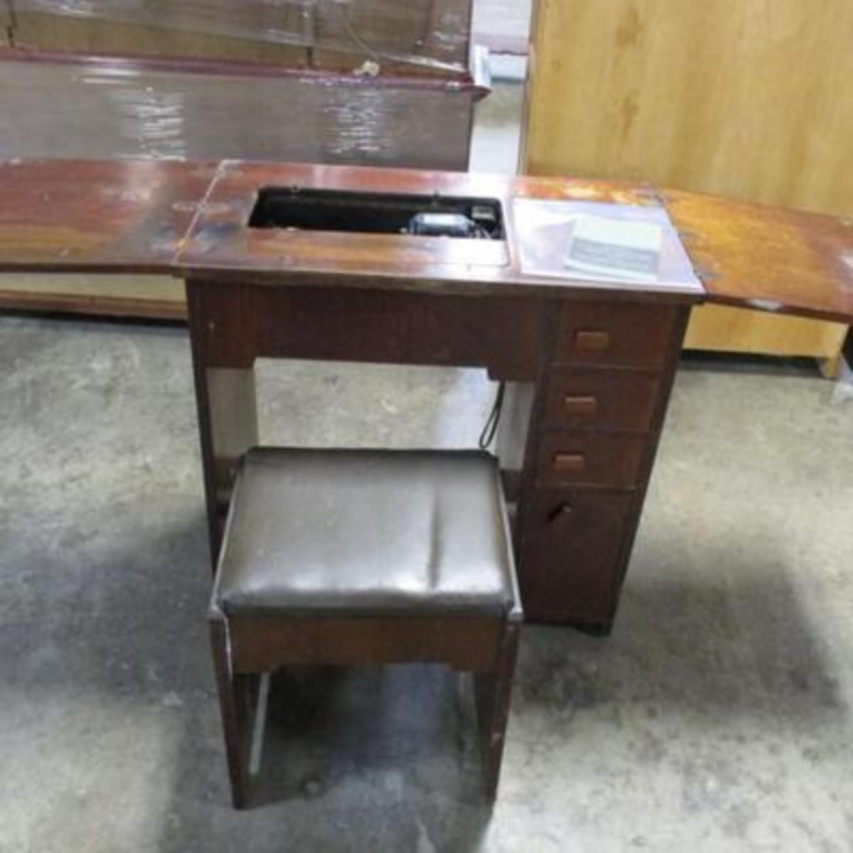 Vintage Singer Sewing Machine Table With Stool & Student's Manual Of Machine Sewing