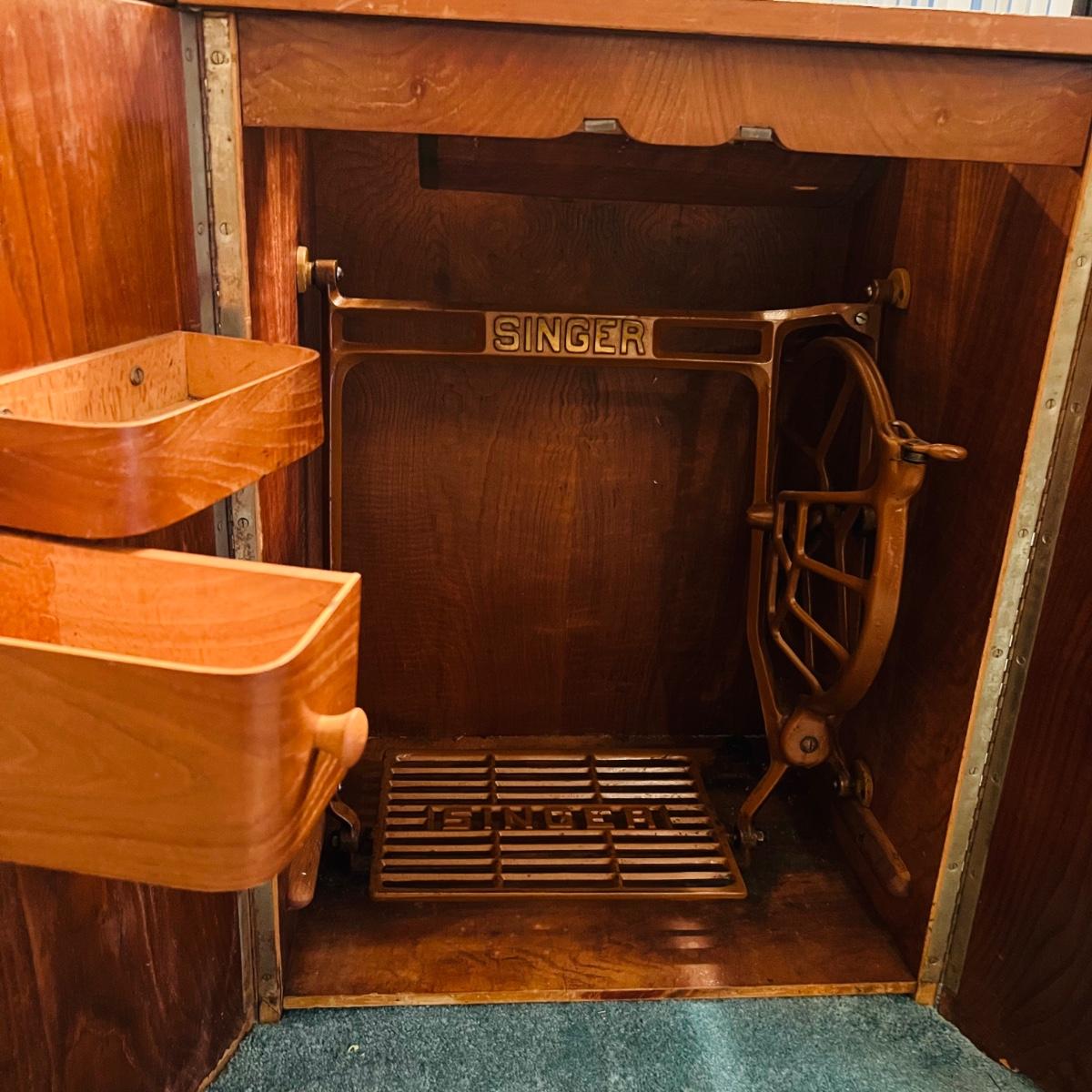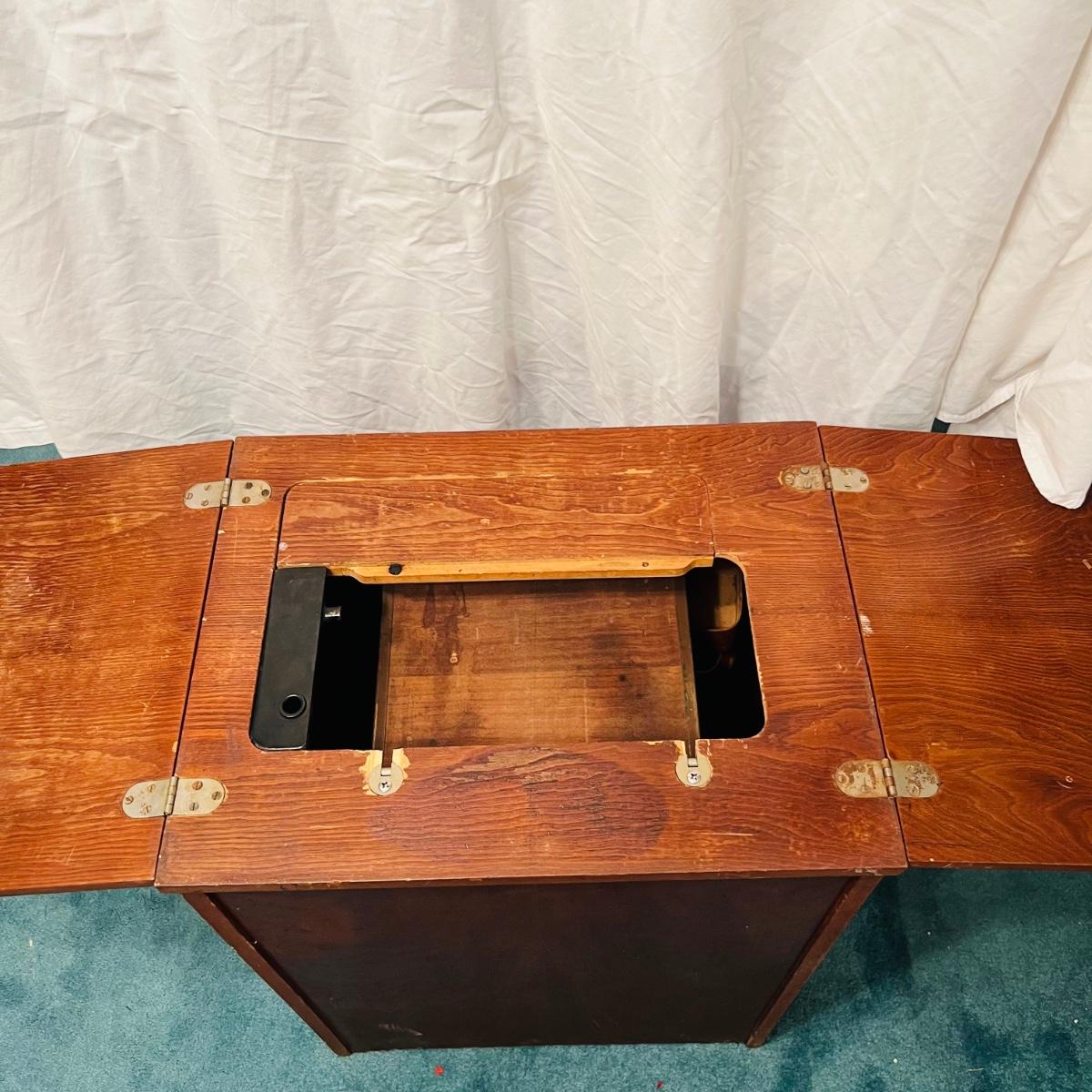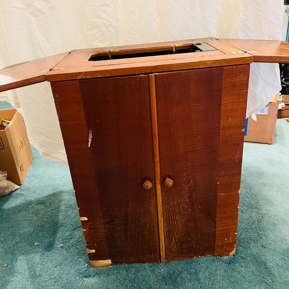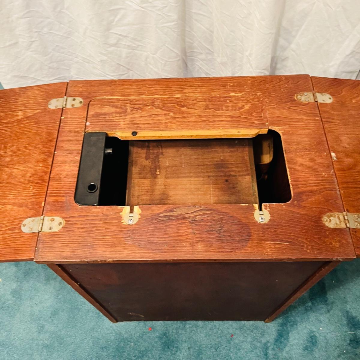 Wood Singer sewing table measures 22”L x 17”W x 30”H. Metal wheel and pedal move smoothly. Some chipping on lower left cabinet front but piece is very sturdy and in very good condition. Please bring help to load on pickup day.