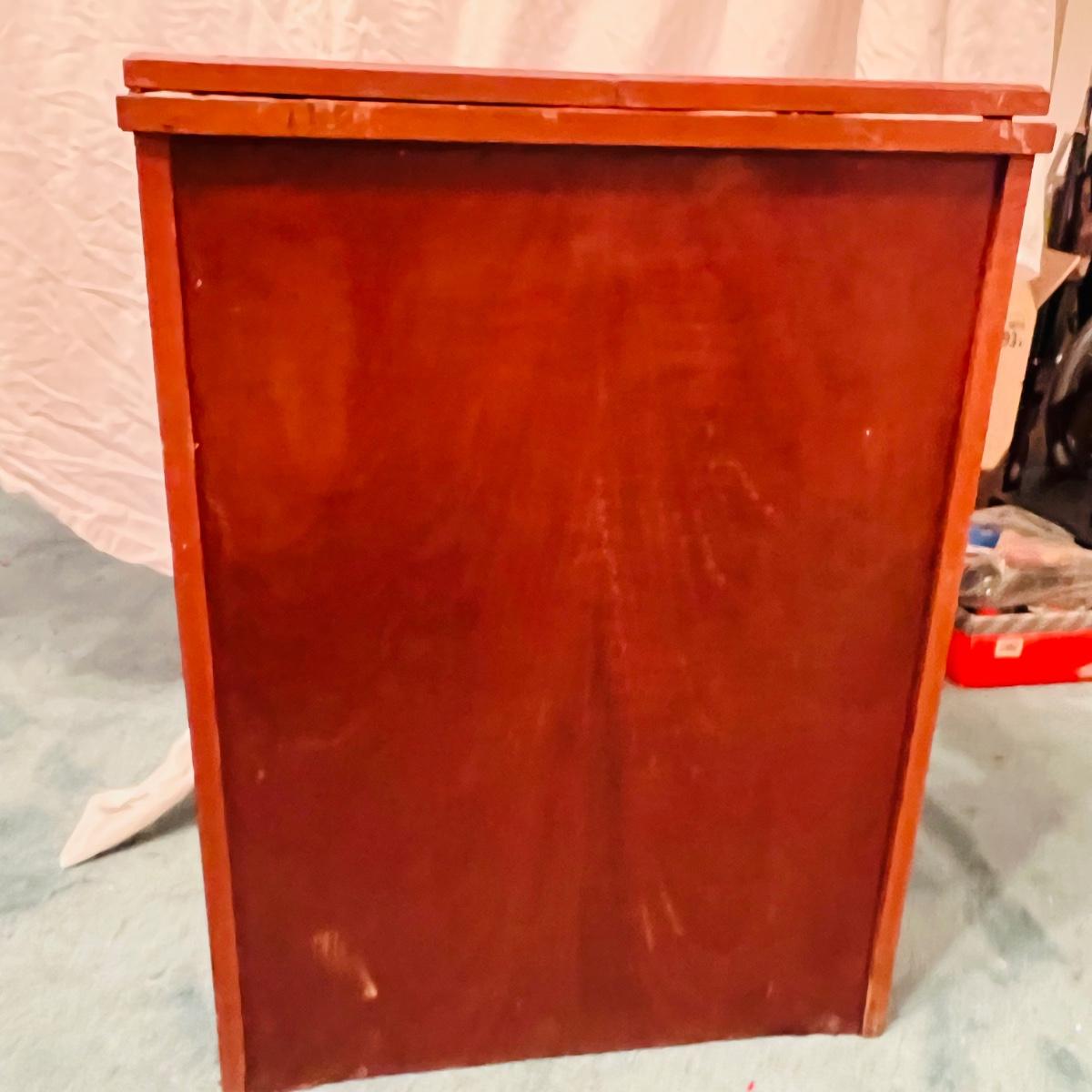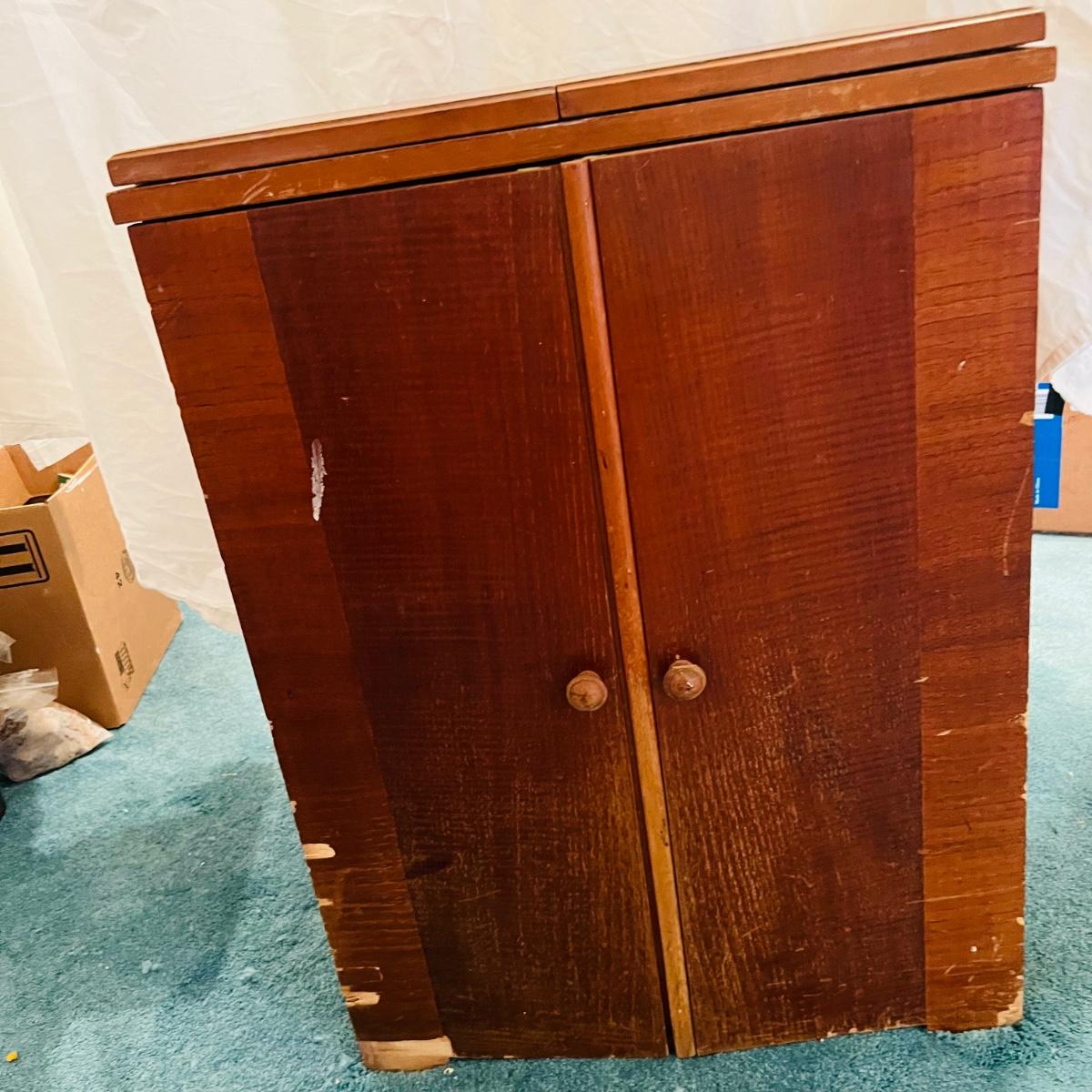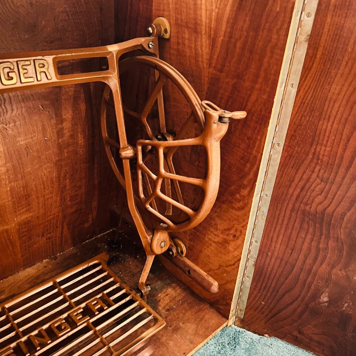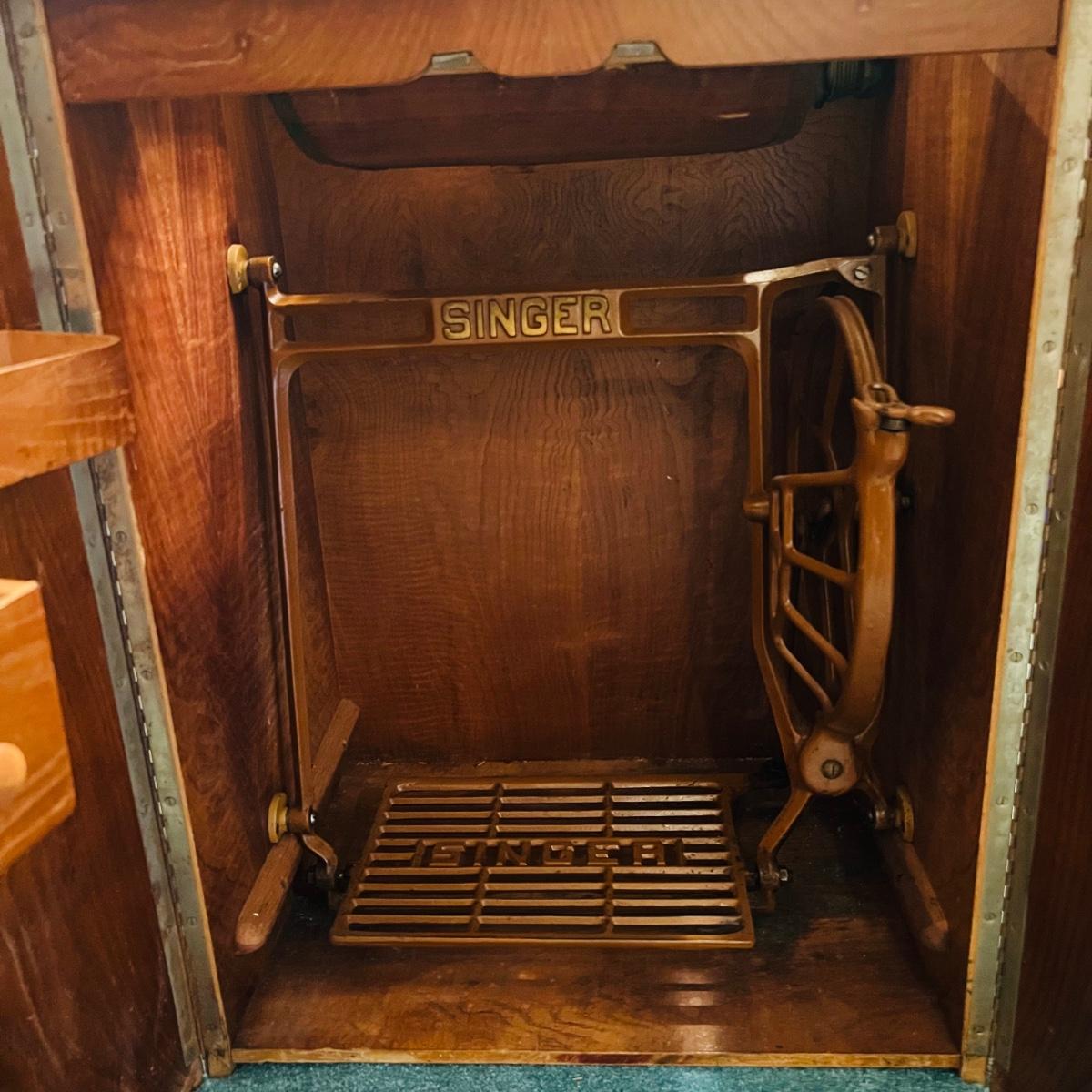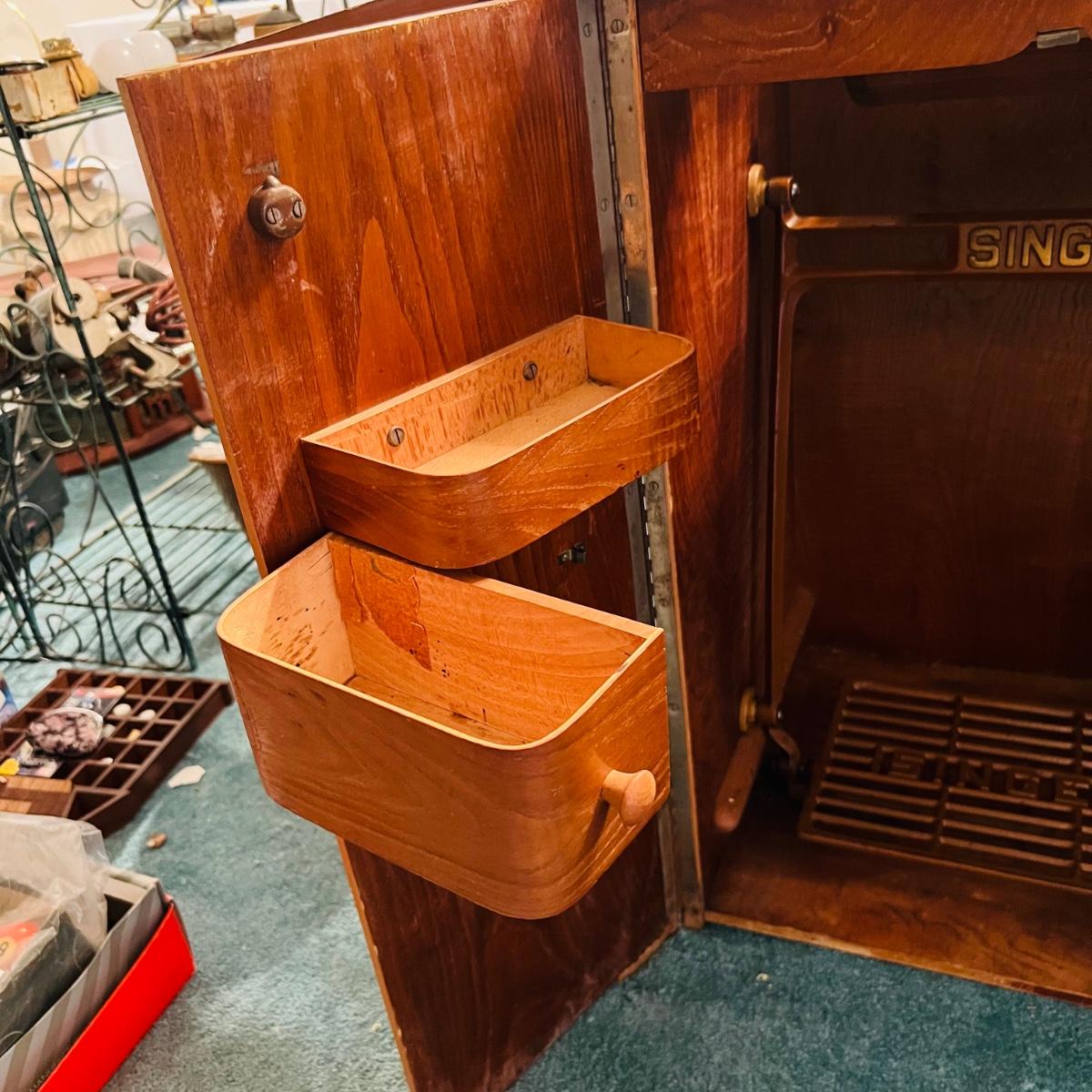 Wood Singer sewing table measures 22”L x 17”W x 30”H. Metal wheel and pedal move smoothly. Some chipping on lower left cabinet front but piece is very sturdy and in very good condition. Please bring help to load on pickup day.