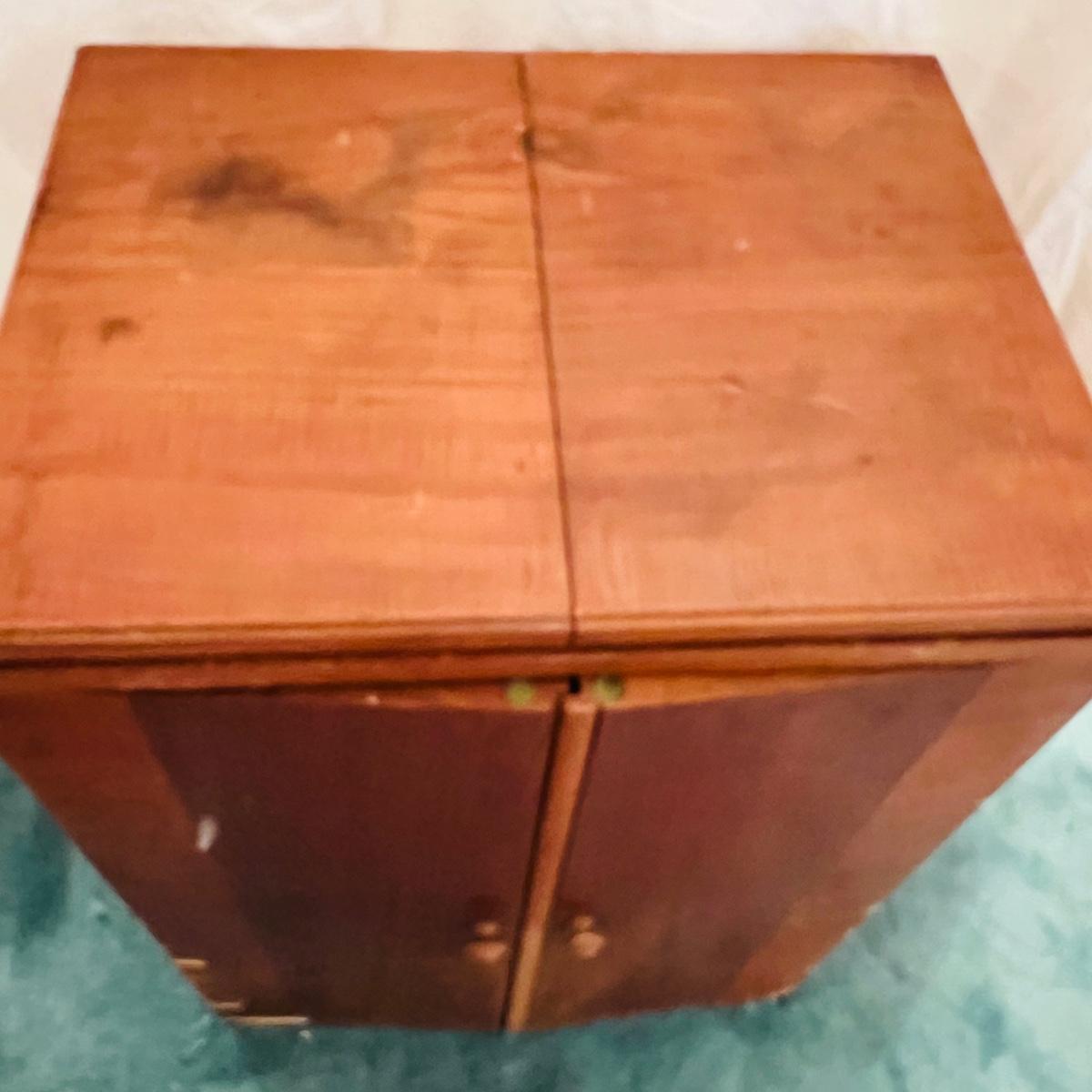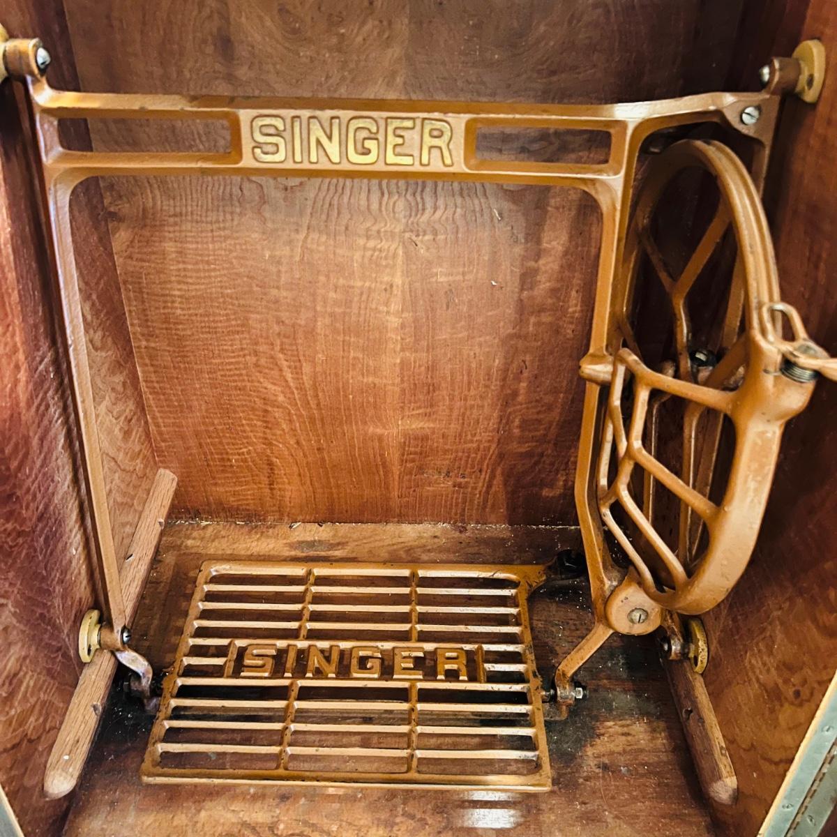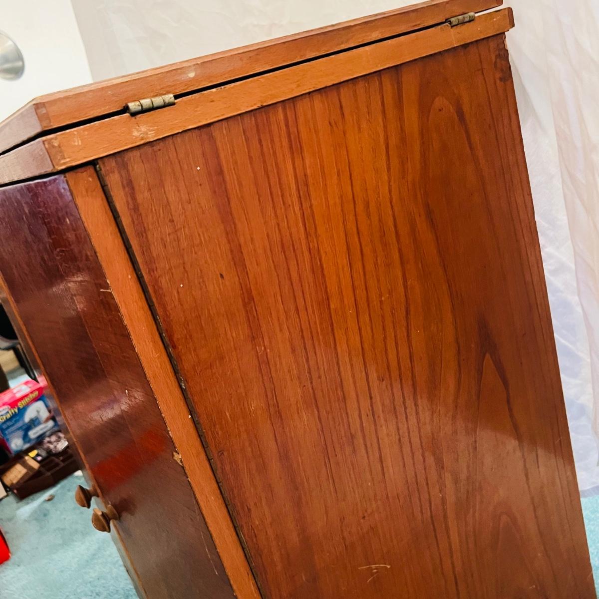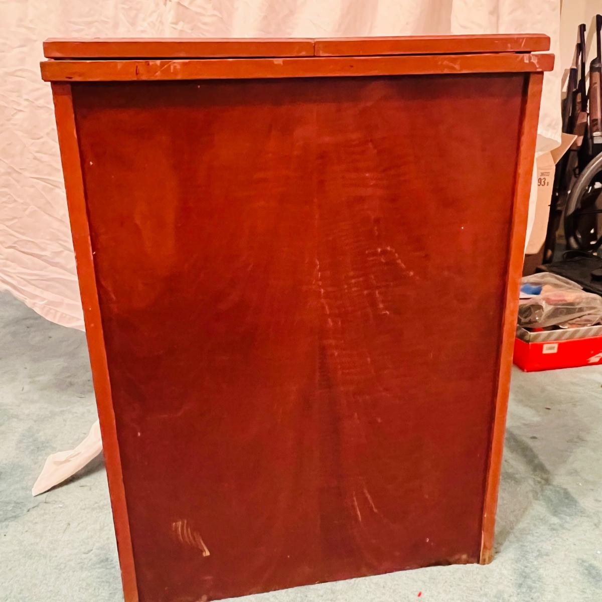 Wood Singer sewing table measures 22”L x 17”W x 30”H. Metal wheel and pedal move smoothly. Some chipping on lower left cabinet front but piece is very sturdy and in very good condition. Please bring help to load on pickup day.