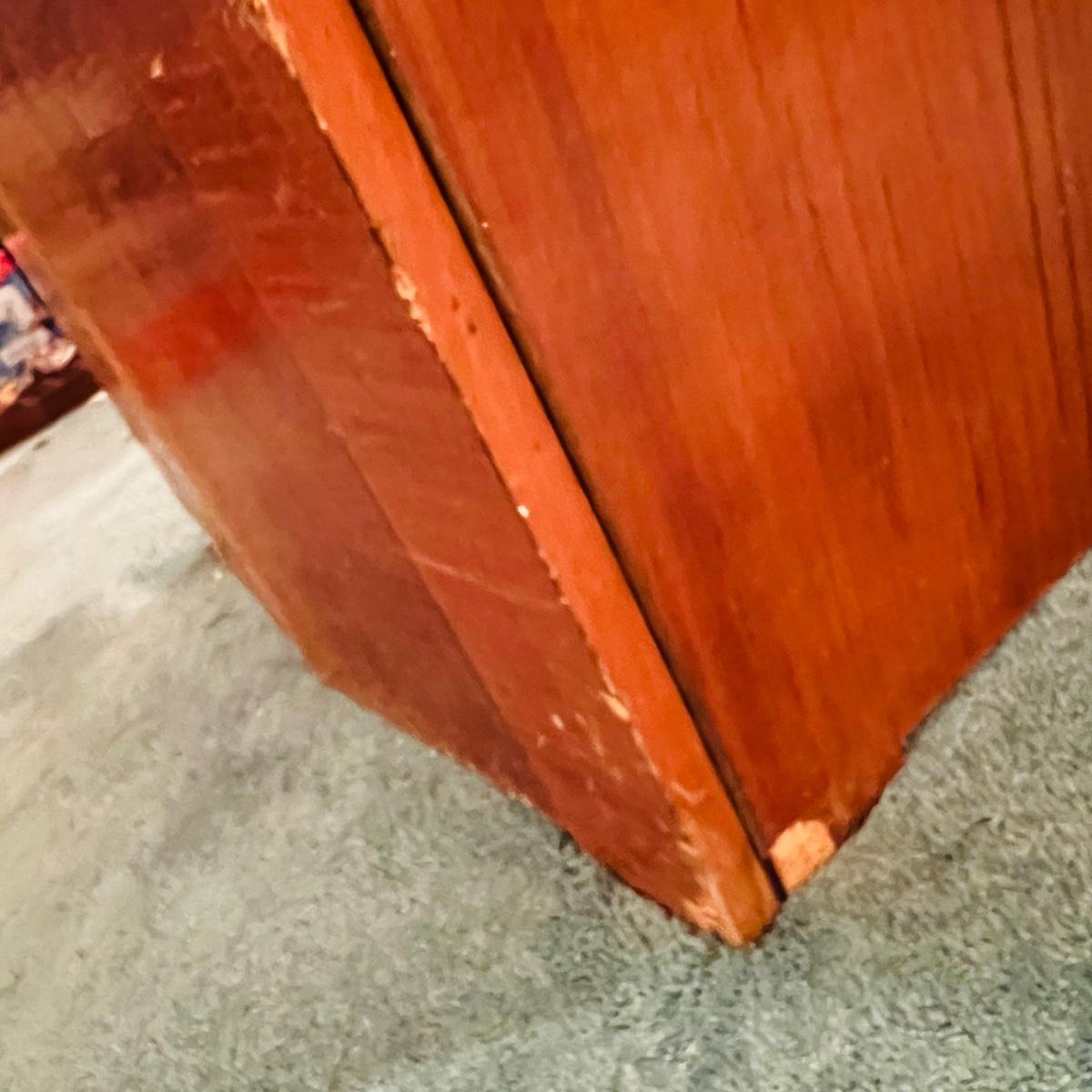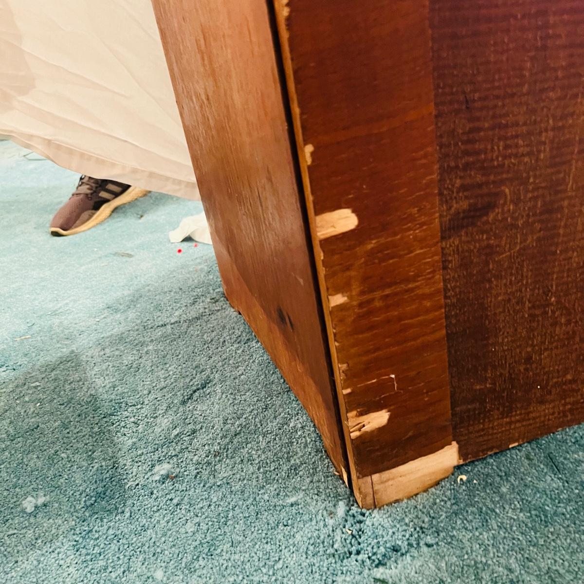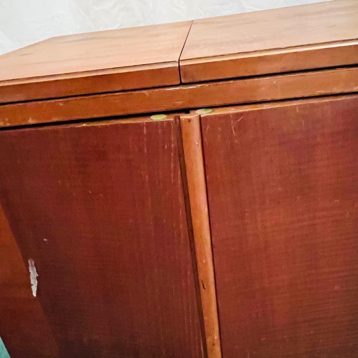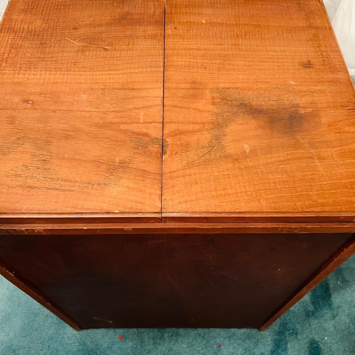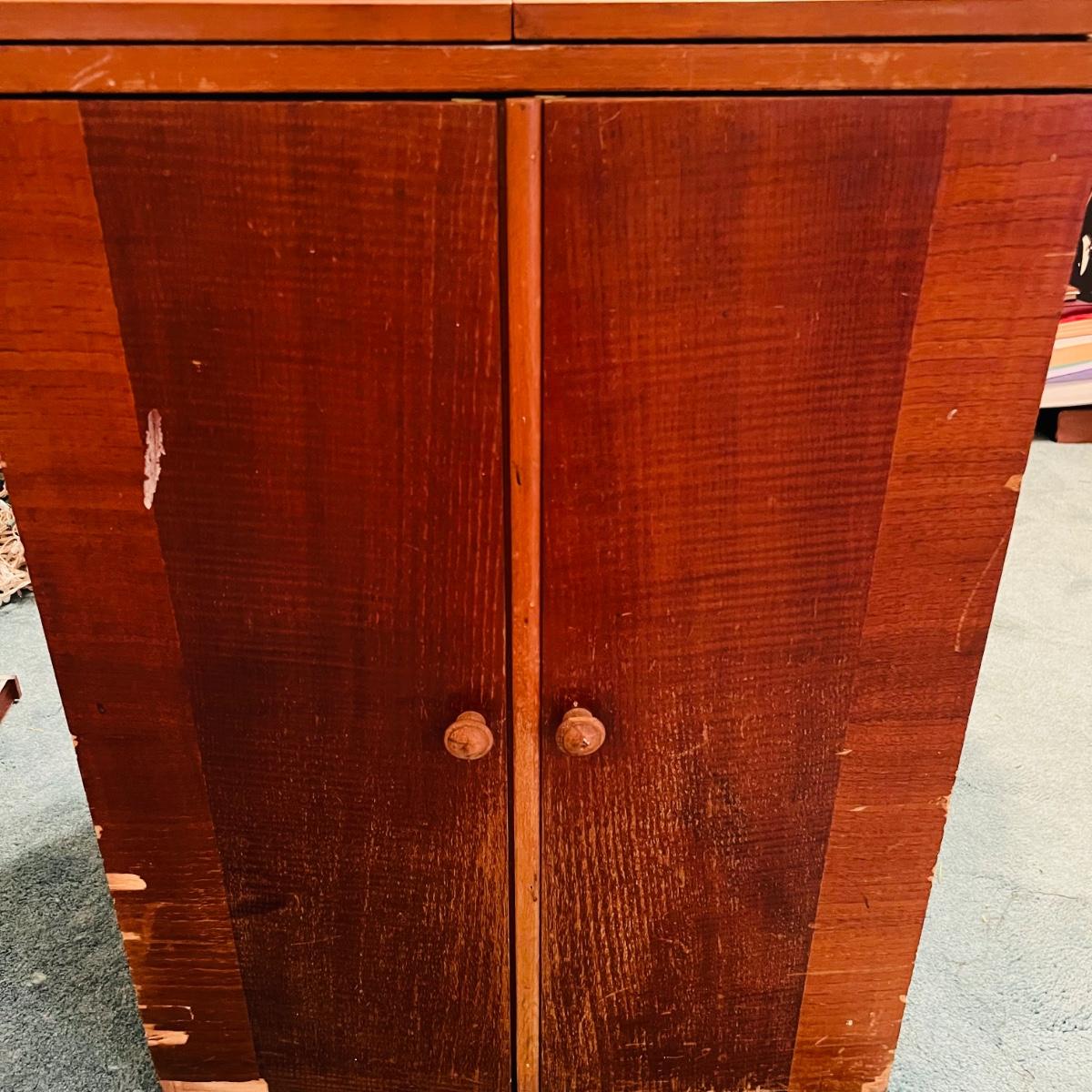 Wood Singer sewing table measures 22”L x 17”W x 30”H. Metal wheel and pedal move smoothly. Some chipping on lower left cabinet front but piece is very sturdy and in very good condition. Please bring help to load on pickup day.