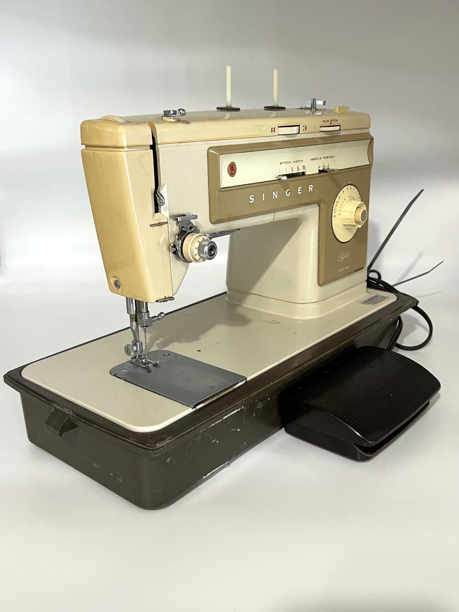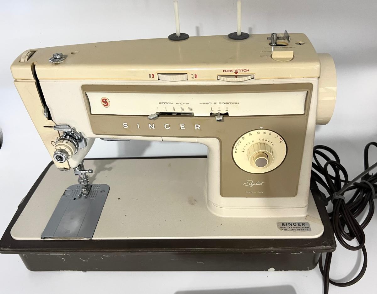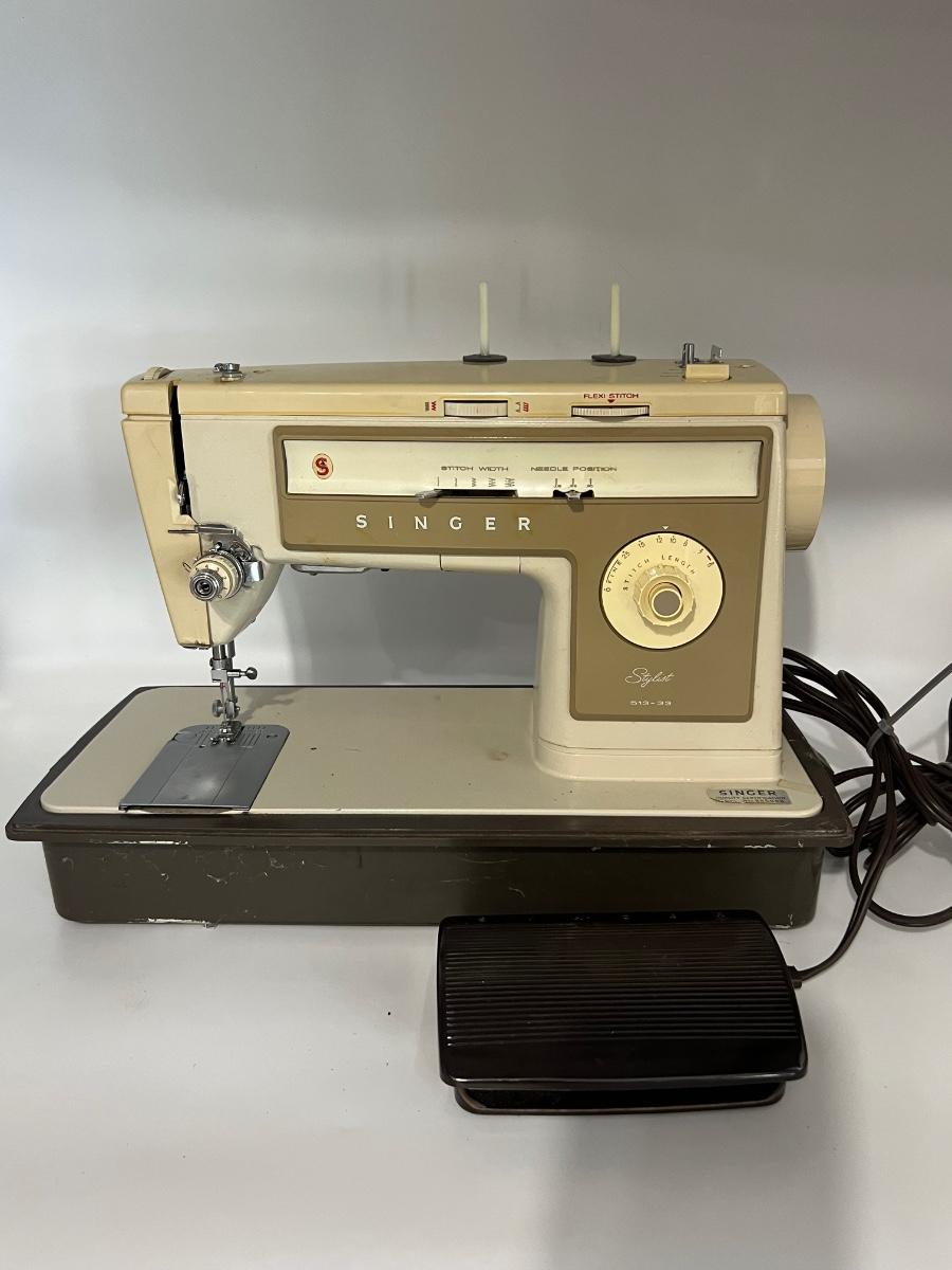 SINGER Stylist 513-33with case. Light comes on, foot petal engages the needle to move up and down. Cover Latches on both sides. Measures in case 16 inches tall 17 1/2 inches long, 8 inches deep.