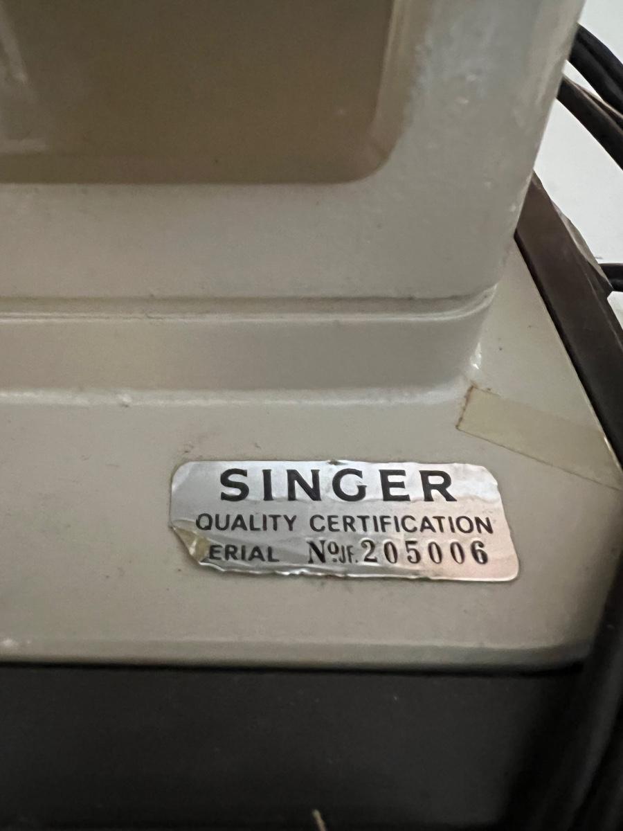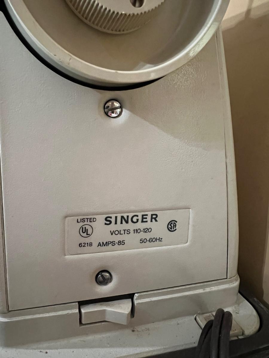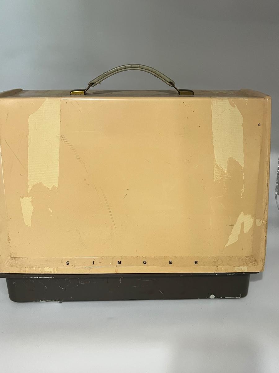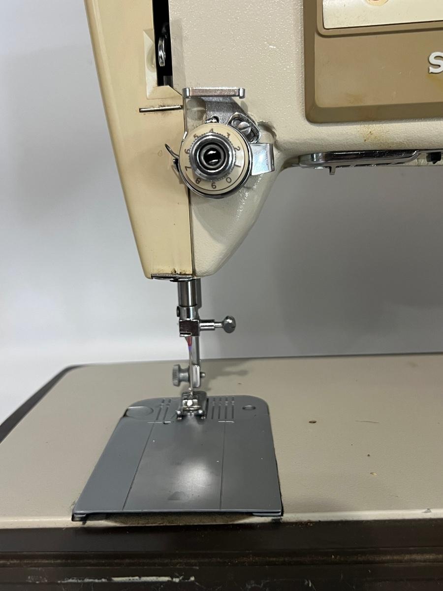 SINGER Stylist 513-33with case. Light comes on, foot petal engages the needle to move up and down. Cover Latches on both sides. Measures in case 16 inches tall 17 1/2 inches long, 8 inches deep.