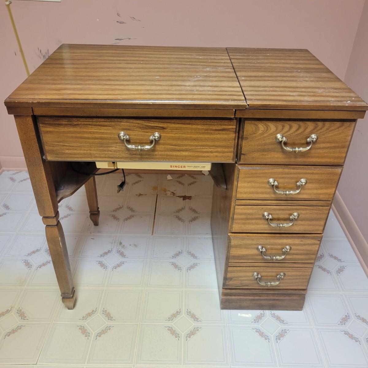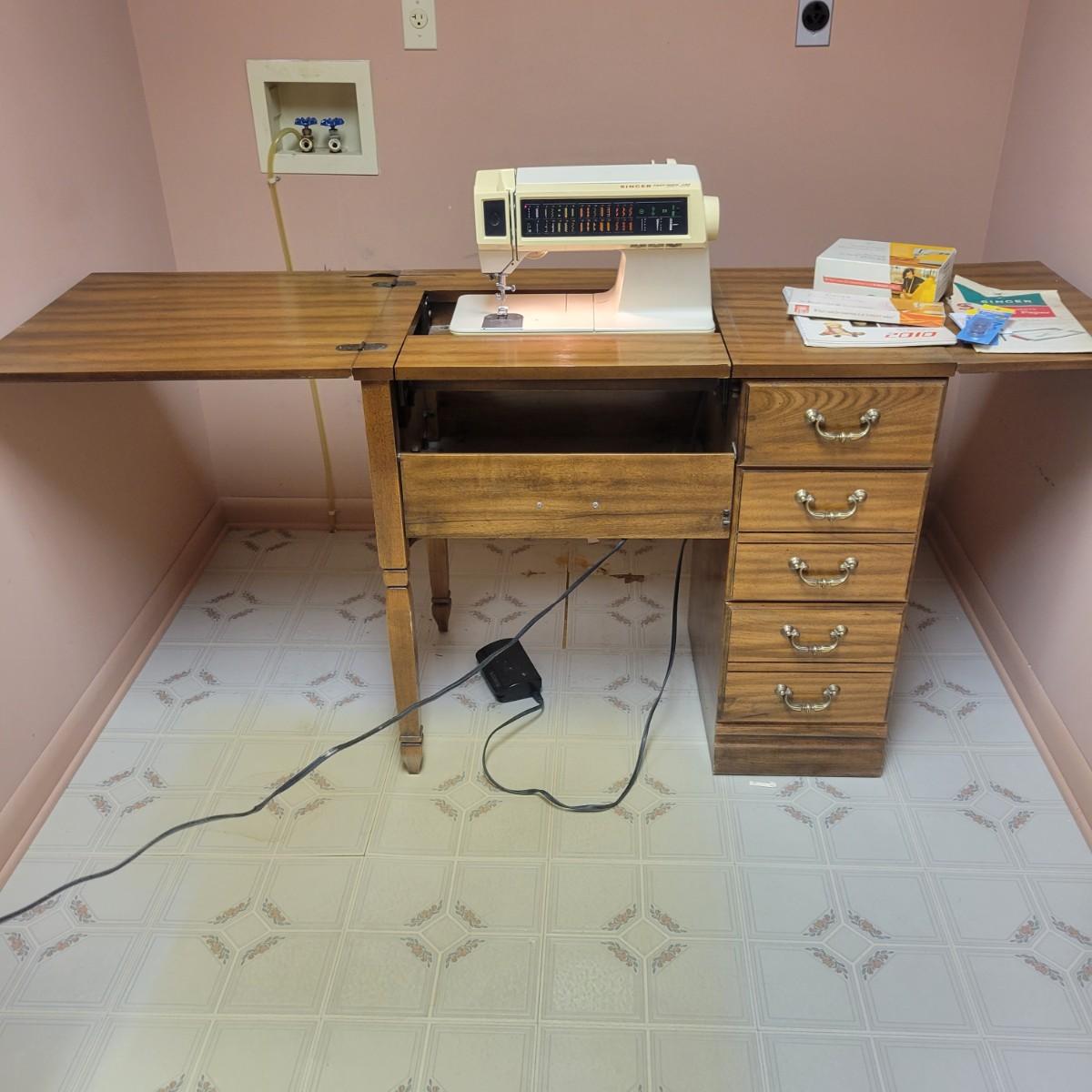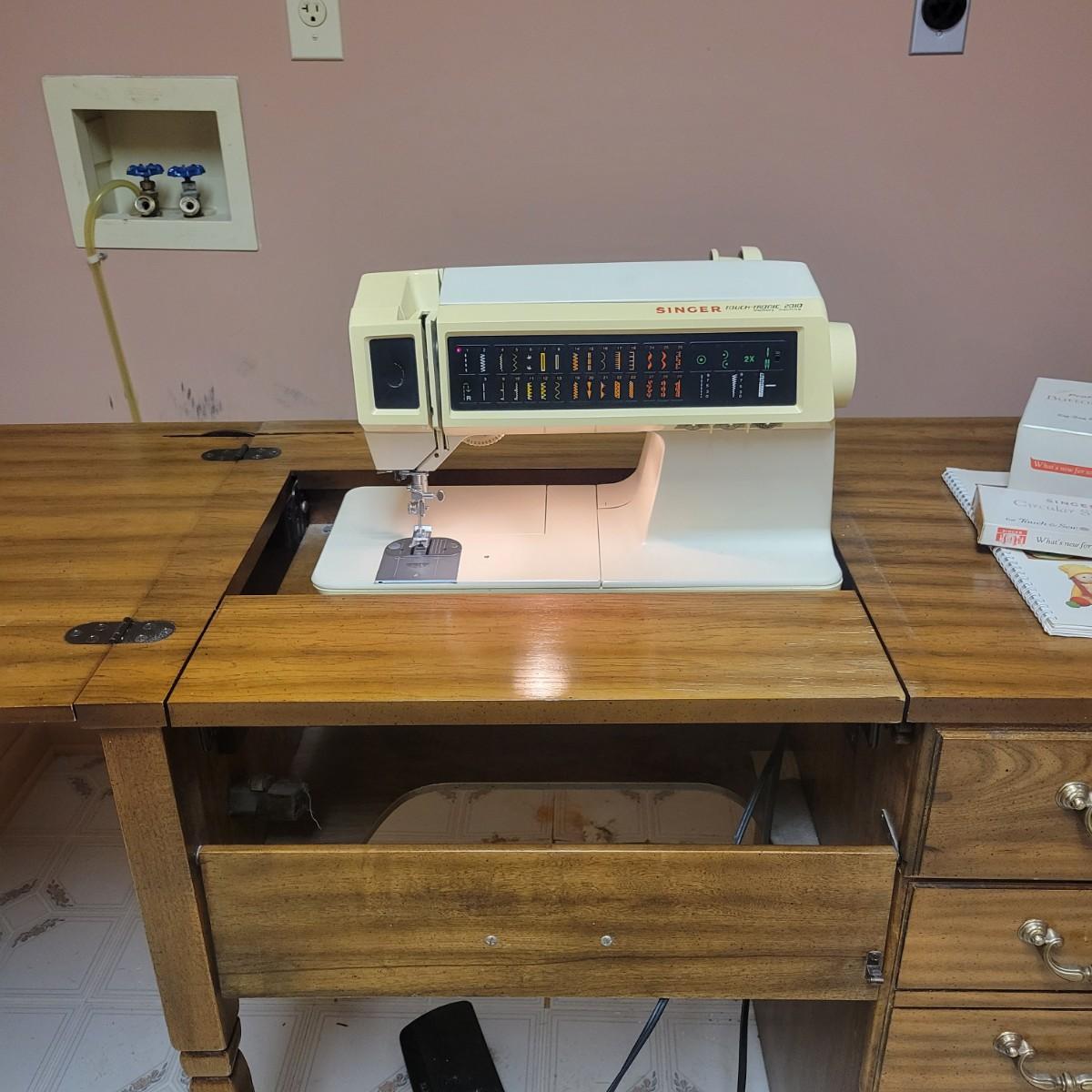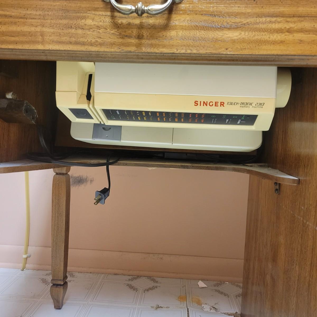 A Singer Touch-Tronic 2010 sewing machine in good condition with no notable damage. Machine was tested and works. Also includes Singer Button holer, Circular stitcher, bobbins, original manual and dressmaker's tracing paper. Sewing table is solid wood and does have some of its finish peeling on the closed table top. It has three drawers and folds up for a small footprint when not in use. With the table expanded the table measures approximately 69" x 20.5" x 41" including the sewing machine height. Table measures approximately 34.5" x 20.5" x 32". Local pickup only