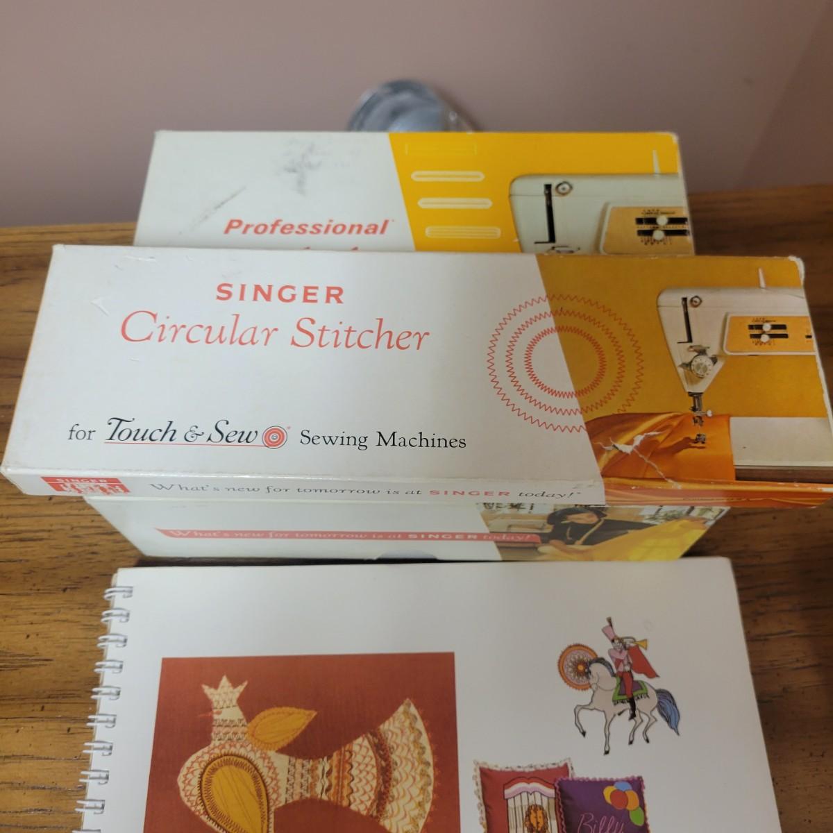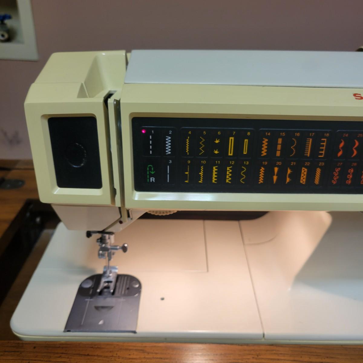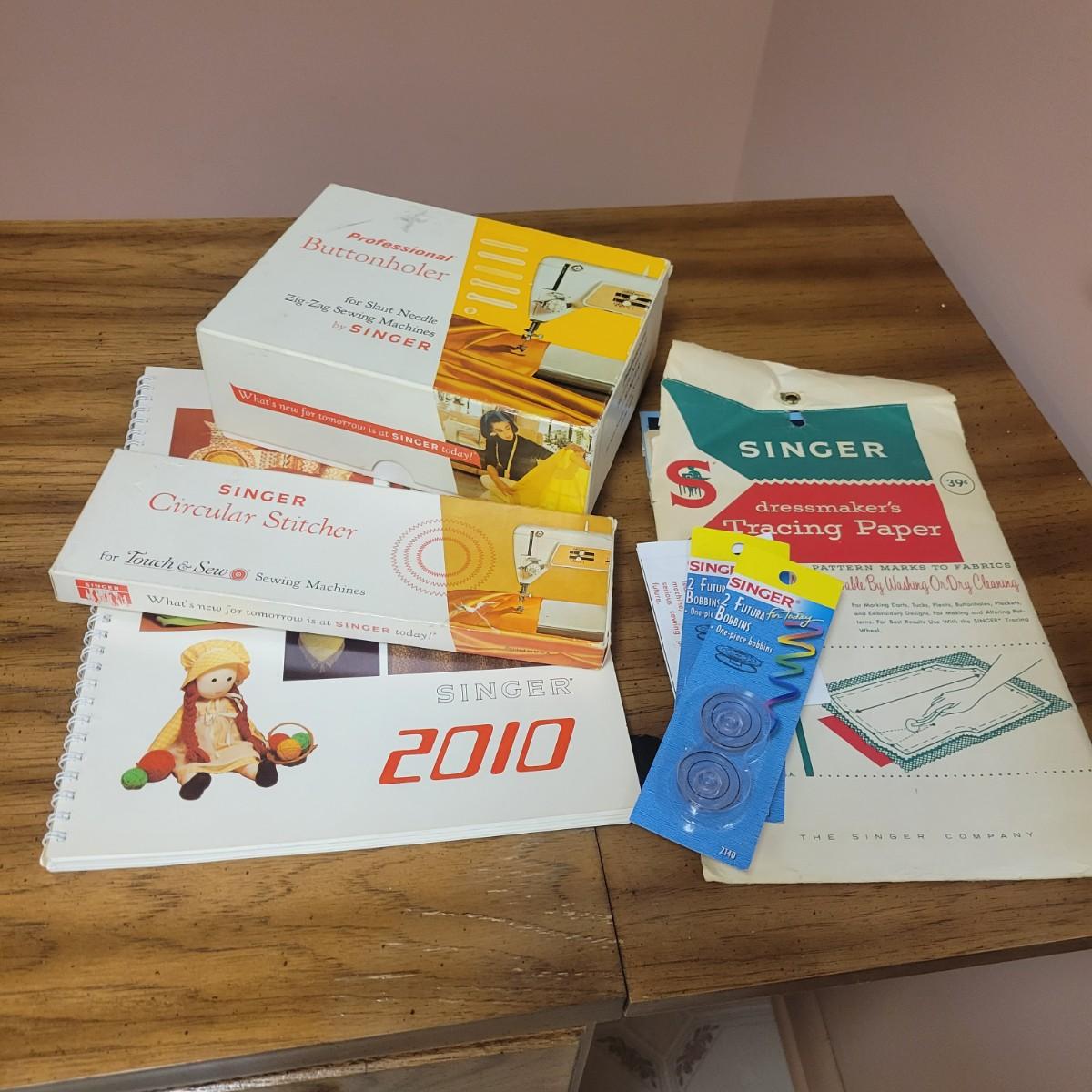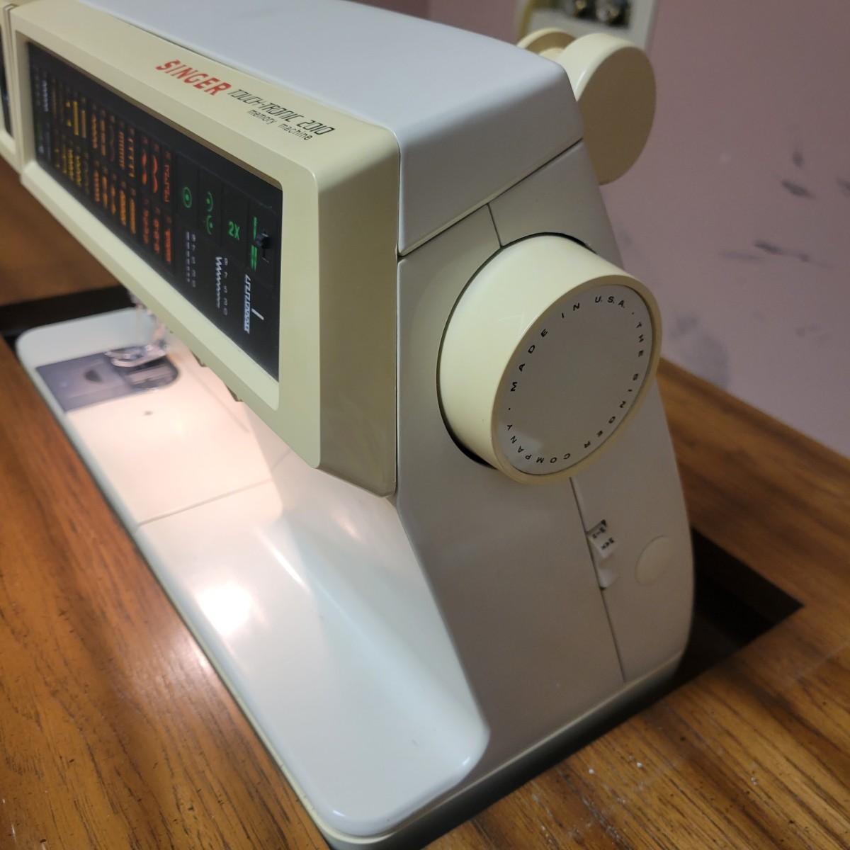 A Singer Touch-Tronic 2010 sewing machine in good condition with no notable damage. Machine was tested and works. Also includes Singer Button holer, Circular stitcher, bobbins, original manual and dressmaker's tracing paper. Sewing table is solid wood and does have some of its finish peeling on the closed table top. It has three drawers and folds up for a small footprint when not in use. With the table expanded the table measures approximately 69" x 20.5" x 41" including the sewing machine height. Table measures approximately 34.5" x 20.5" x 32". Local pickup only