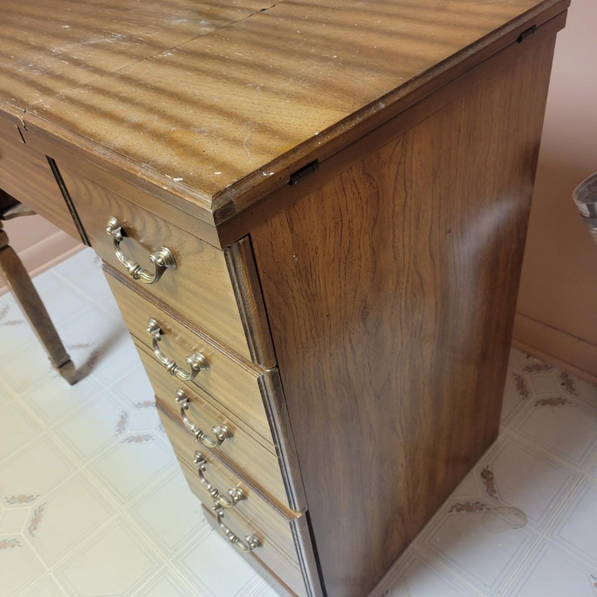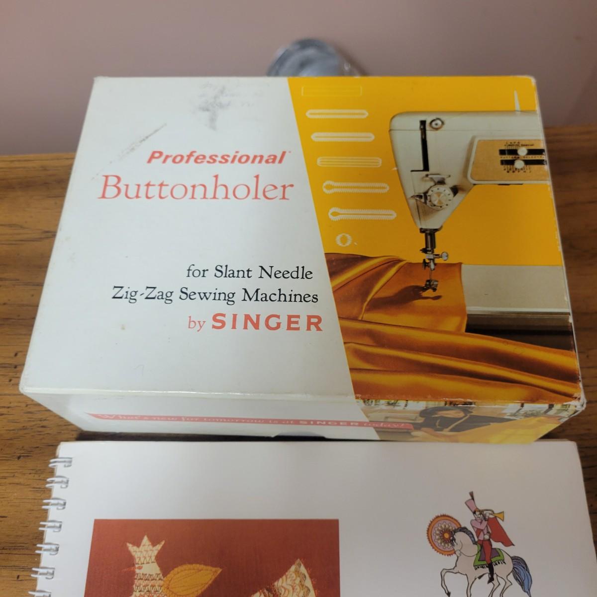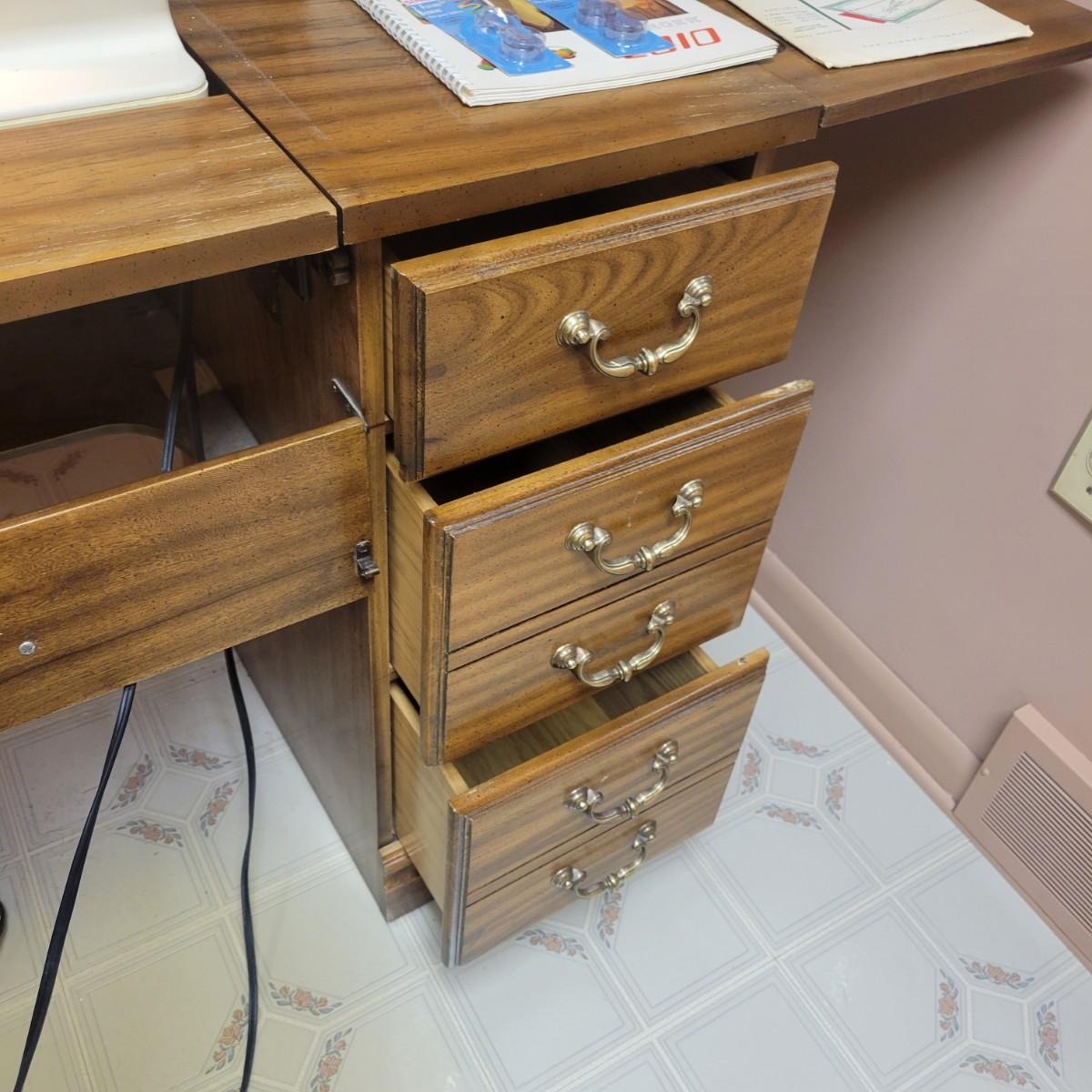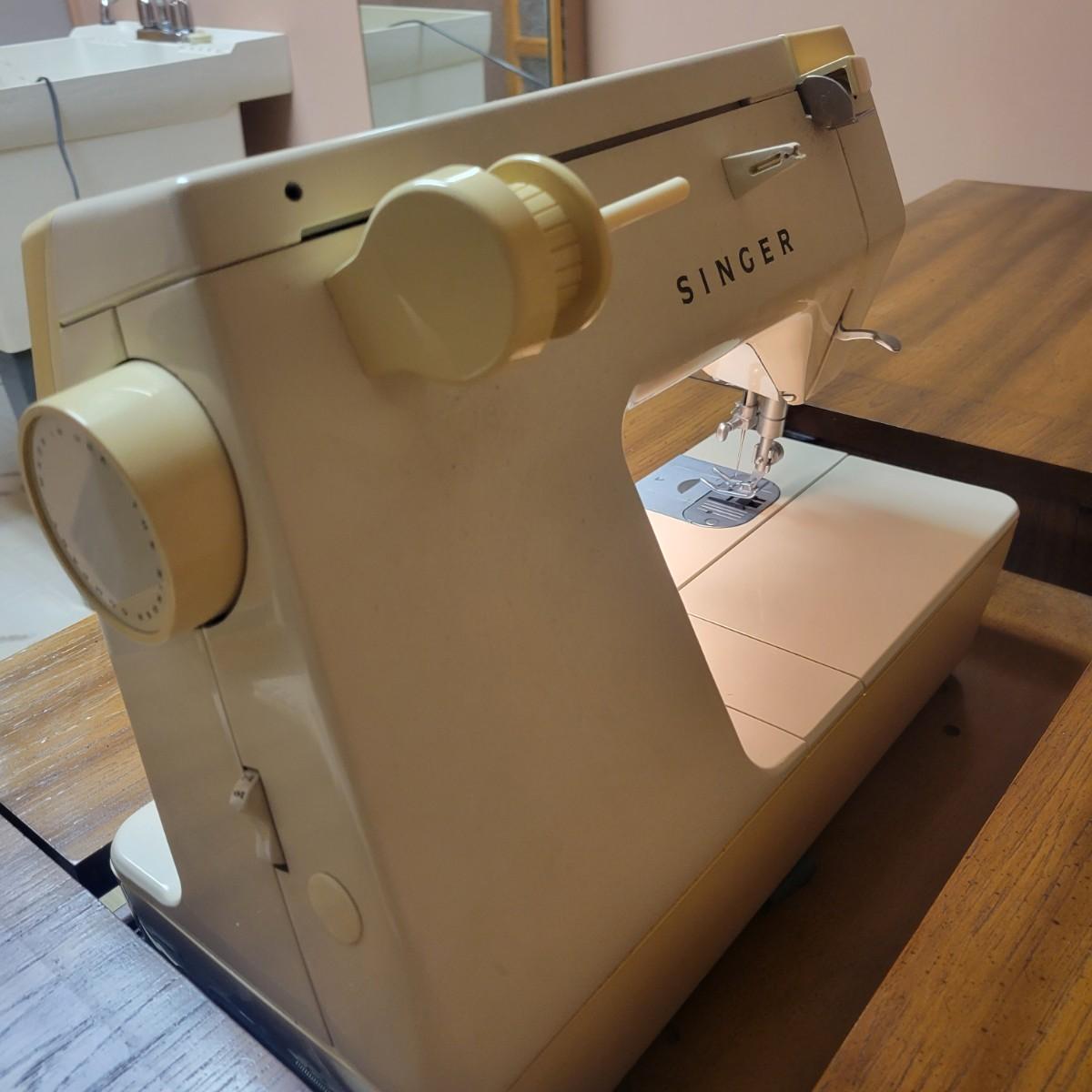 A Singer Touch-Tronic 2010 sewing machine in good condition with no notable damage. Machine was tested and works. Also includes Singer Button holer, Circular stitcher, bobbins, original manual and dressmaker's tracing paper. Sewing table is solid wood and does have some of its finish peeling on the closed table top. It has three drawers and folds up for a small footprint when not in use. With the table expanded the table measures approximately 69" x 20.5" x 41" including the sewing machine height. Table measures approximately 34.5" x 20.5" x 32". Local pickup only