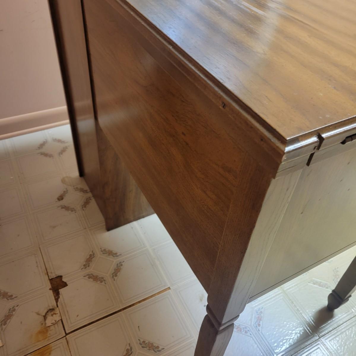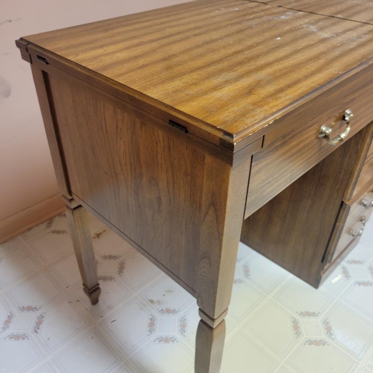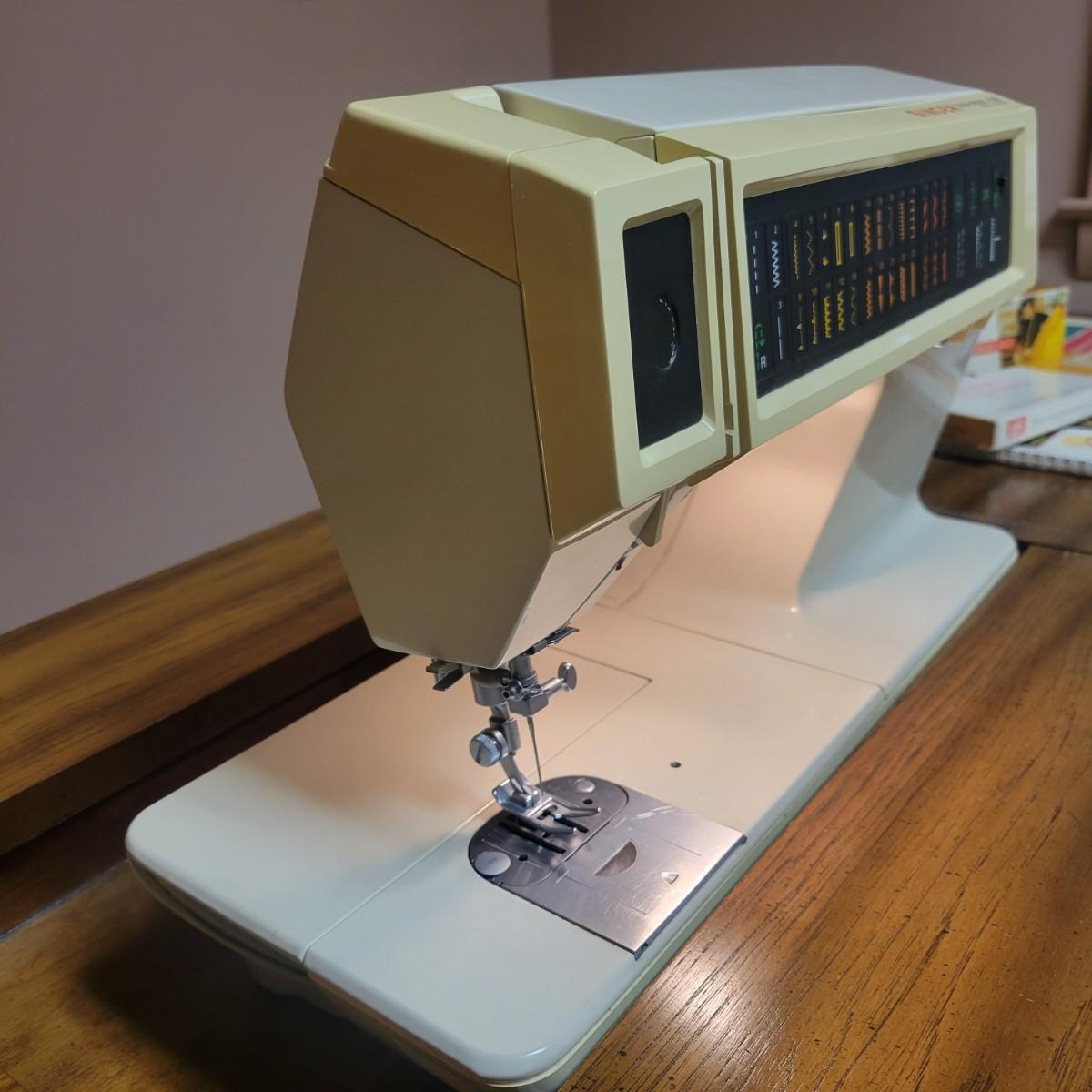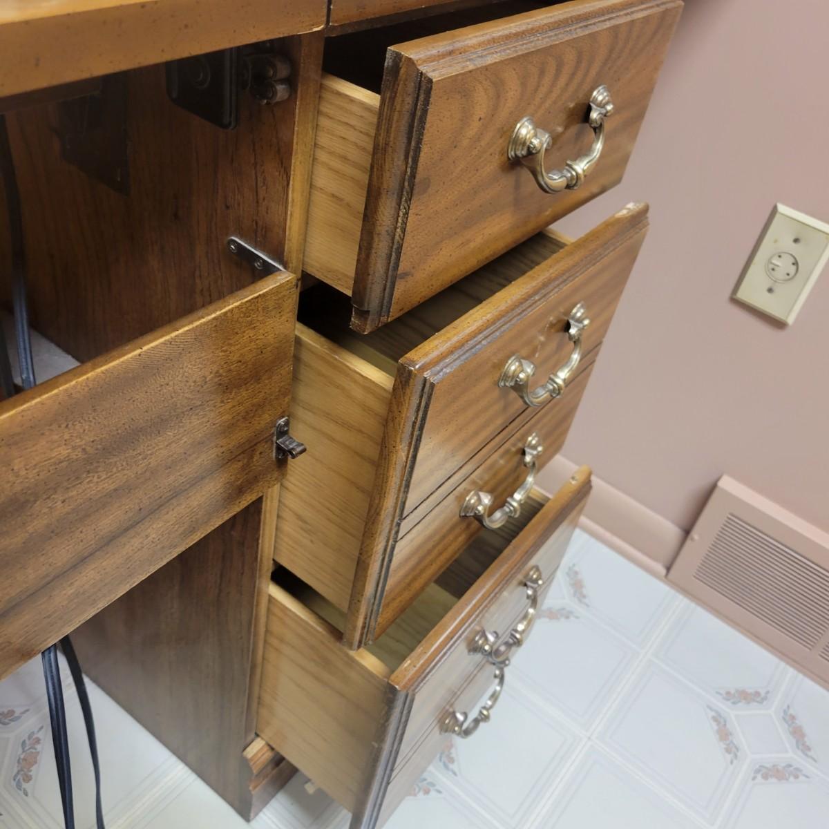 A Singer Touch-Tronic 2010 sewing machine in good condition with no notable damage. Machine was tested and works. Also includes Singer Button holer, Circular stitcher, bobbins, original manual and dressmaker's tracing paper. Sewing table is solid wood and does have some of its finish peeling on the closed table top. It has three drawers and folds up for a small footprint when not in use. With the table expanded the table measures approximately 69" x 20.5" x 41" including the sewing machine height. Table measures approximately 34.5" x 20.5" x 32". Local pickup only