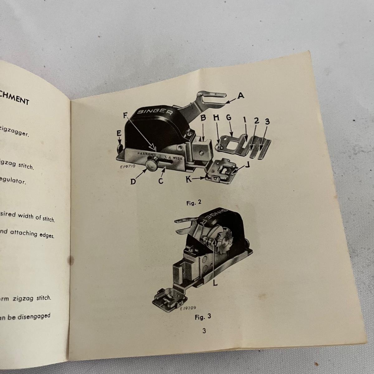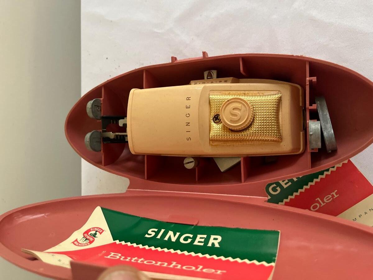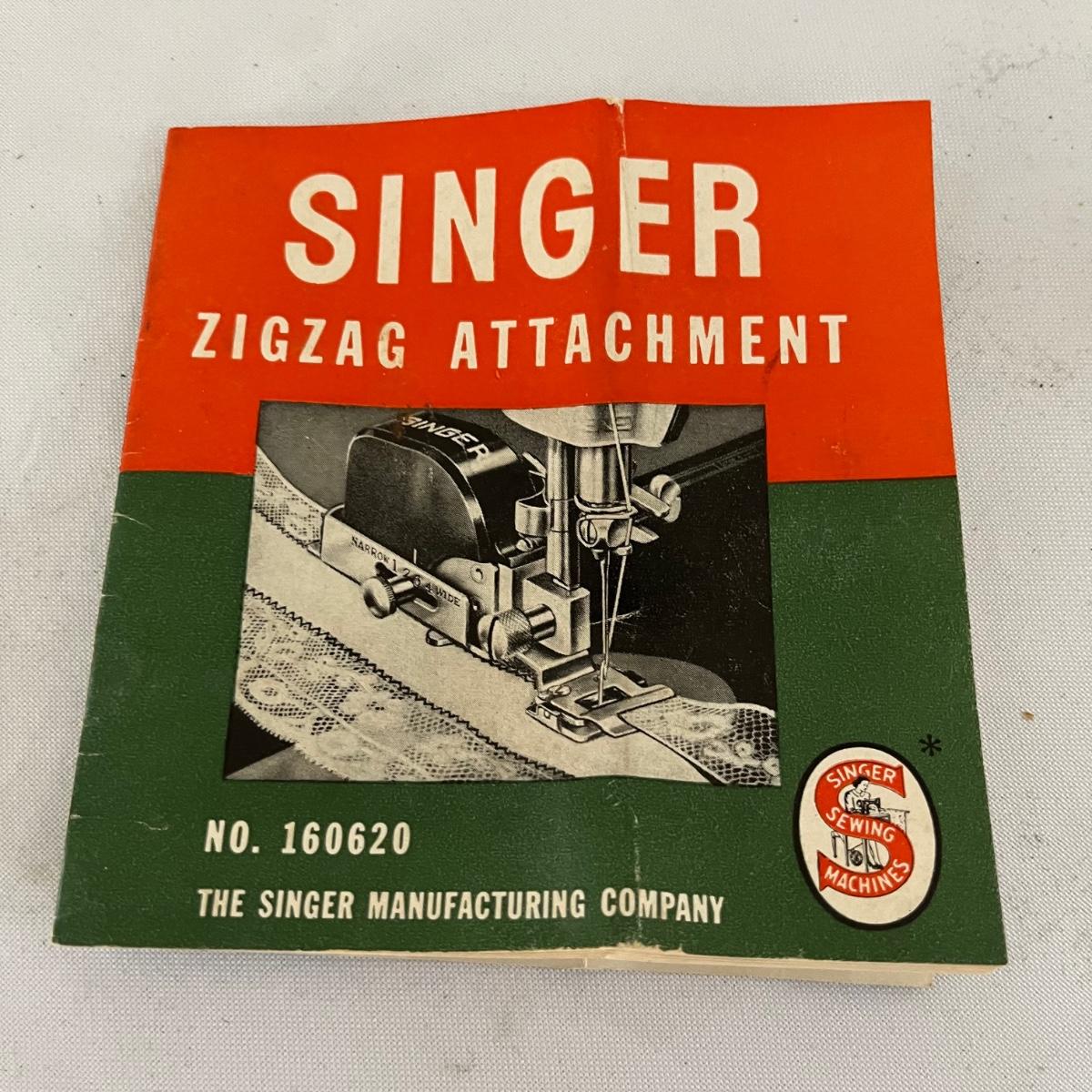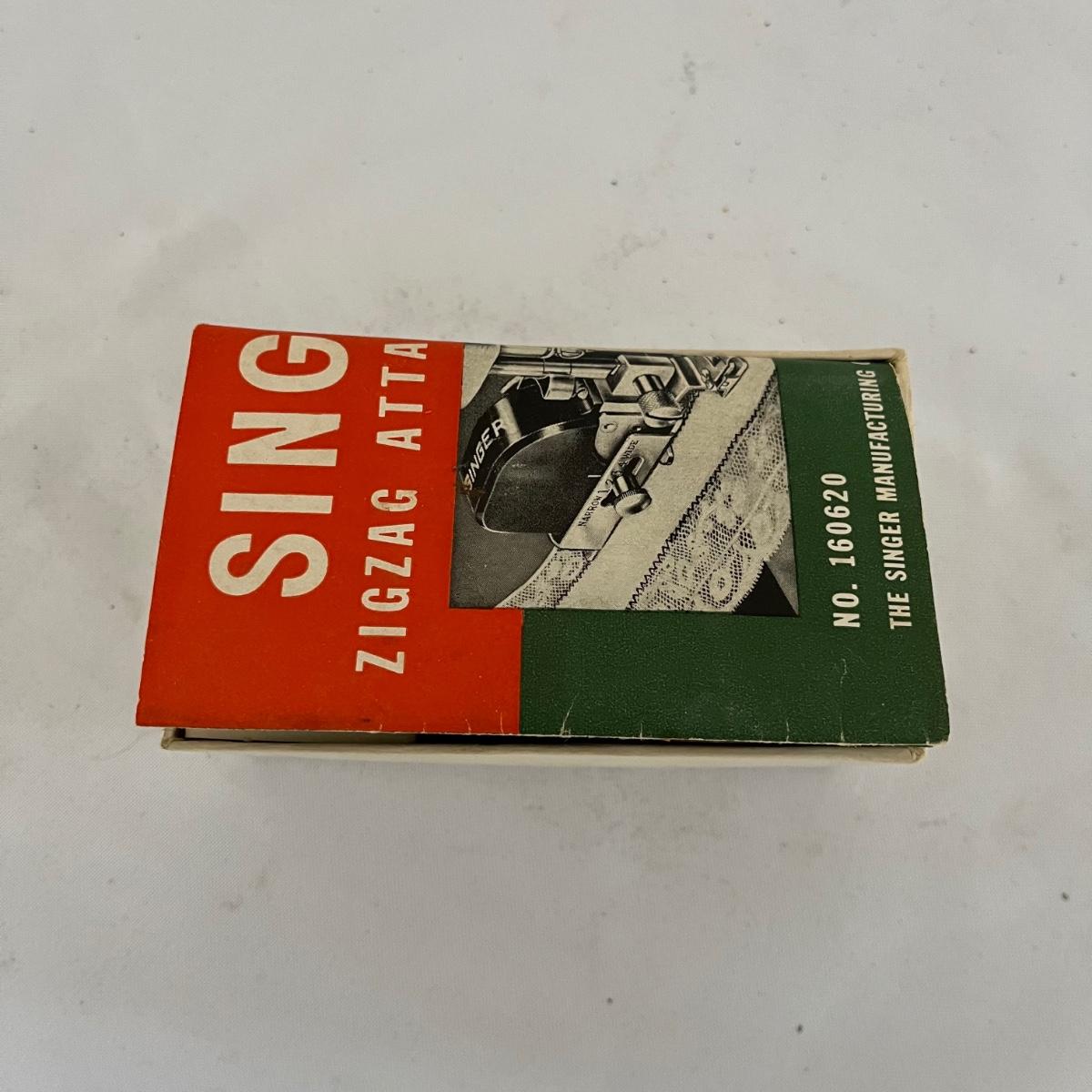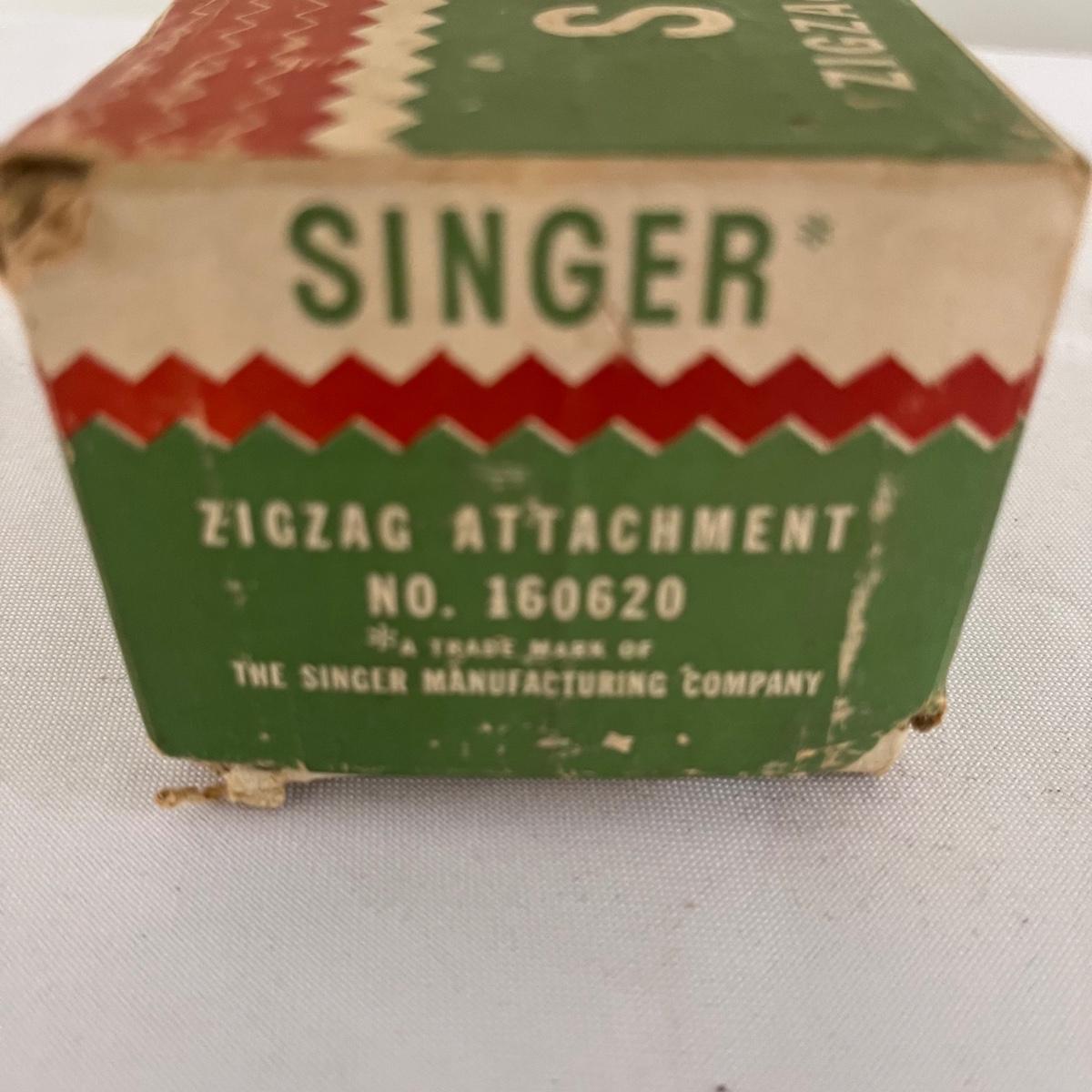 This Singer Zigzag attachment # 160620 comes with accessory box and instruction booklet. Also includes a Singer Buttonholer in a plastic case with an instruction booklet and a plastic Singer box with more attachments included. Plastic box measures 5.5” x 7.5” x 2.5”.