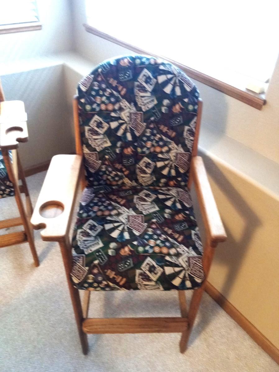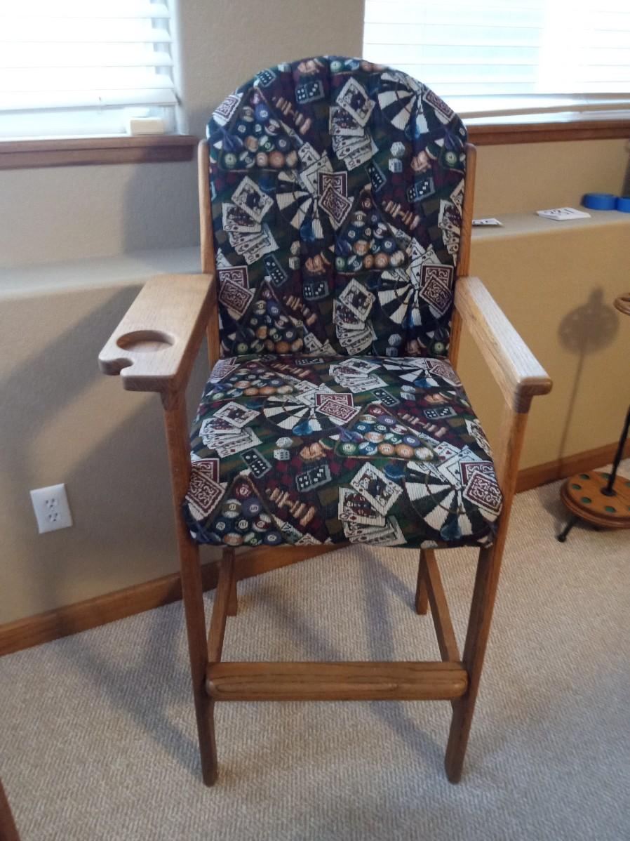 OAK FRAME WITH A FOOT REST AND DRINK HOLDER, THE UPHOLSTERY IS A CASINO THEMED MATERIAL