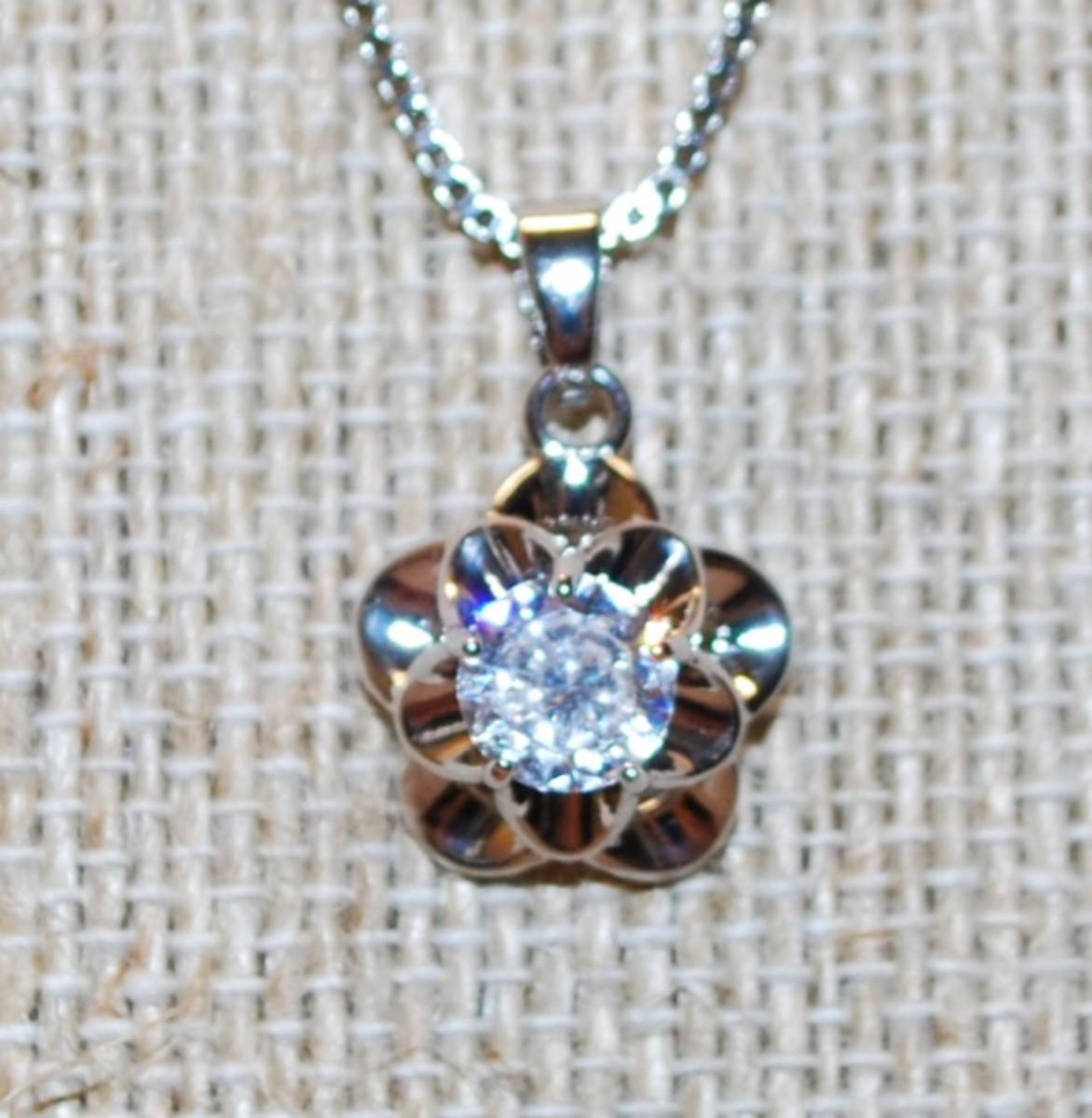 Single Diamond Style Flower Petal PENDANT (½" Diam.) on a Silver Tone Necklace Chain 18" L