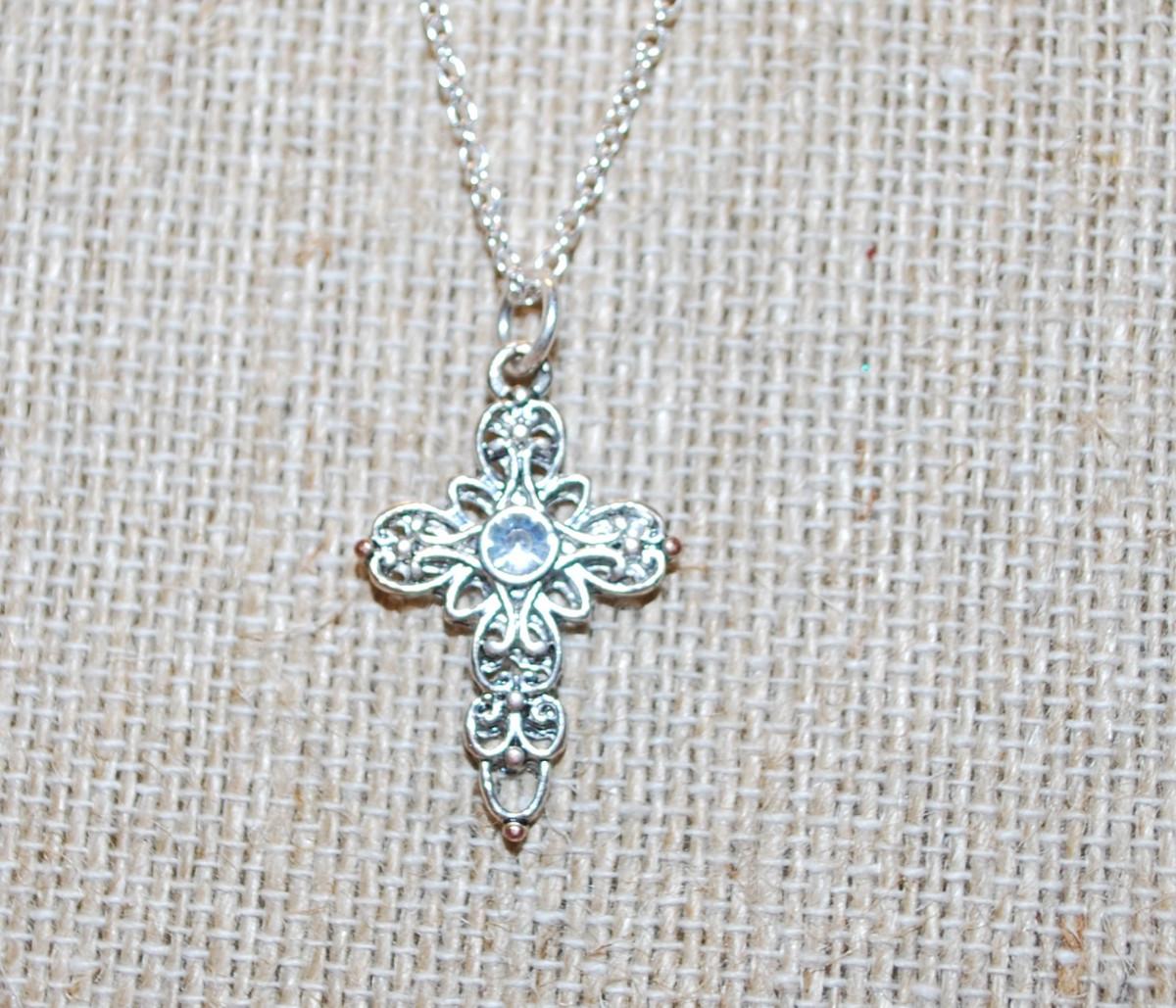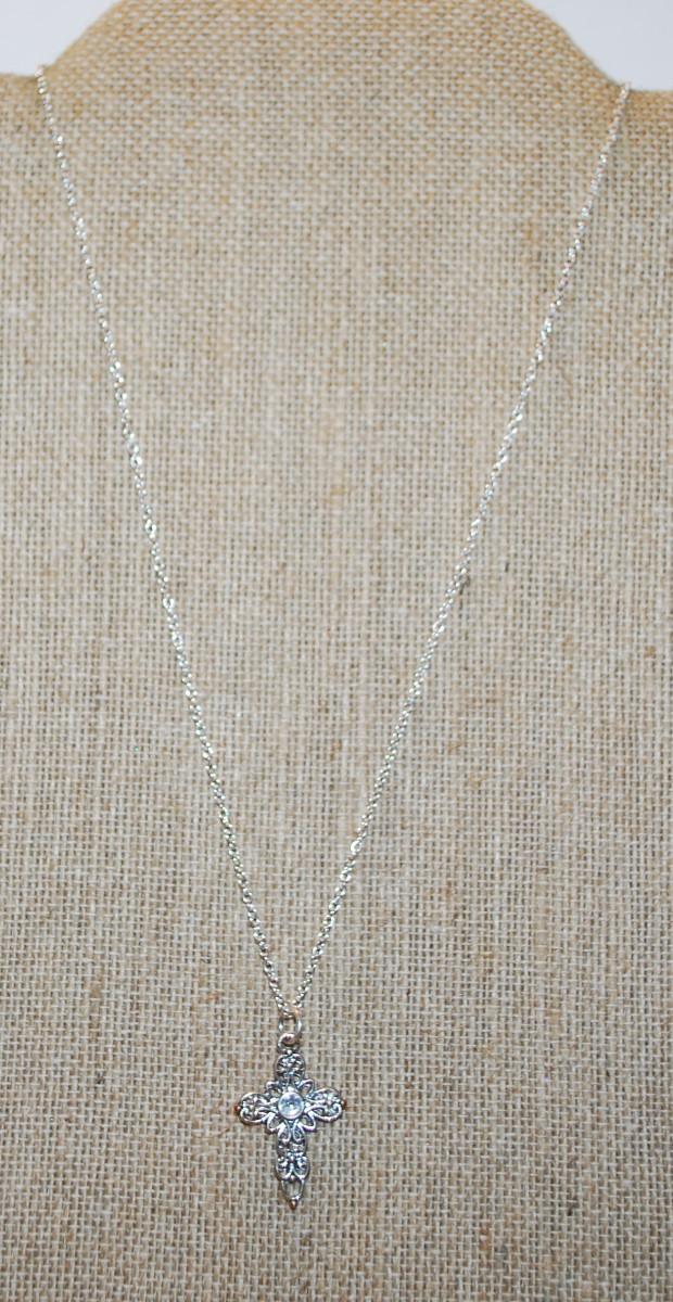 Single Round Clear Stone Cross PENDANT (1¼" x ½") with Bottom Loop on an Adjustable Necklace Chain 14"-18" L