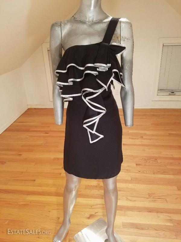 A real beauty is this little dress that is all black silk with a single shoulder and front ruffles with silver lame ribbon trim