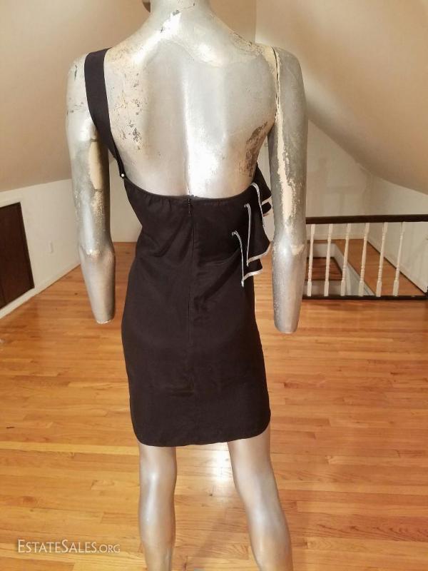 A real beauty is this little dress that is all black silk with a single shoulder and front ruffles with silver lame ribbon trim