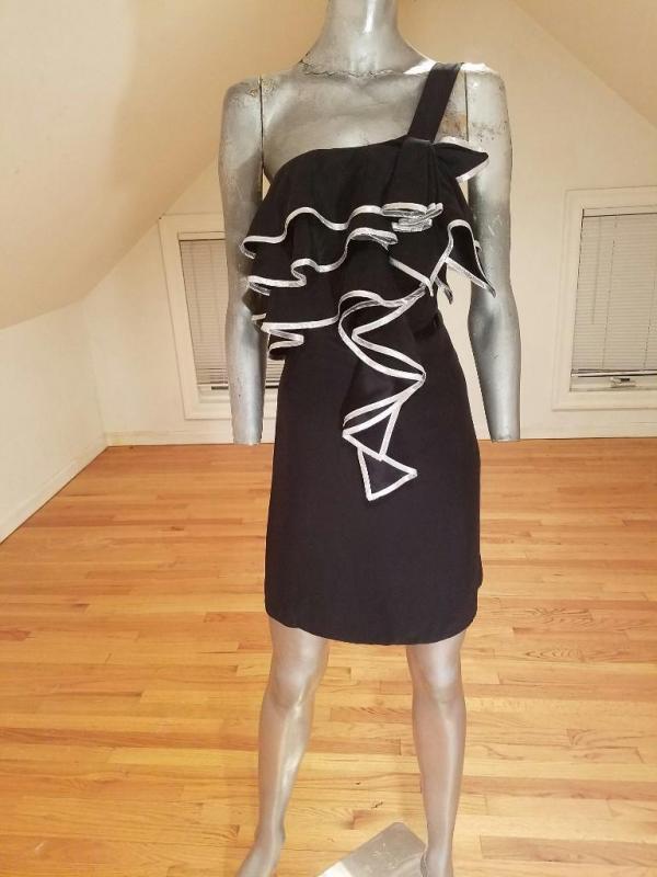 A real beauty is this little dress that is all black silk with a single shoulder and front ruffles with silver lame ribbon trim