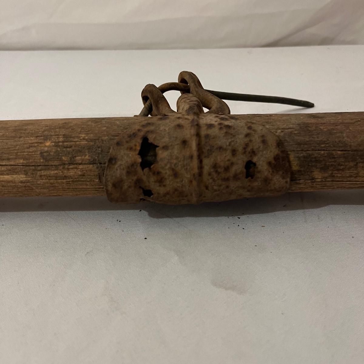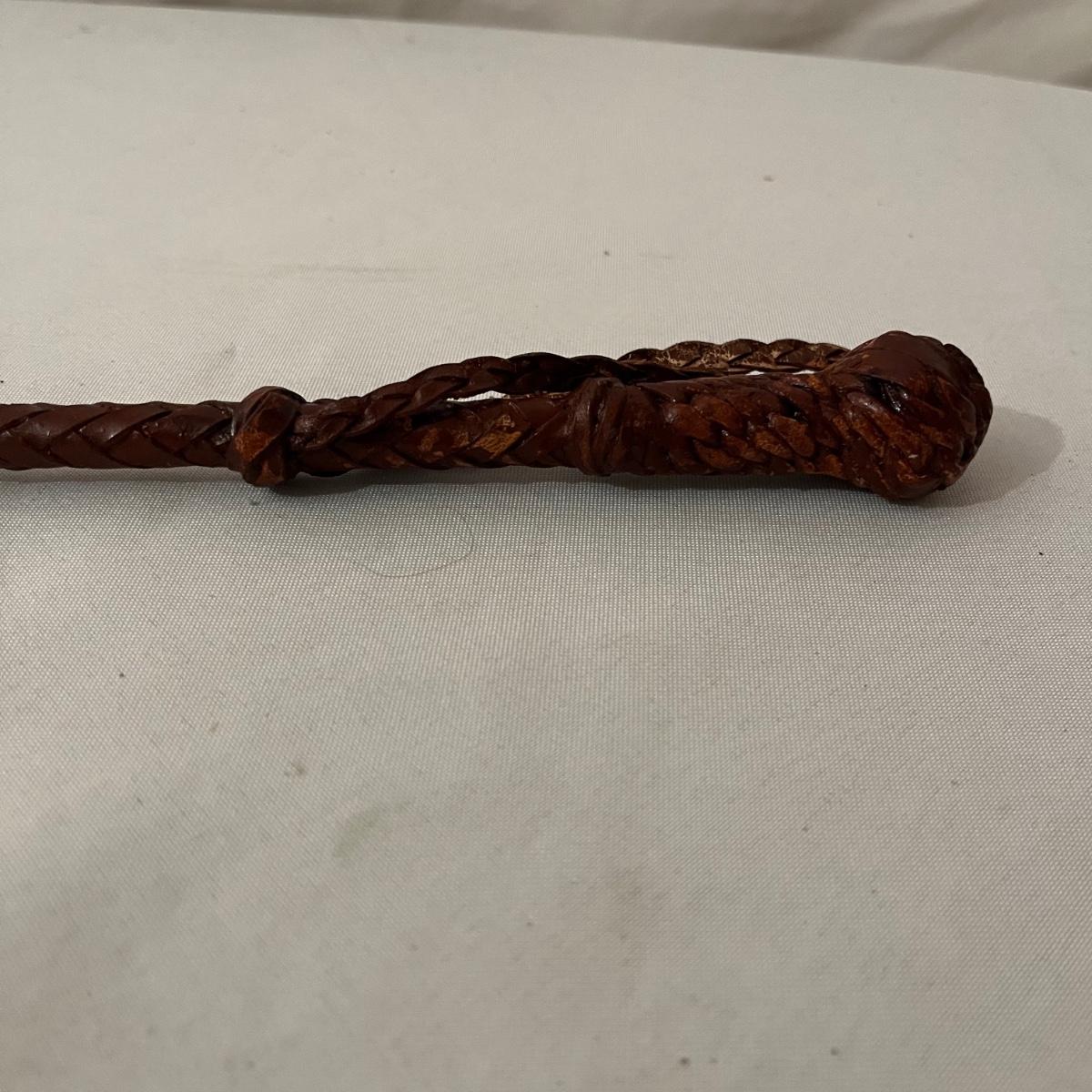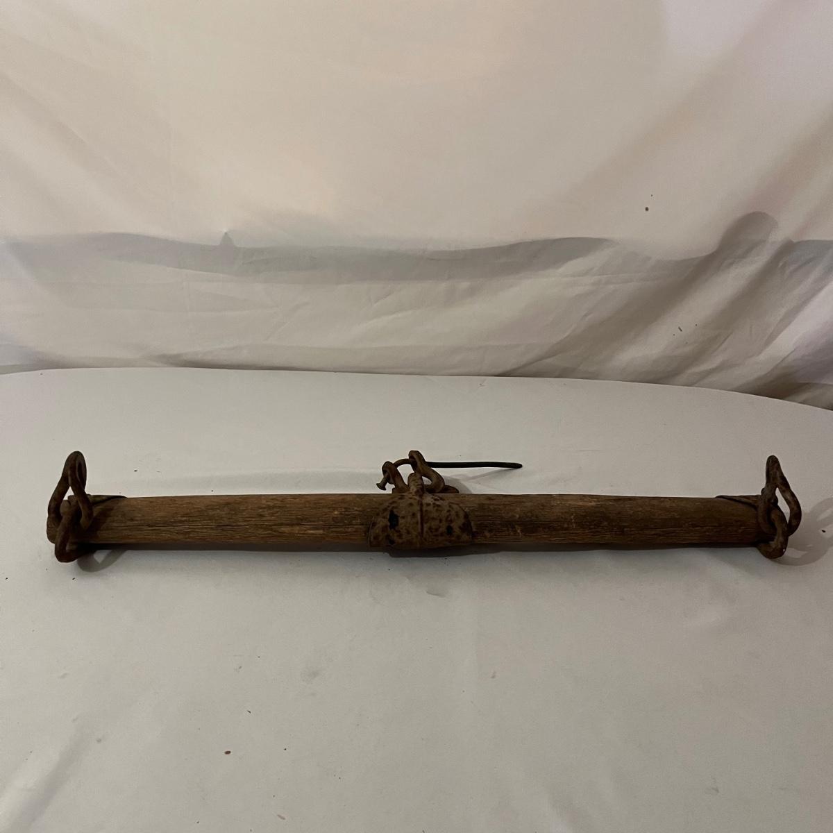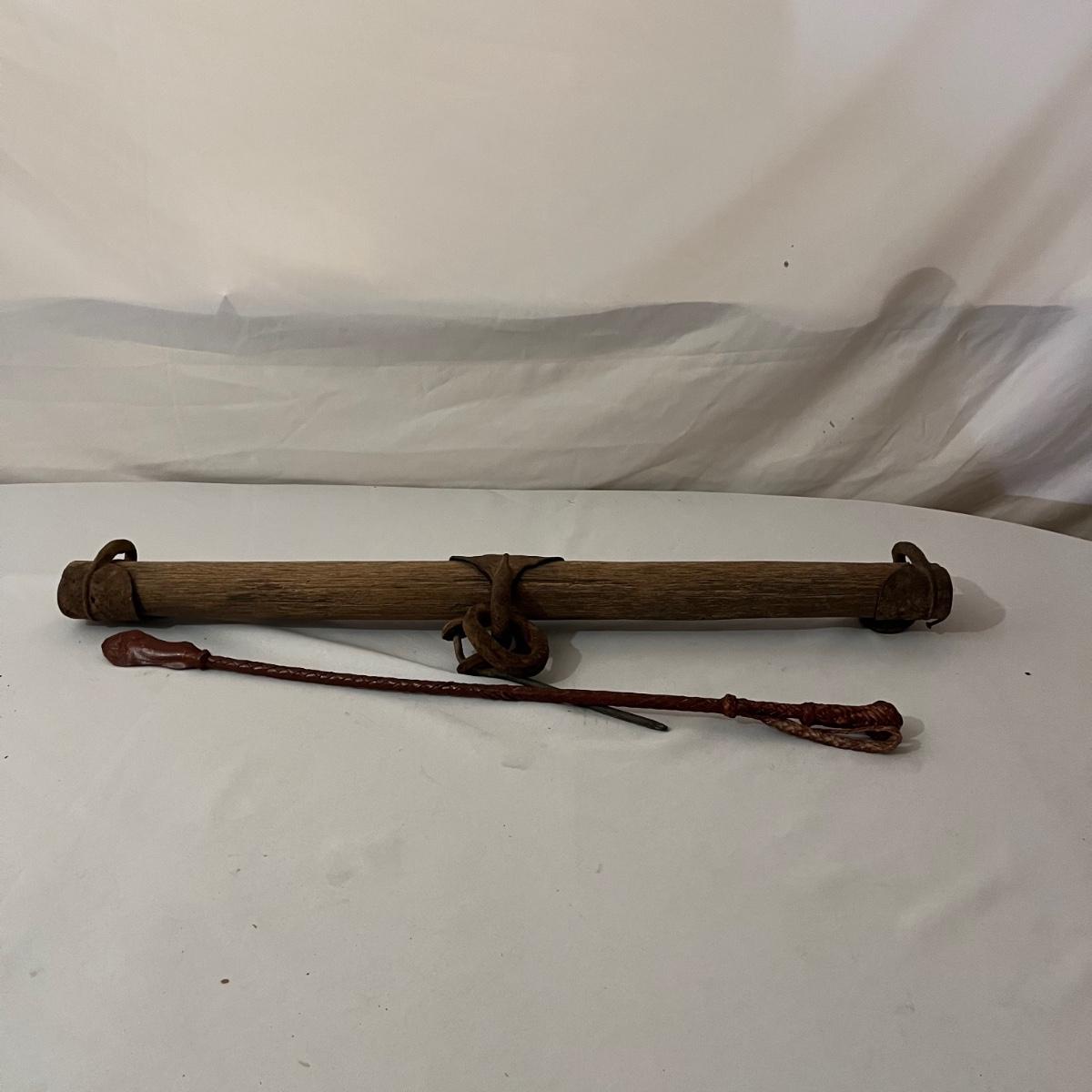 Lot includes a wooden and iron single tree Draught horse hitch and a braided leather crop. Hitch measures 28.5” long.