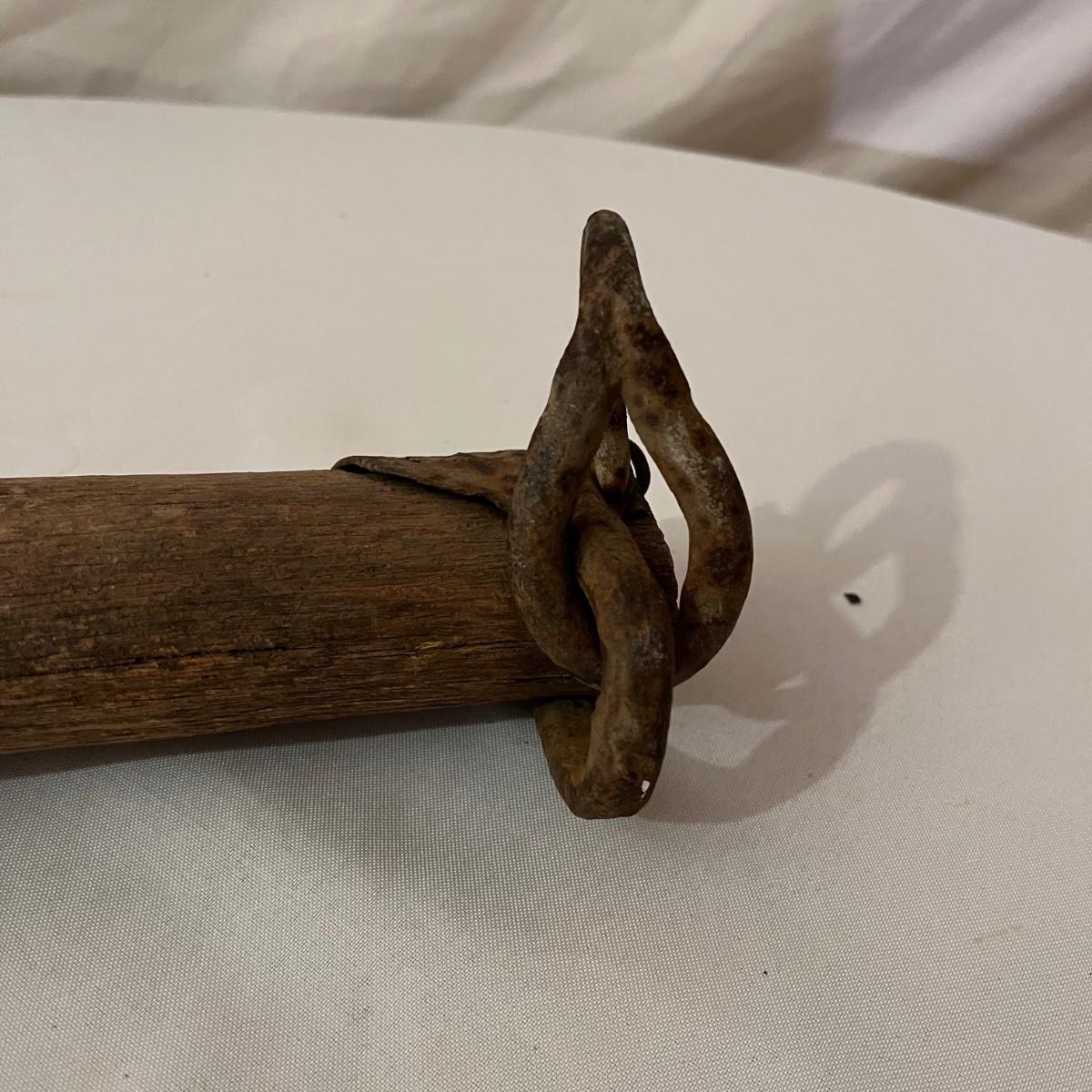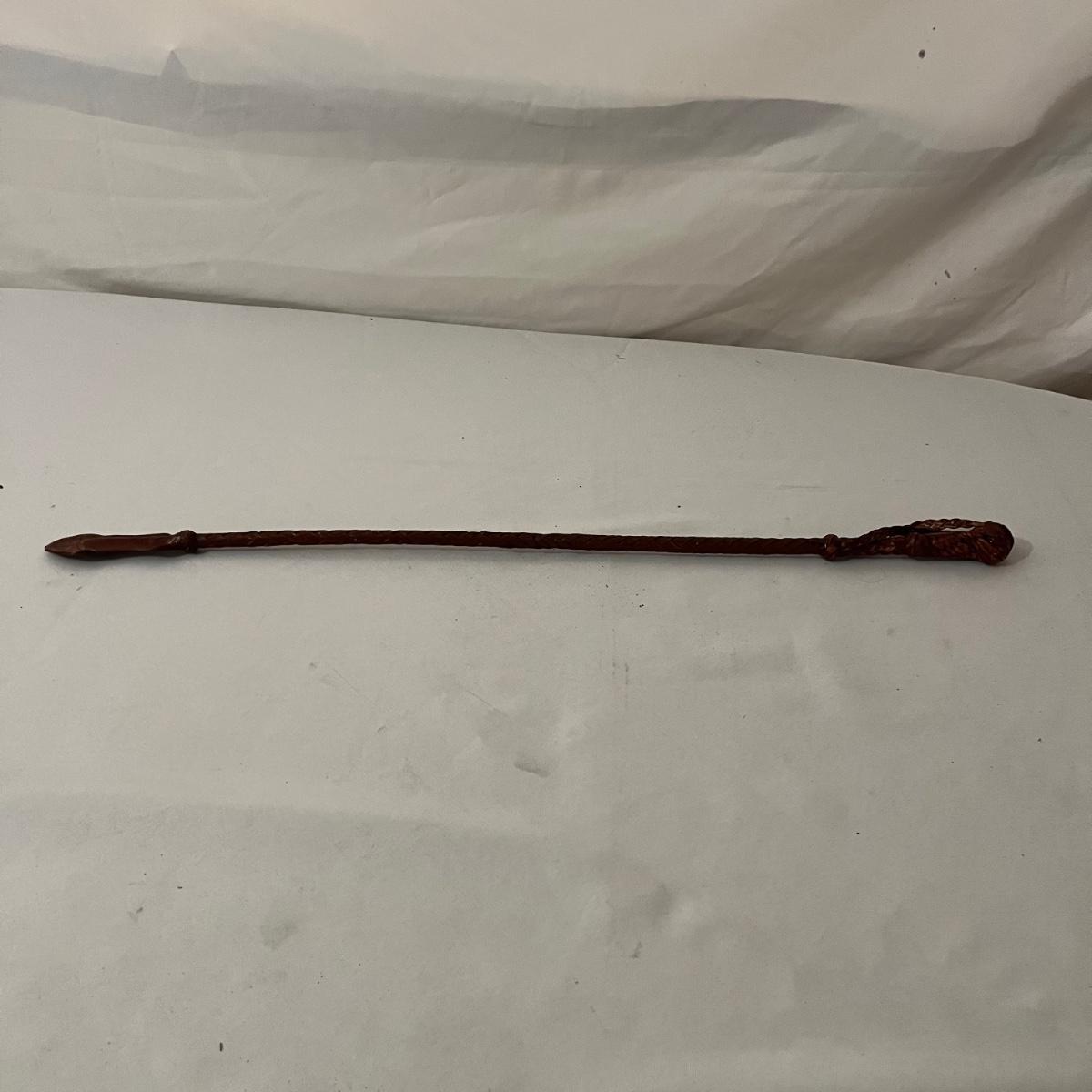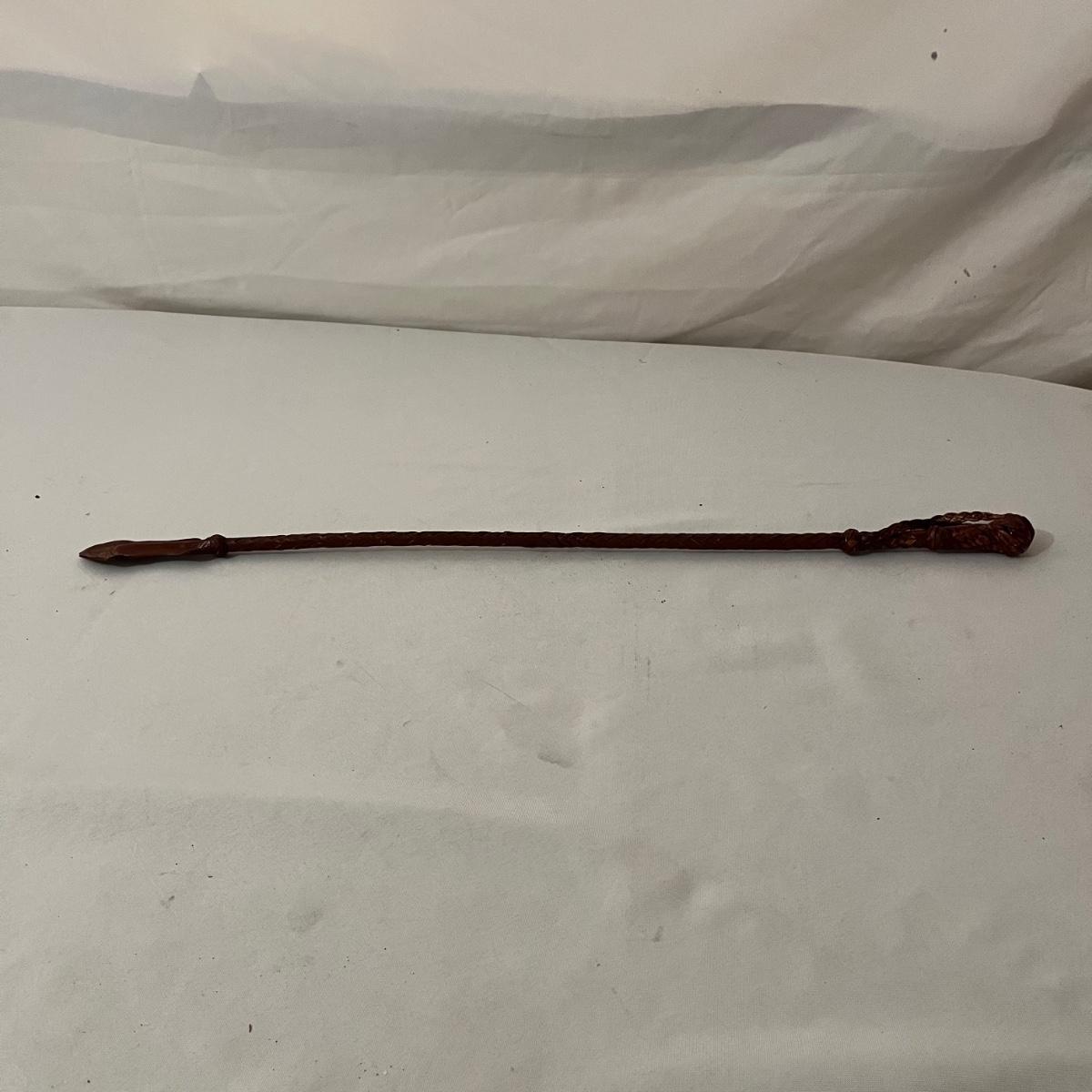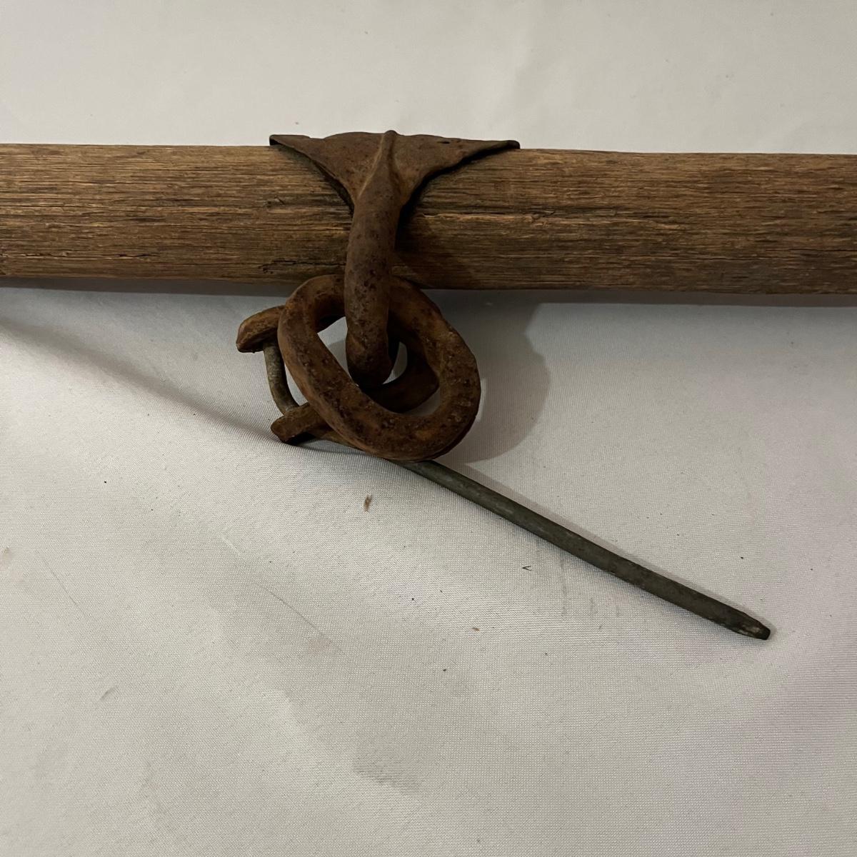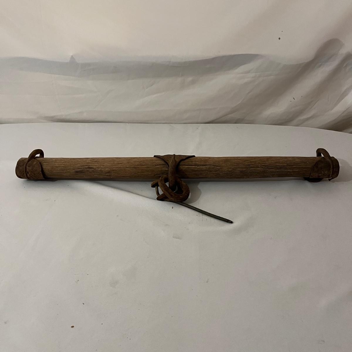 Lot includes a wooden and iron single tree Draught horse hitch and a braided leather crop. Hitch measures 28.5” long.