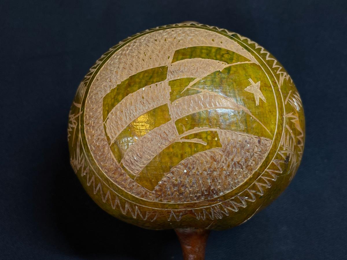 The subject item is a vintage, natural gourd maraca the body of which has been incise-carved with the word “CUBA” and a depiction of the Cuban flag. The gourd has been fitted with a turned wood handle.