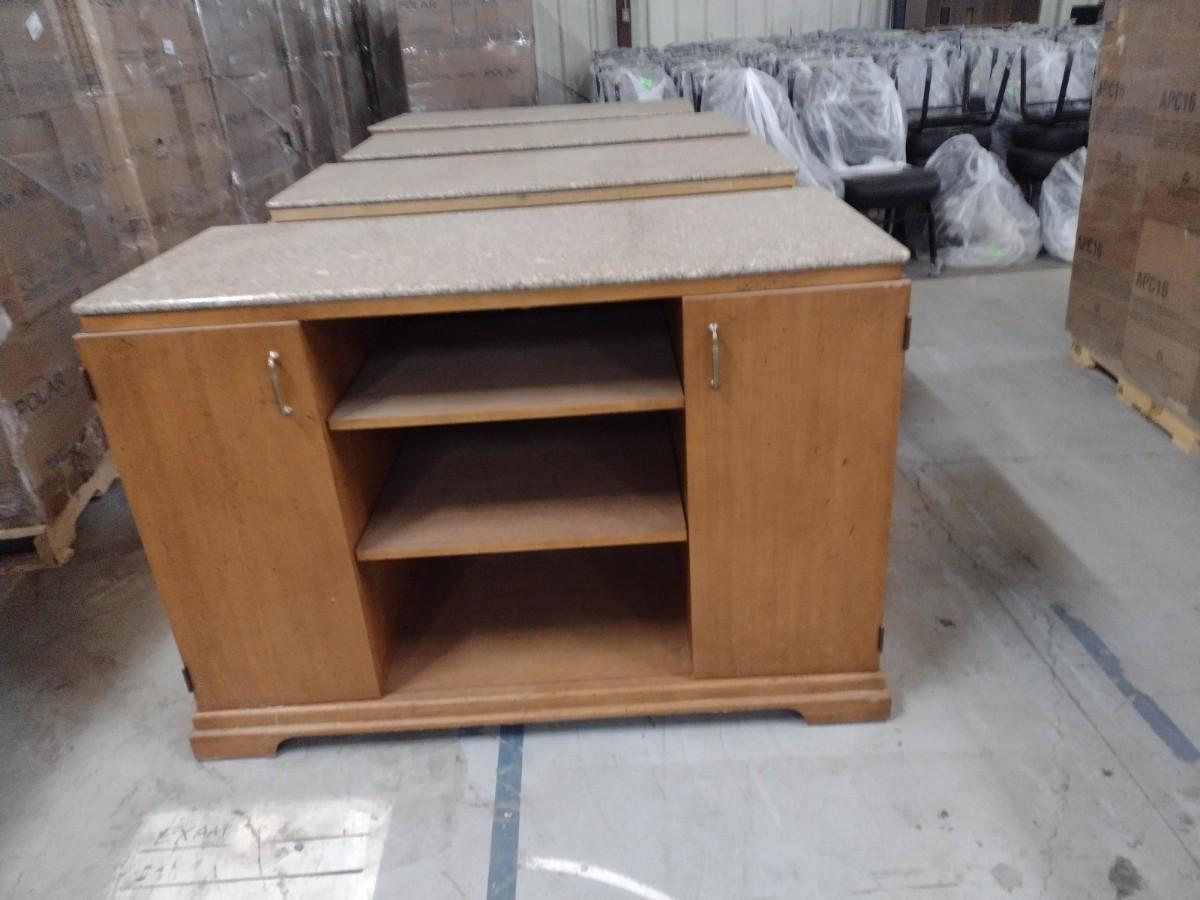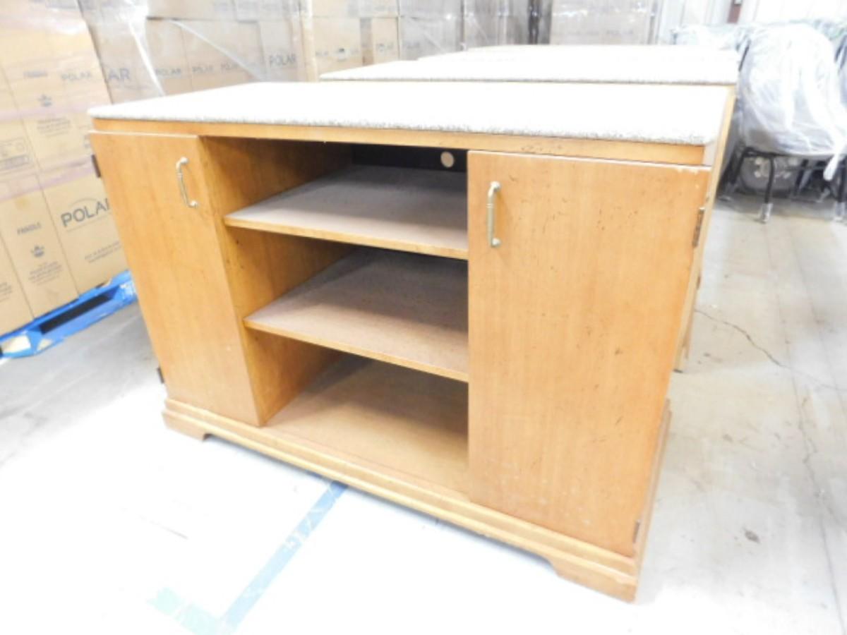 Single Wood Finish Double Door Media Console with Sandstone Color Marble Top for Large Flat Screen TV Choice A expect some scratches or wear to finish Shipping option via freight or local mover is Buyer's responsibility and expense. Buyer must have all shipping scheduled within the stated dates and times of pickup. Recommended local mover is Beaty Bros. Moving 828-201-2982