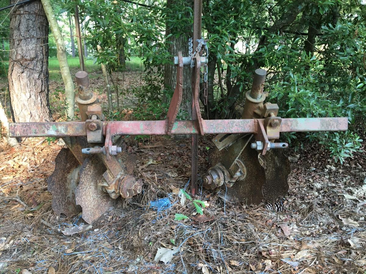 Single-row Ridger plow, dual disc on each side, adjustable row width, 3-point hitch.