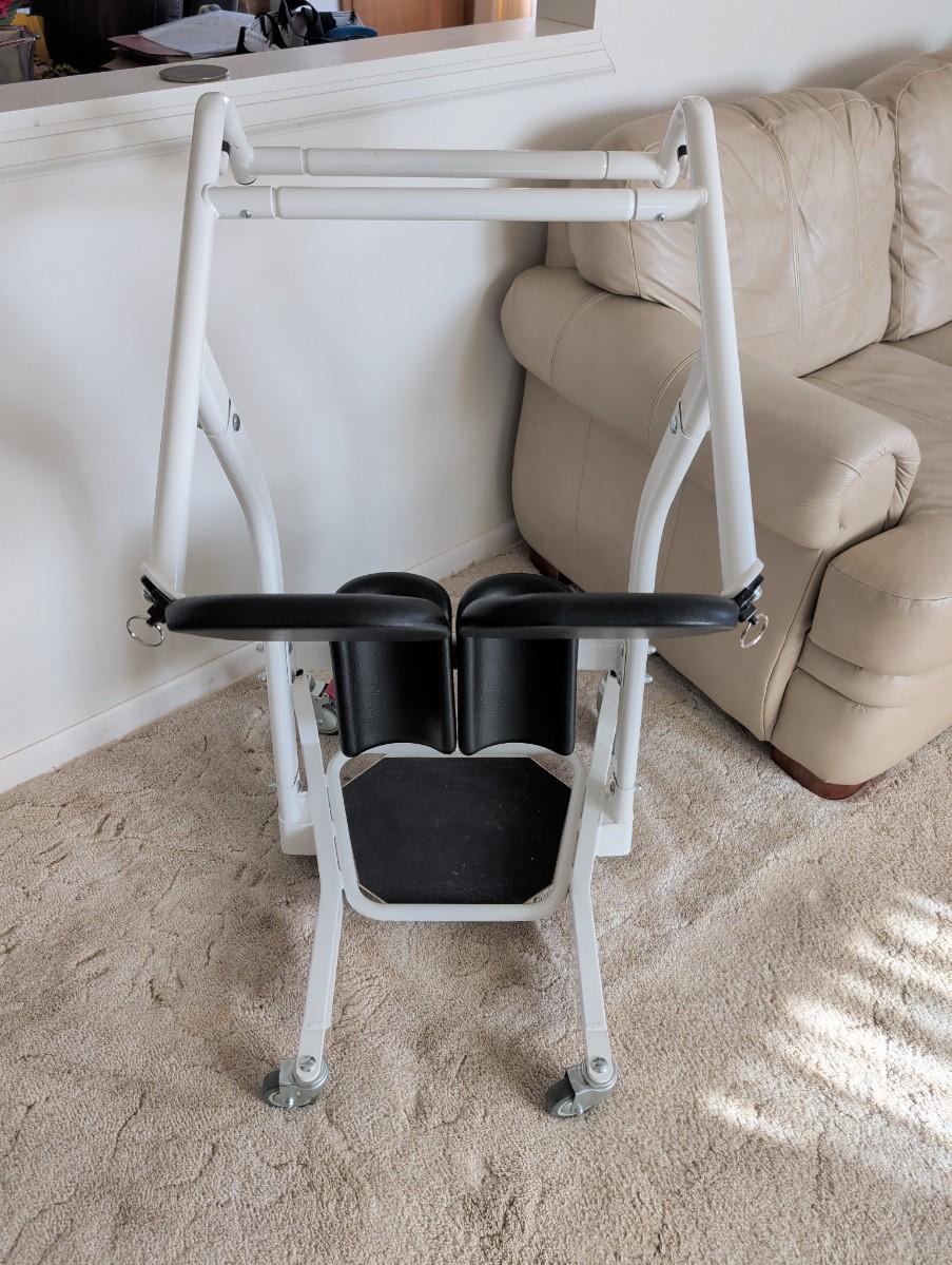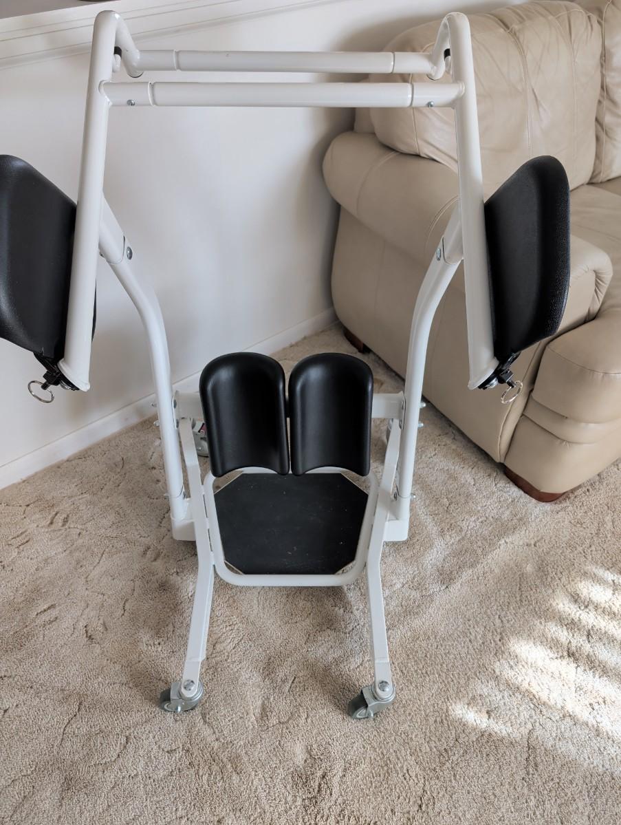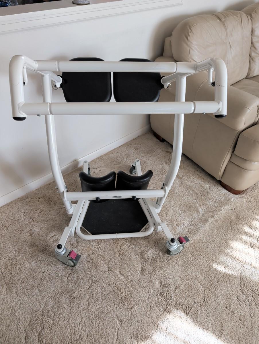 Sit to stand device for helping a person stand from a sitting position to transfer to a bed or chair. This was a life saver! Very easy to use!