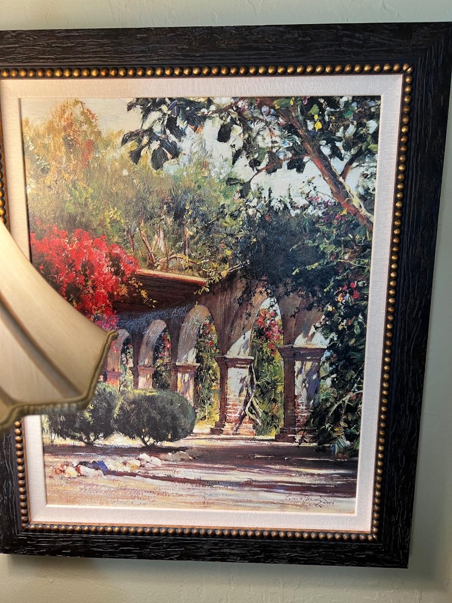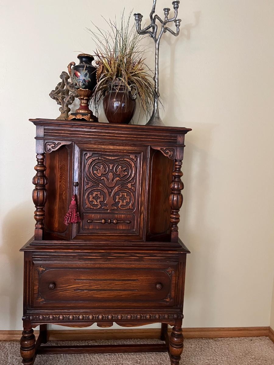 Pair of Chairs Side Table, Antique hutch, Lamp, Framed Print, & Decor as pictured