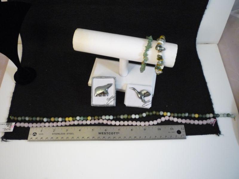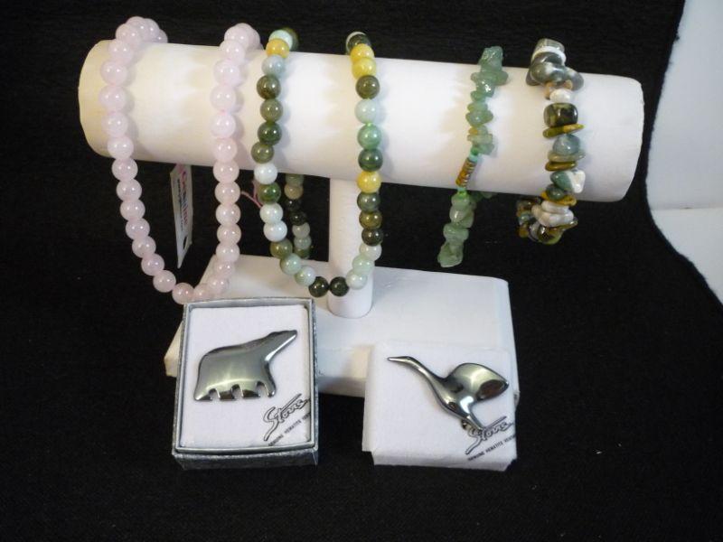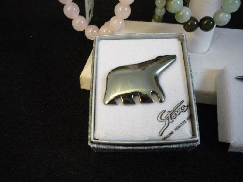 Six pieces in this lot -- two bracelets, two pins of genuine hematite and two sets of beads ready for you to make into a necklace, bracelet, etc. Note the rose quartz beads has a retail price tag of $9.00 The two bead sets measure approximately 15 inches each.