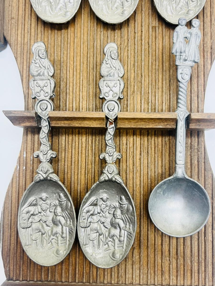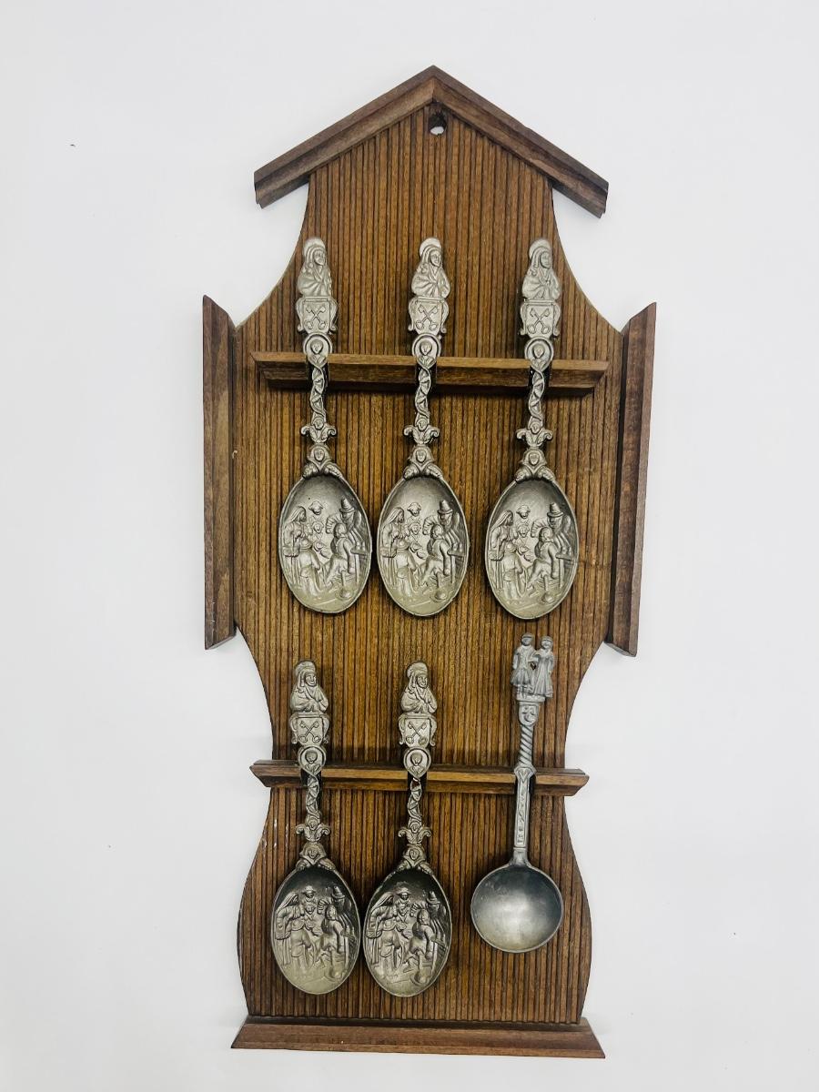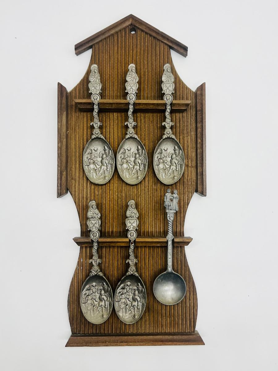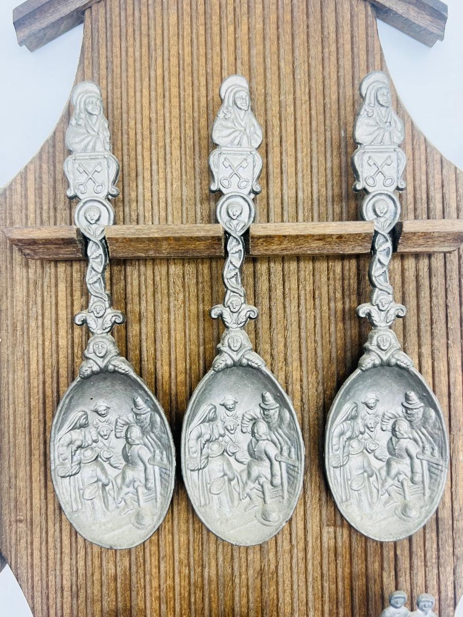 SIX Antique German Pewter Spoon Set 5 Five “Tooth Master” Dentist pewter spoons. One Antique Pewter Spoon German Wedding Spoon. One of the “tooth master” spoons appears to have been fixed, see picture. Wooden holder hangs on the wall. Spoons measure 7 inches. Wall hanger measures 20 inches tall.