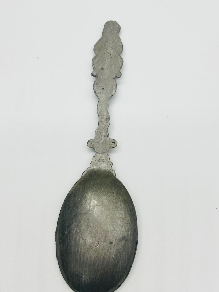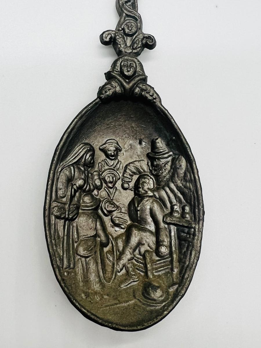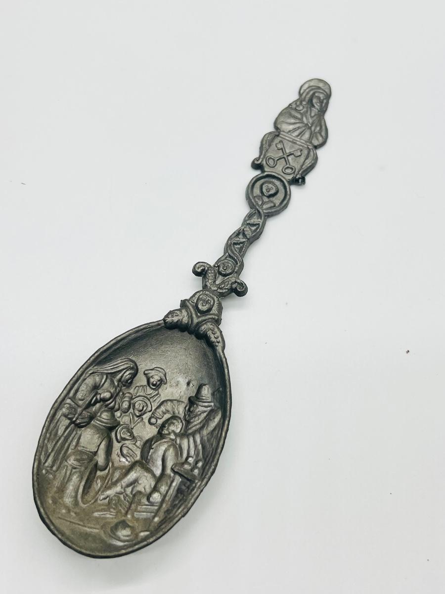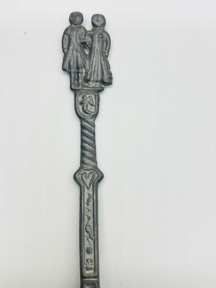 SIX Antique German Pewter Spoon Set 5 Five “Tooth Master” Dentist pewter spoons. One Antique Pewter Spoon German Wedding Spoon. One of the “tooth master” spoons appears to have been fixed, see picture. Wooden holder hangs on the wall. Spoons measure 7 inches. Wall hanger measures 20 inches tall.