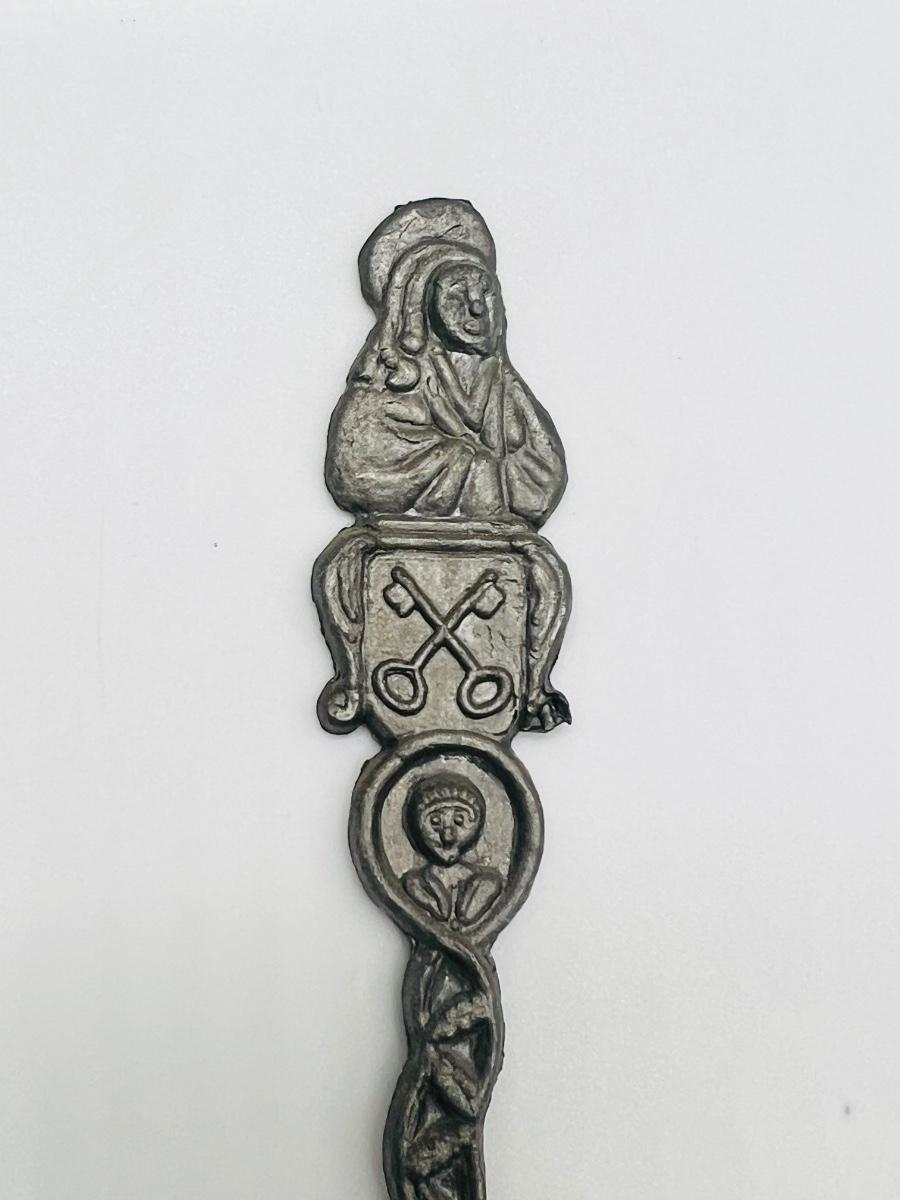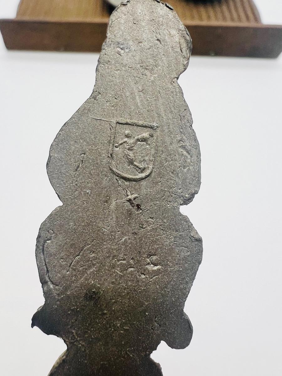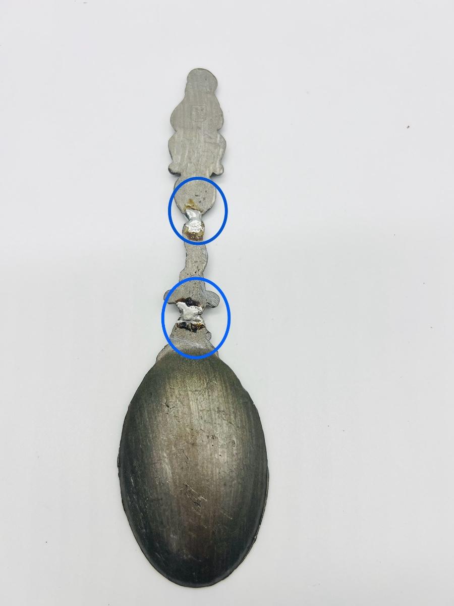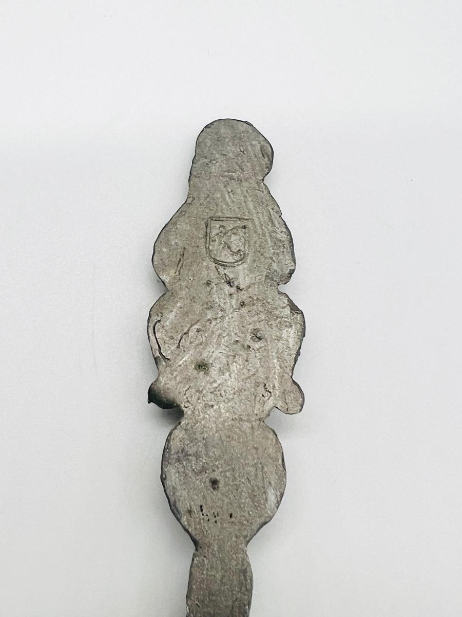 SIX Antique German Pewter Spoon Set 5 Five “Tooth Master” Dentist pewter spoons. One Antique Pewter Spoon German Wedding Spoon. One of the “tooth master” spoons appears to have been fixed, see picture. Wooden holder hangs on the wall. Spoons measure 7 inches. Wall hanger measures 20 inches tall.
