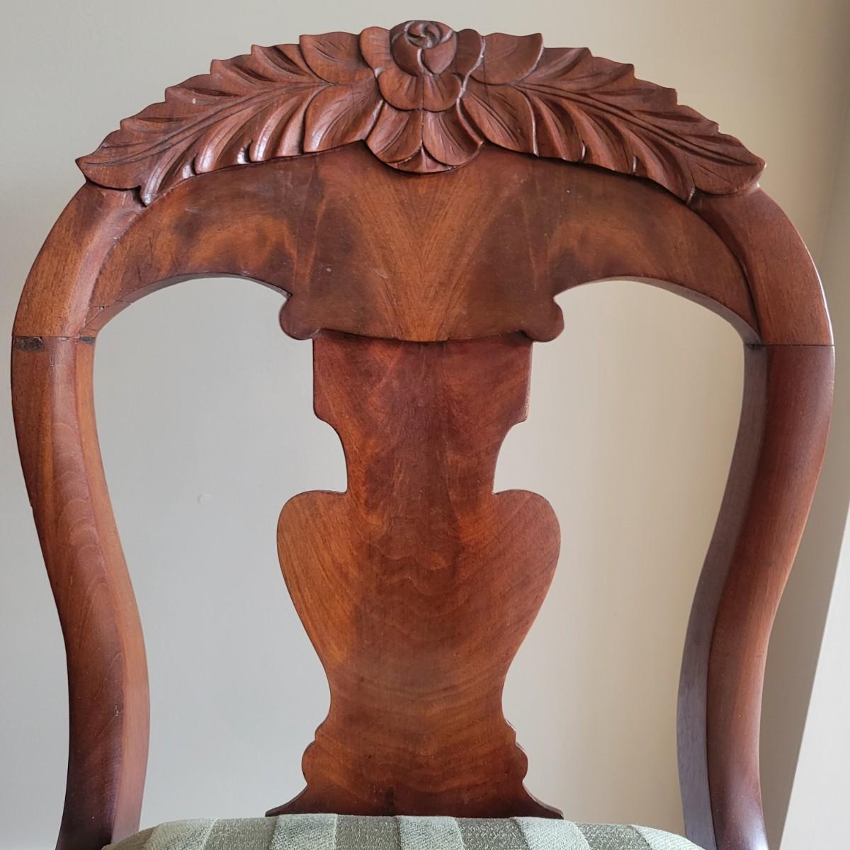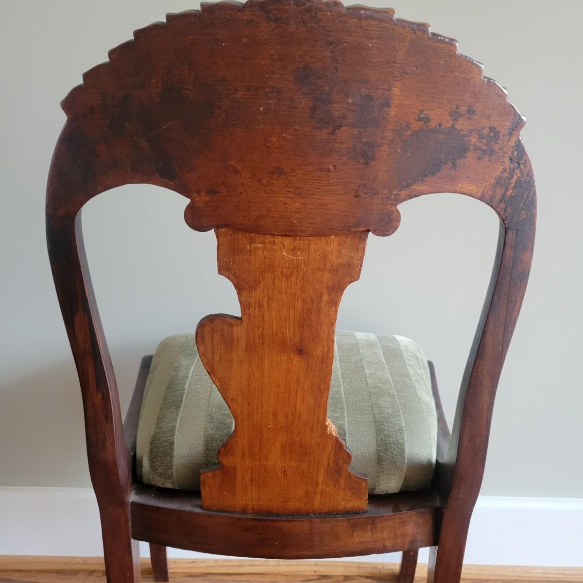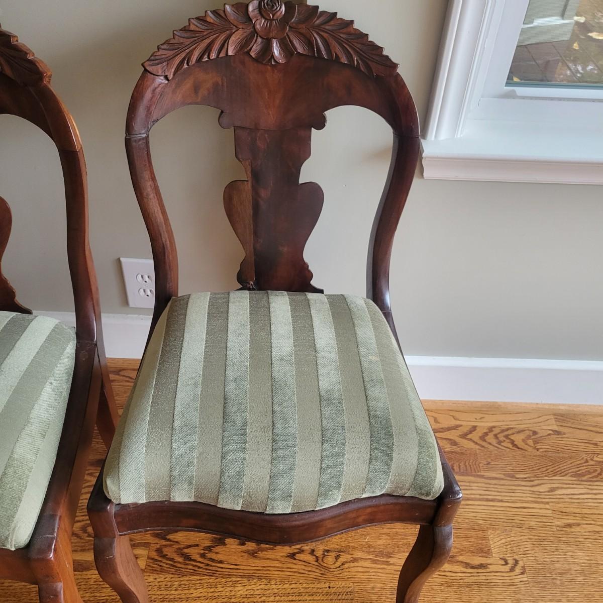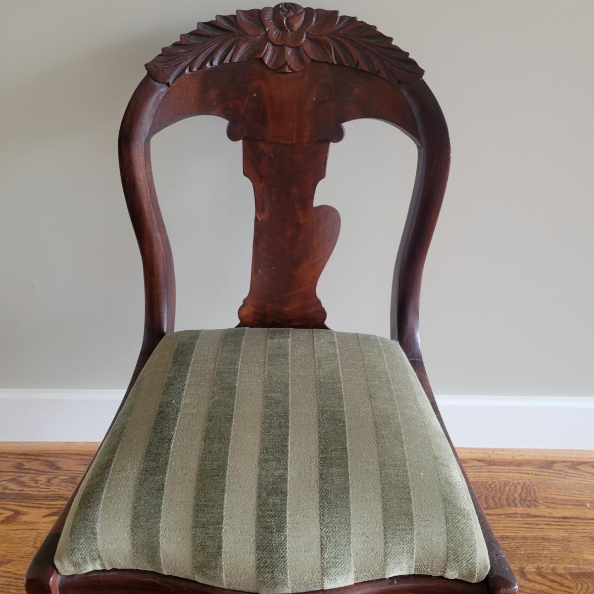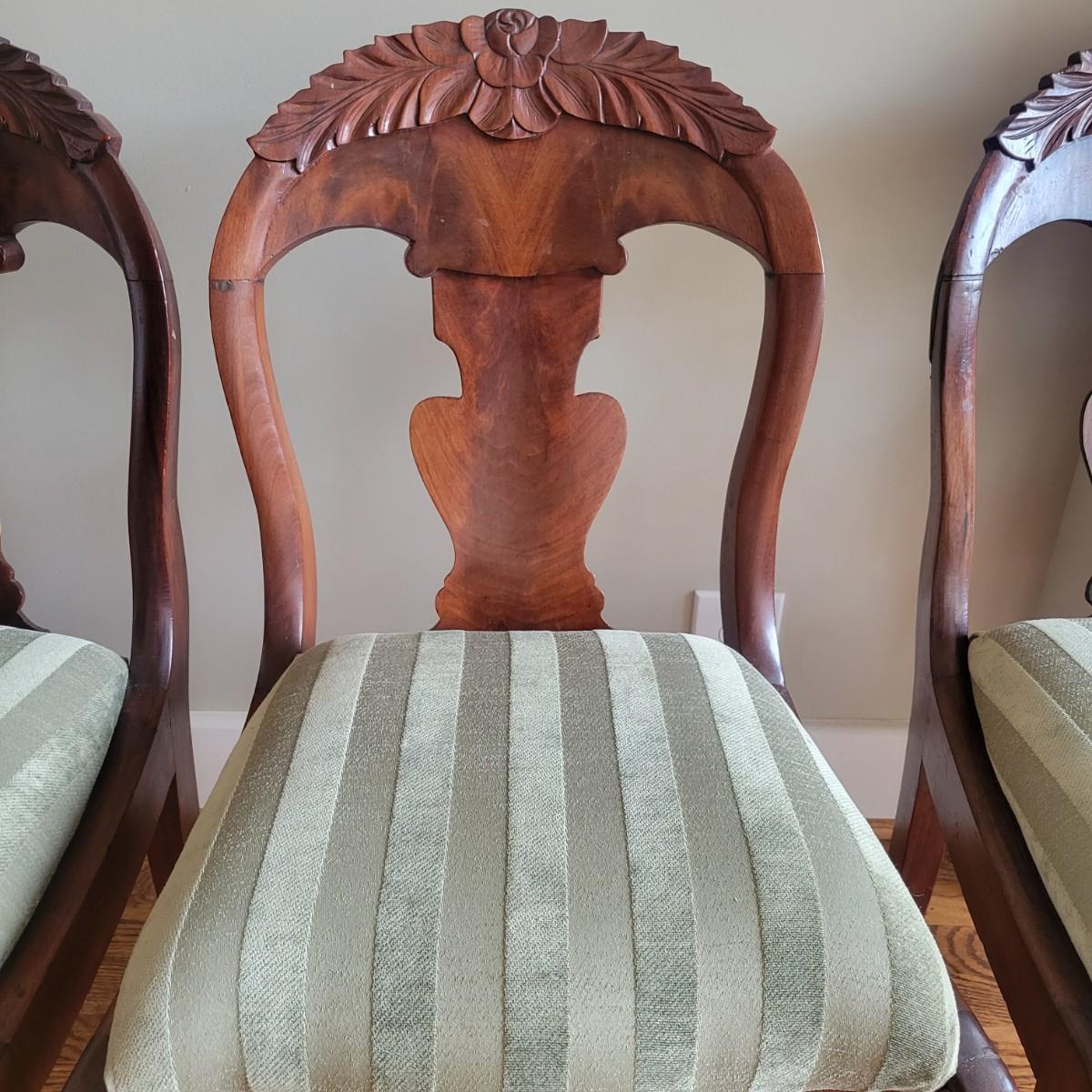 A set of six antique splat back chairs. These chairs feature a rich brown wood veneer with green striped upholstery. The top of each chair features a detailed floral carving. The chairs are in good condition for their age, but have some notable damage. Four chairs have broken pieces, but three of those pieces are with the lot ready to be reattached. Some scratches and the veneer is bubbling on a few of them. Each measure approximately 18" x 18" x 32" with a seat height of 17.5".