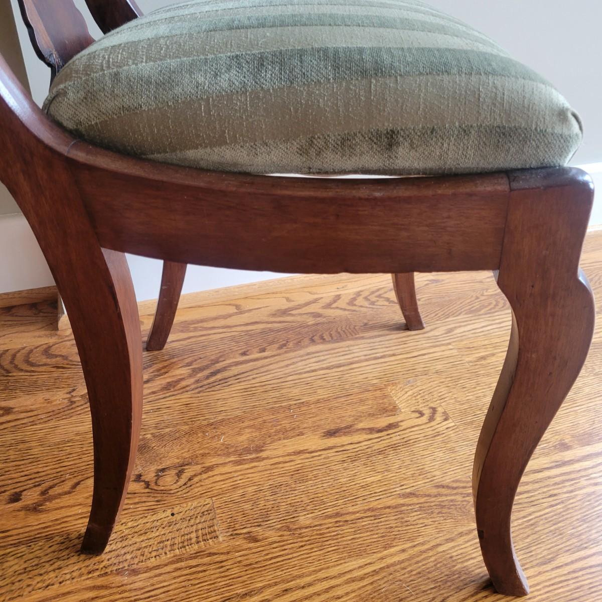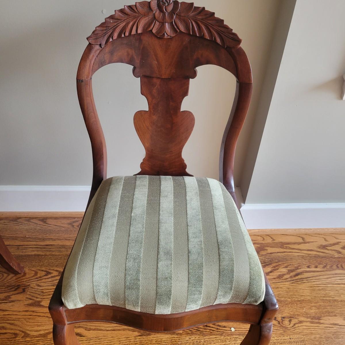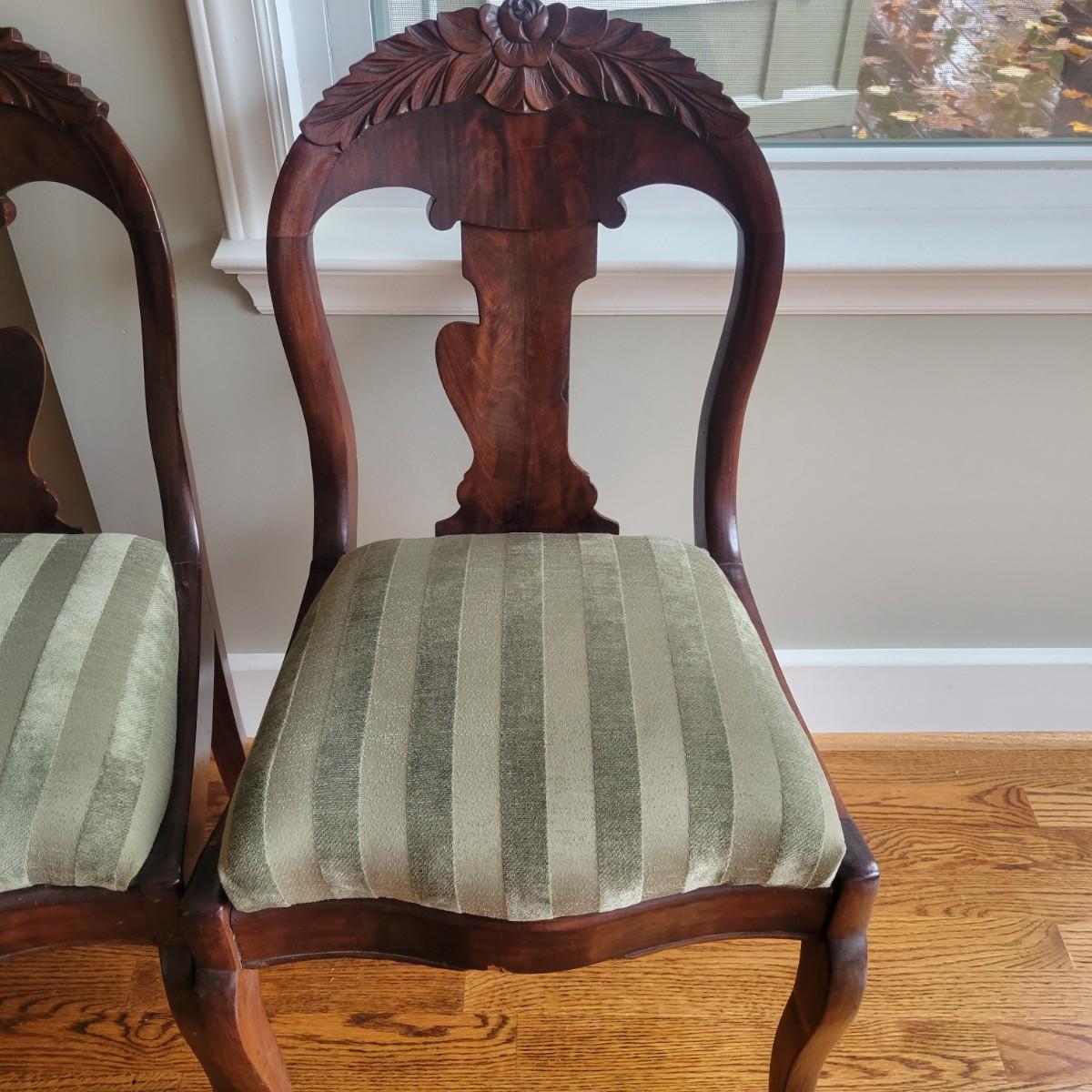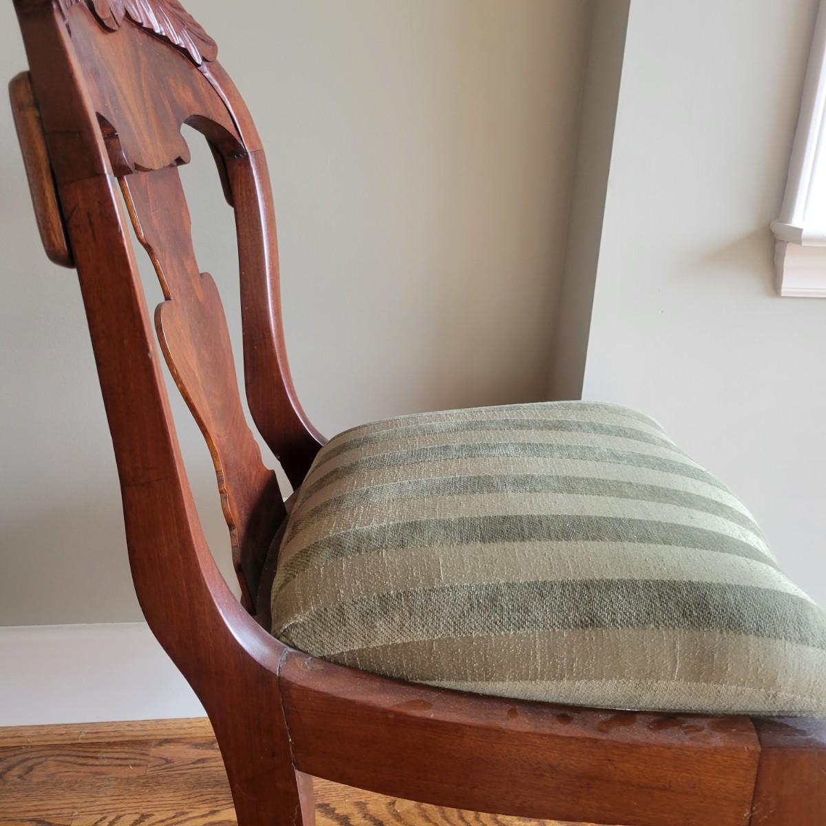 A set of six antique splat back chairs. These chairs feature a rich brown wood veneer with green striped upholstery. The top of each chair features a detailed floral carving. The chairs are in good condition for their age, but have some notable damage. Four chairs have broken pieces, but three of those pieces are with the lot ready to be reattached. Some scratches and the veneer is bubbling on a few of them. Each measure approximately 18" x 18" x 32" with a seat height of 17.5".