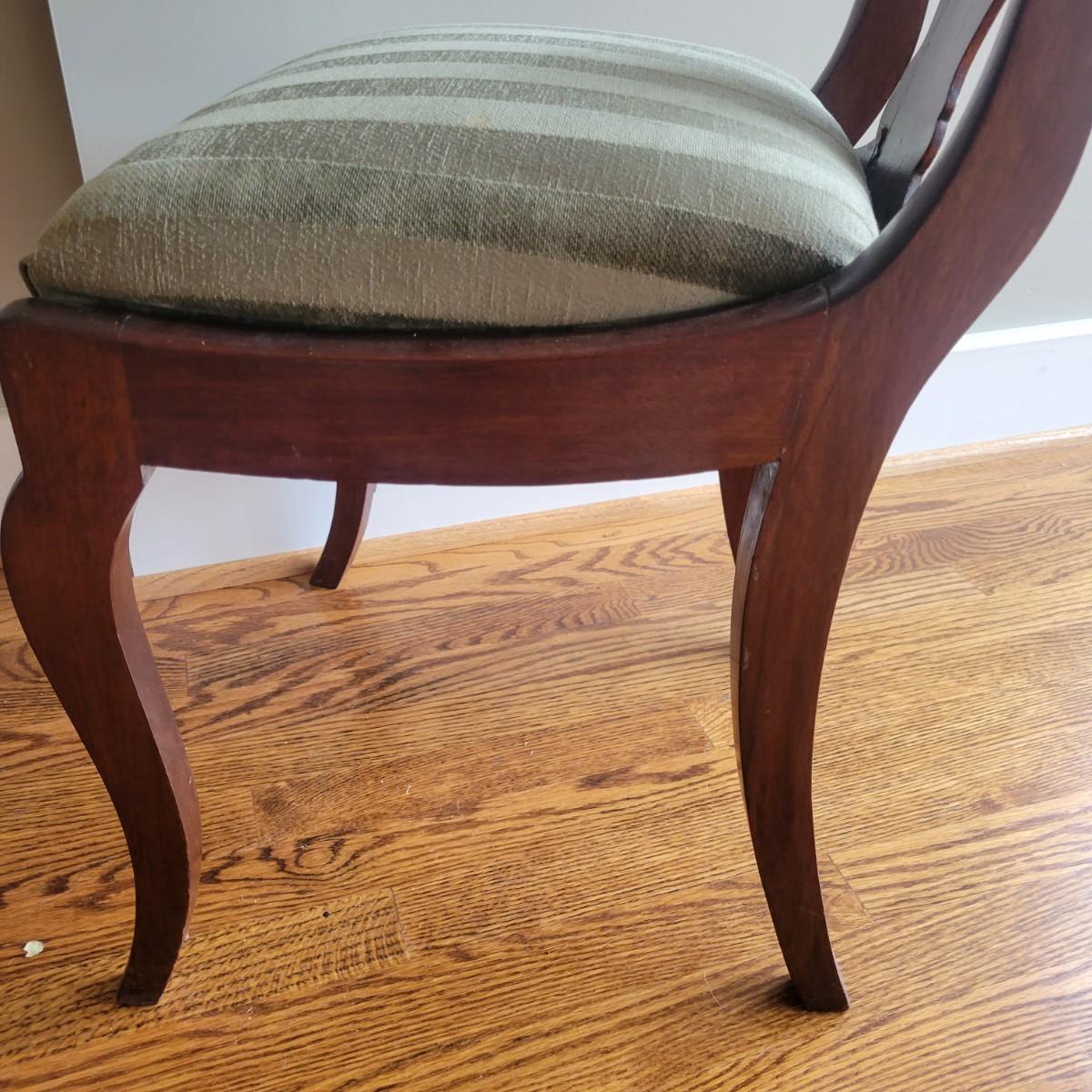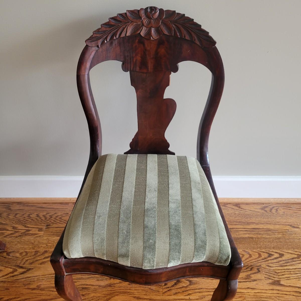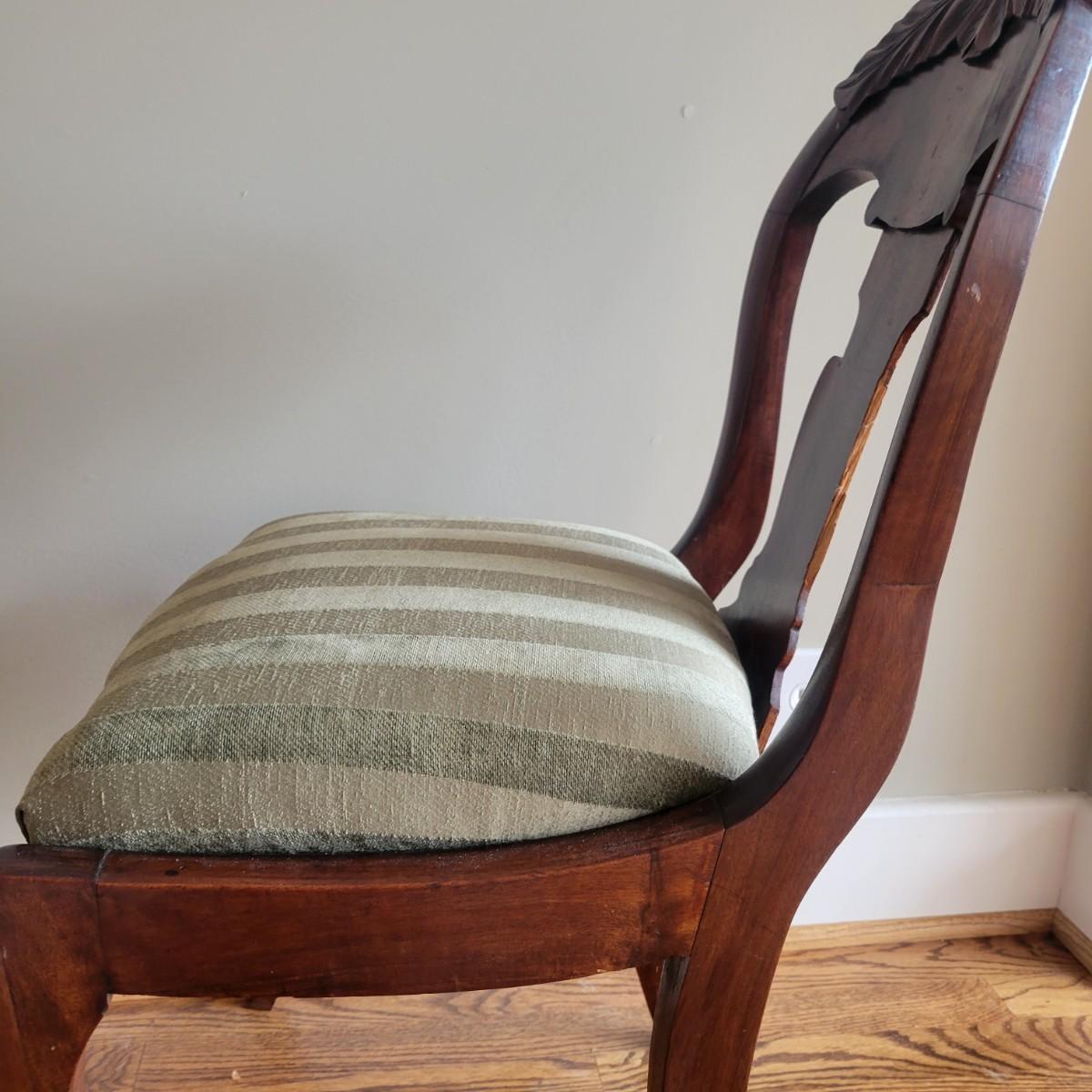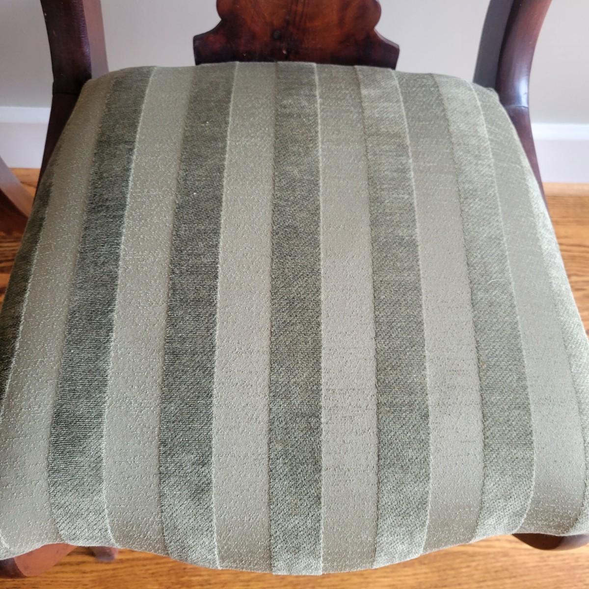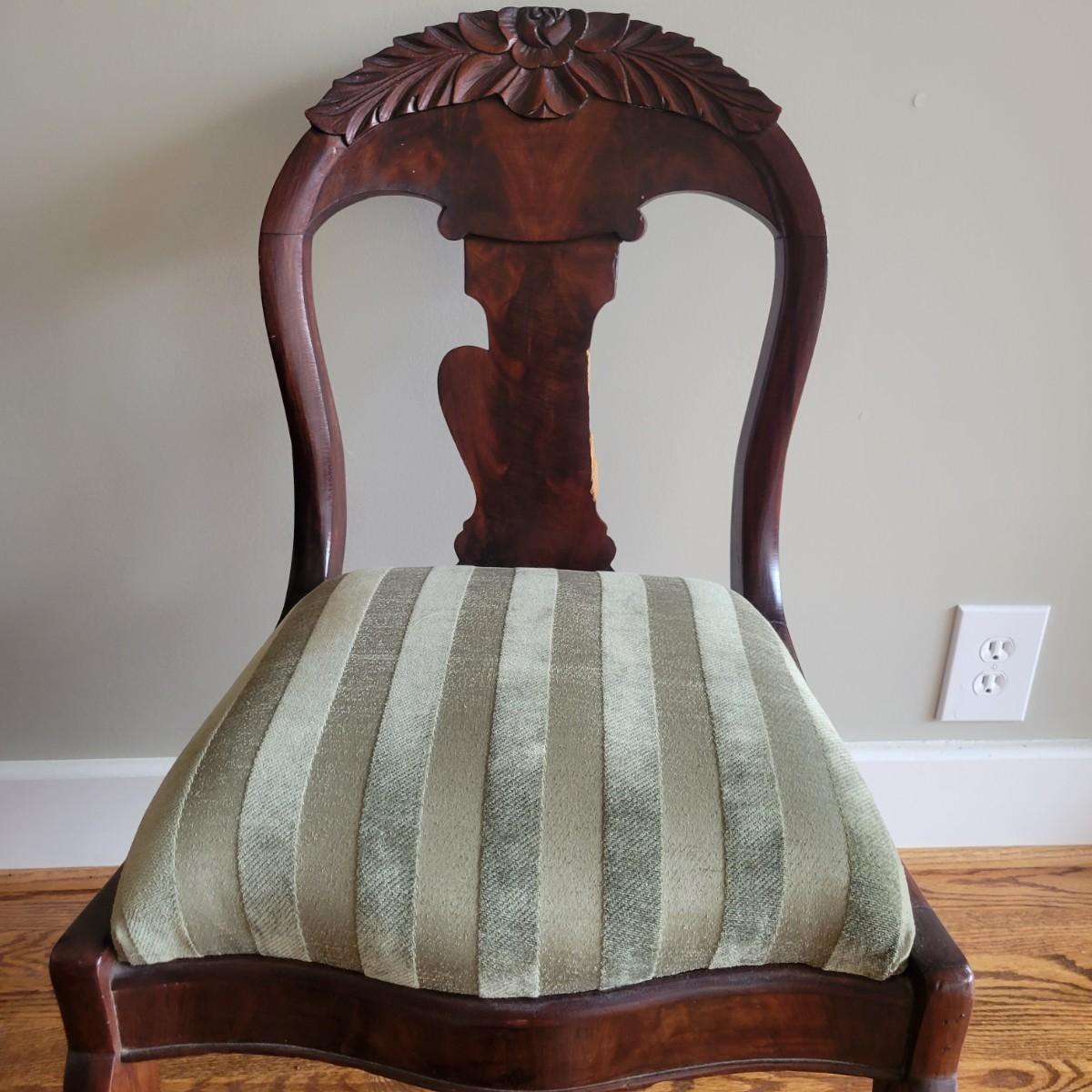 A set of six antique splat back chairs. These chairs feature a rich brown wood veneer with green striped upholstery. The top of each chair features a detailed floral carving. The chairs are in good condition for their age, but have some notable damage. Four chairs have broken pieces, but three of those pieces are with the lot ready to be reattached. Some scratches and the veneer is bubbling on a few of them. Each measure approximately 18" x 18" x 32" with a seat height of 17.5".
