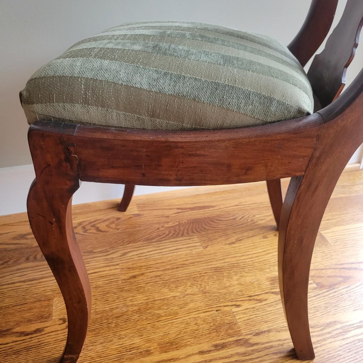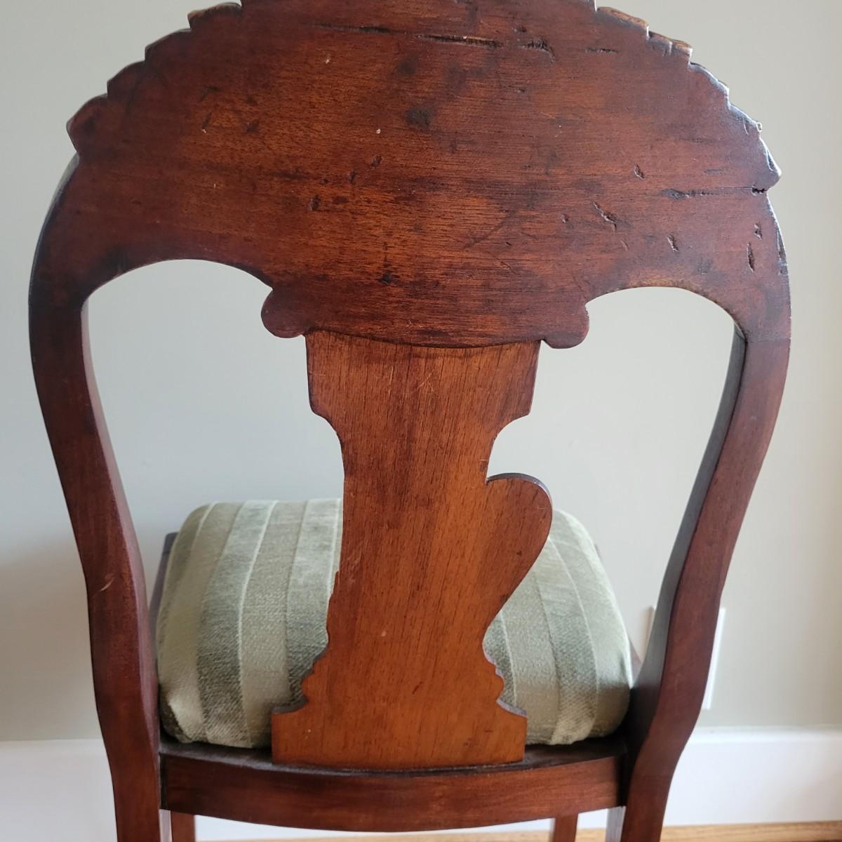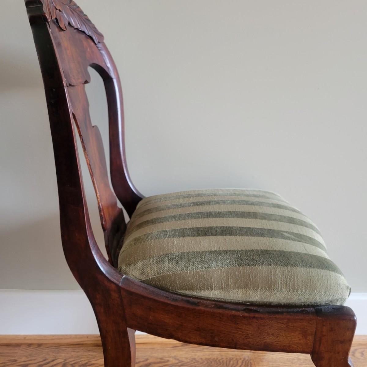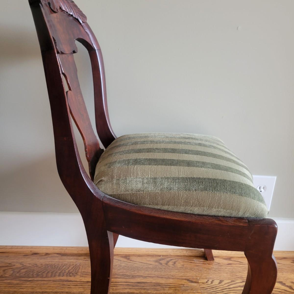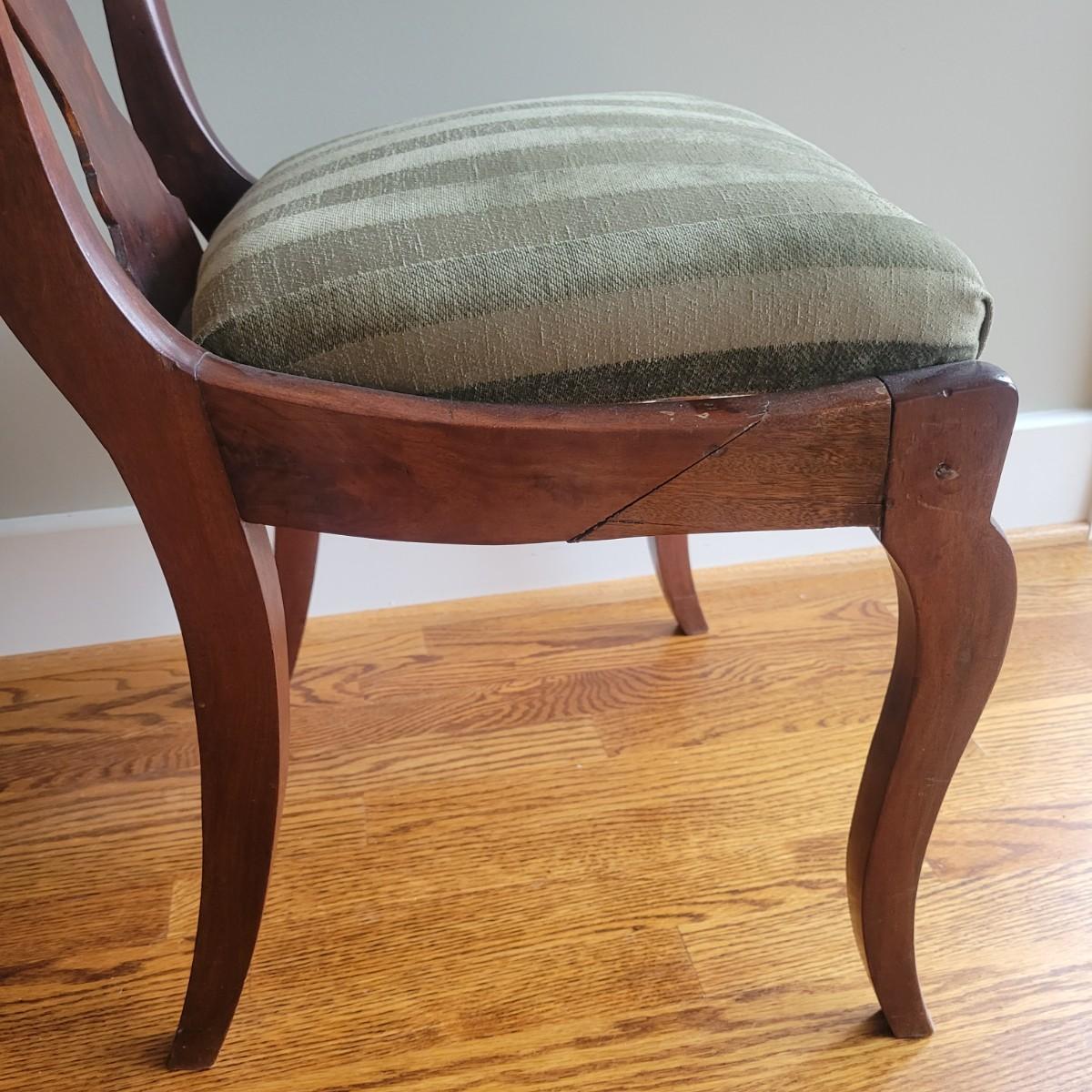 A set of six antique splat back chairs. These chairs feature a rich brown wood veneer with green striped upholstery. The top of each chair features a detailed floral carving. The chairs are in good condition for their age, but have some notable damage. Four chairs have broken pieces, but three of those pieces are with the lot ready to be reattached. Some scratches and the veneer is bubbling on a few of them. Each measure approximately 18" x 18" x 32" with a seat height of 17.5".