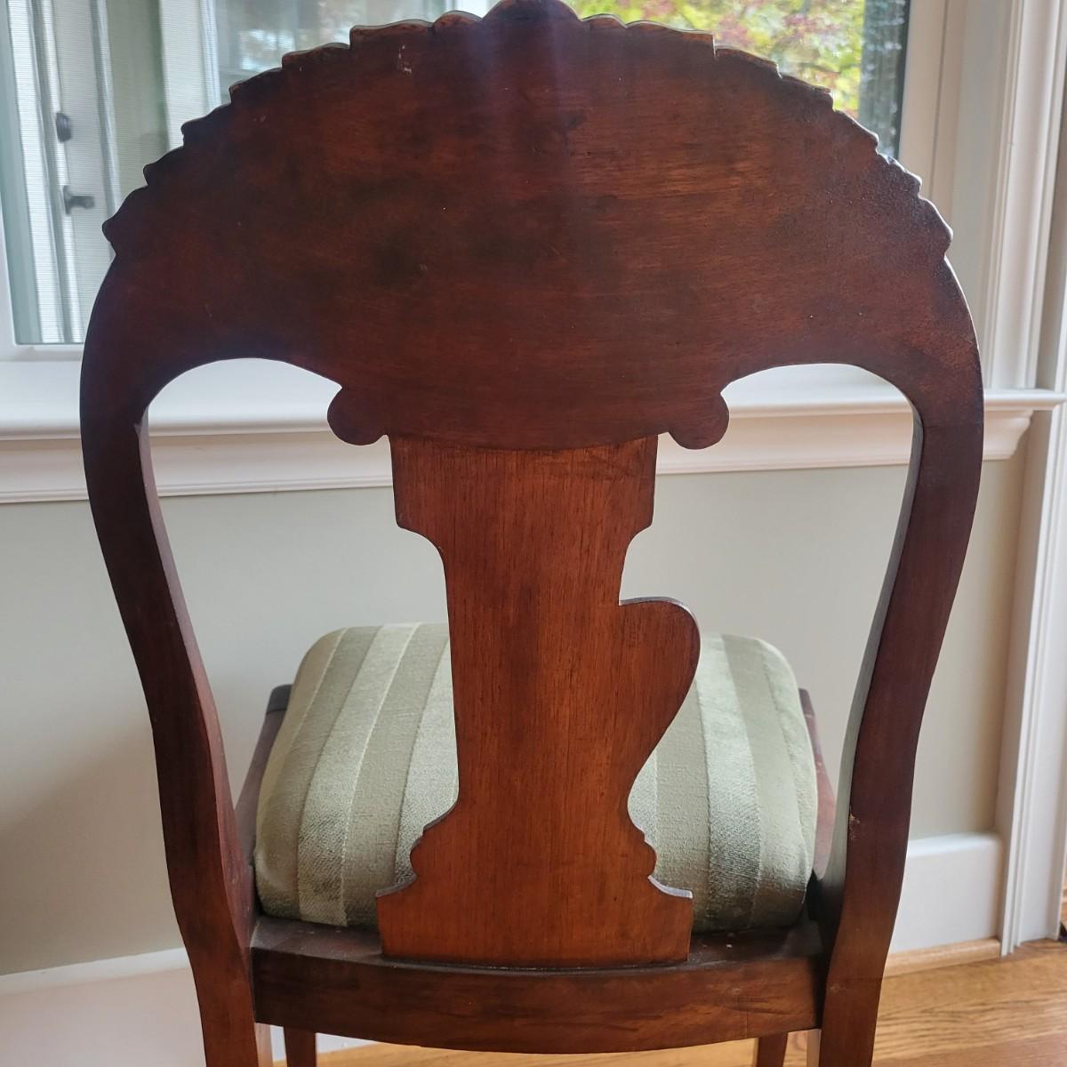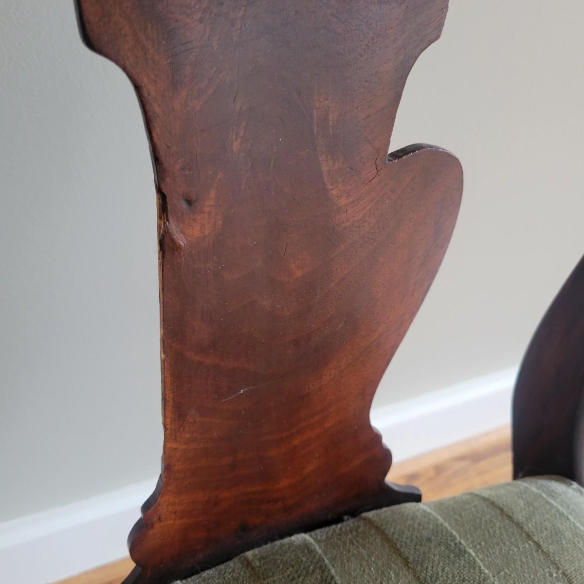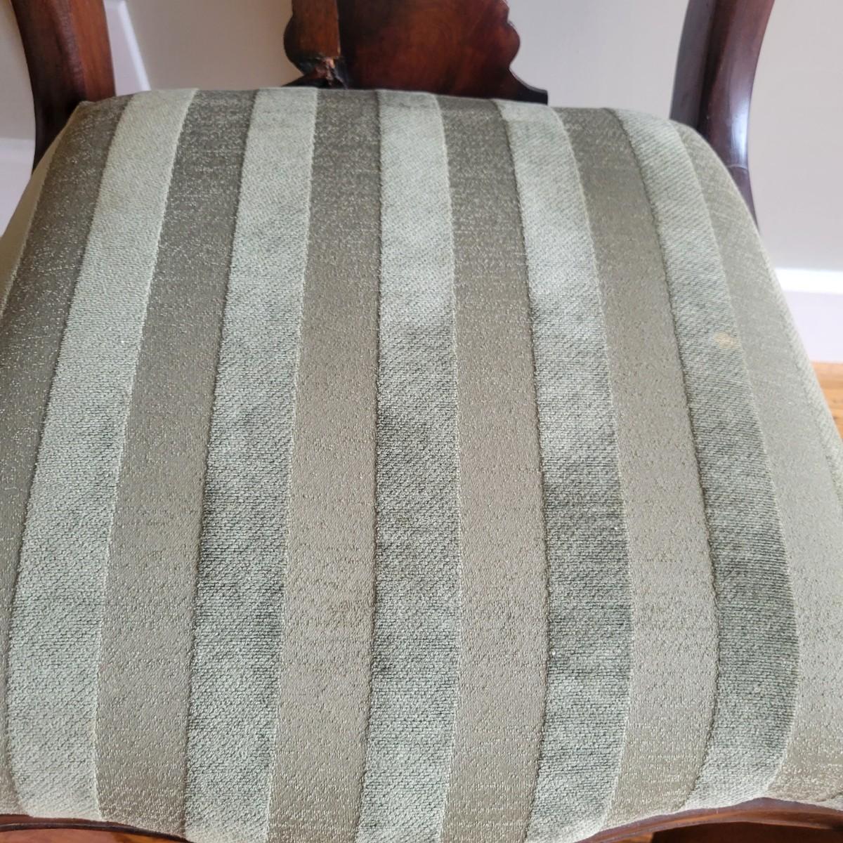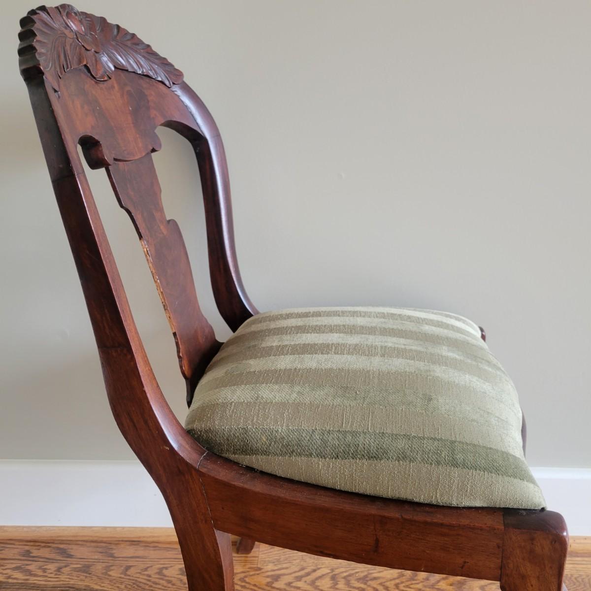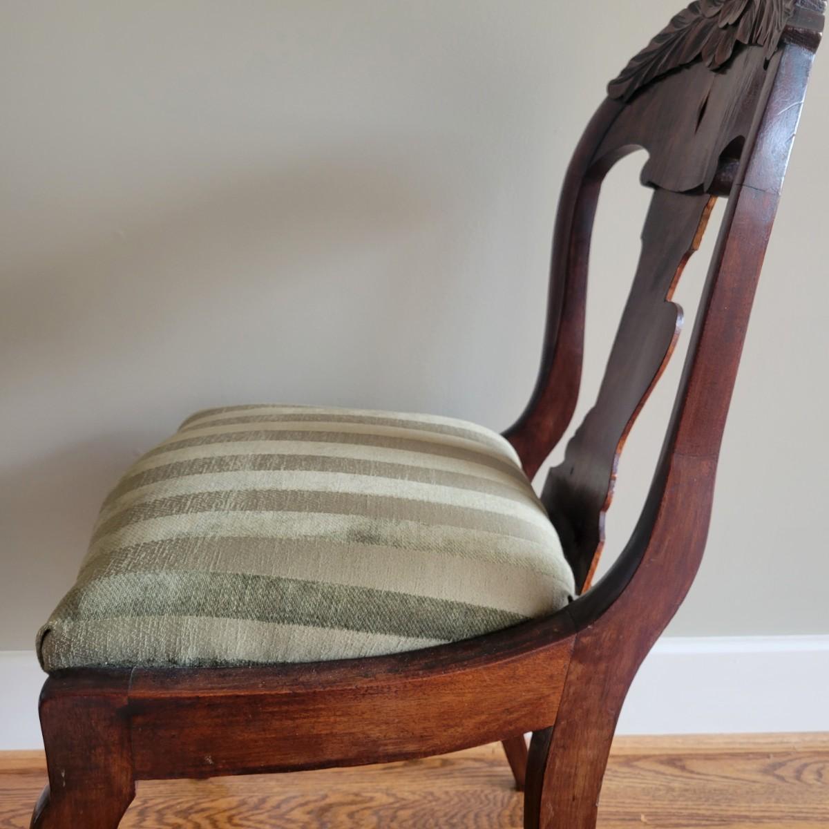 A set of six antique splat back chairs. These chairs feature a rich brown wood veneer with green striped upholstery. The top of each chair features a detailed floral carving. The chairs are in good condition for their age, but have some notable damage. Four chairs have broken pieces, but three of those pieces are with the lot ready to be reattached. Some scratches and the veneer is bubbling on a few of them. Each measure approximately 18" x 18" x 32" with a seat height of 17.5".