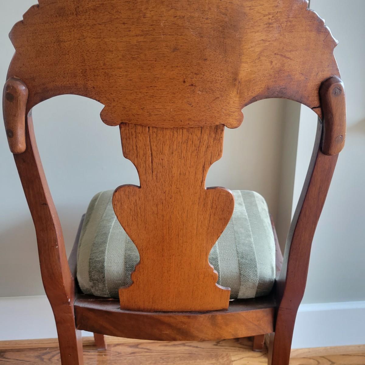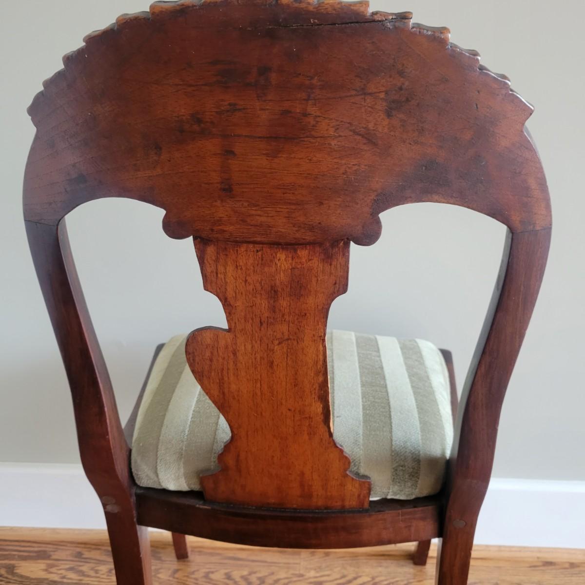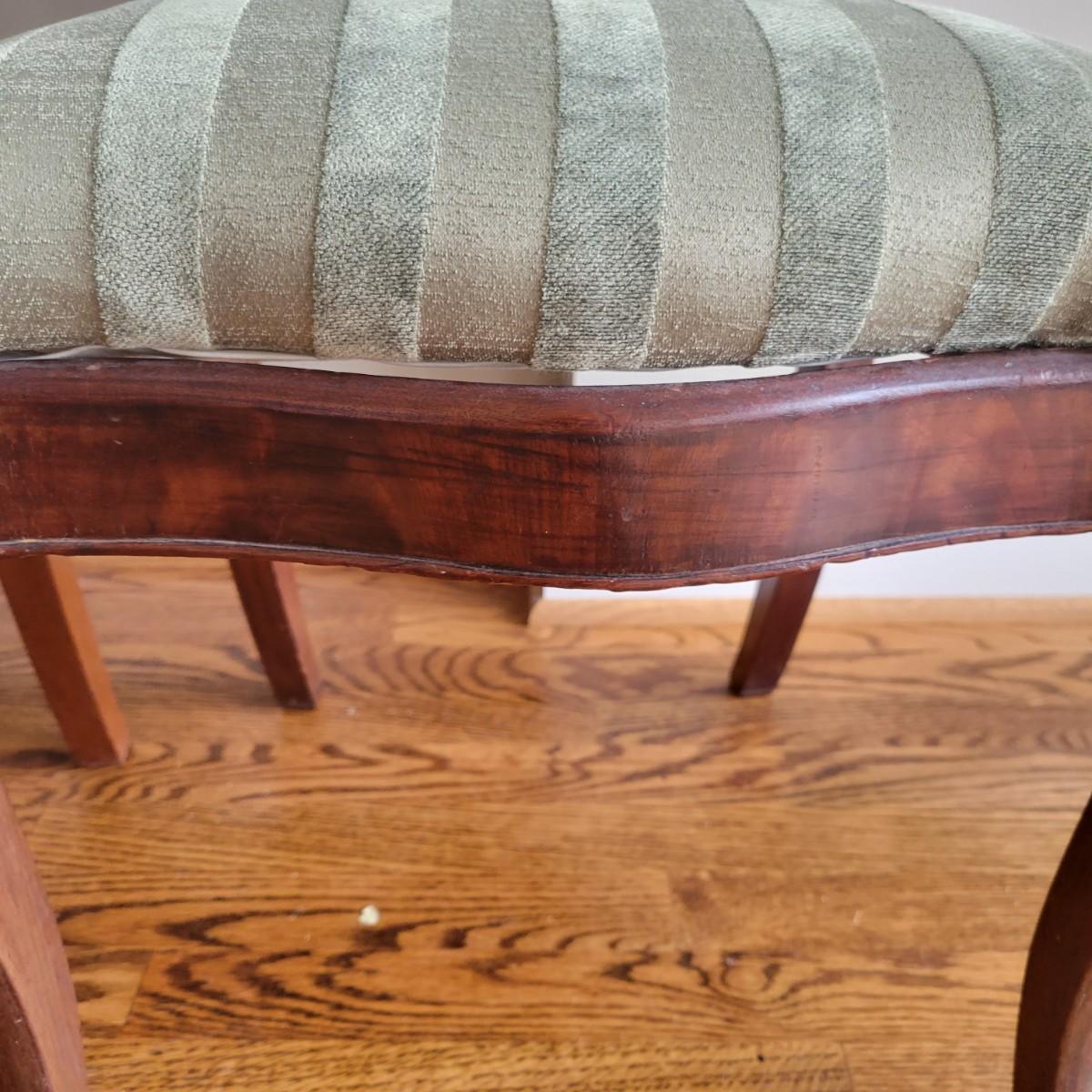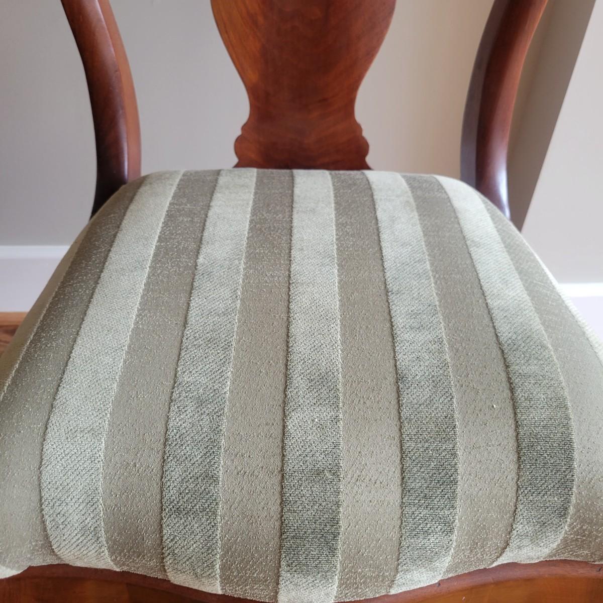 A set of six antique splat back chairs. These chairs feature a rich brown wood veneer with green striped upholstery. The top of each chair features a detailed floral carving. The chairs are in good condition for their age, but have some notable damage. Four chairs have broken pieces, but three of those pieces are with the lot ready to be reattached. Some scratches and the veneer is bubbling on a few of them. Each measure approximately 18" x 18" x 32" with a seat height of 17.5".