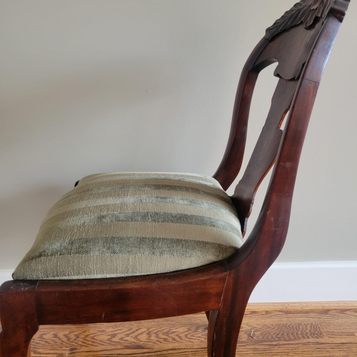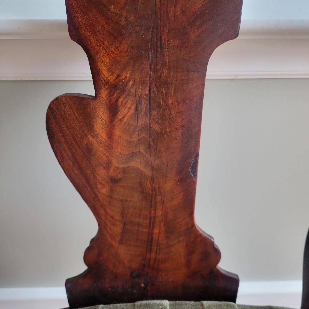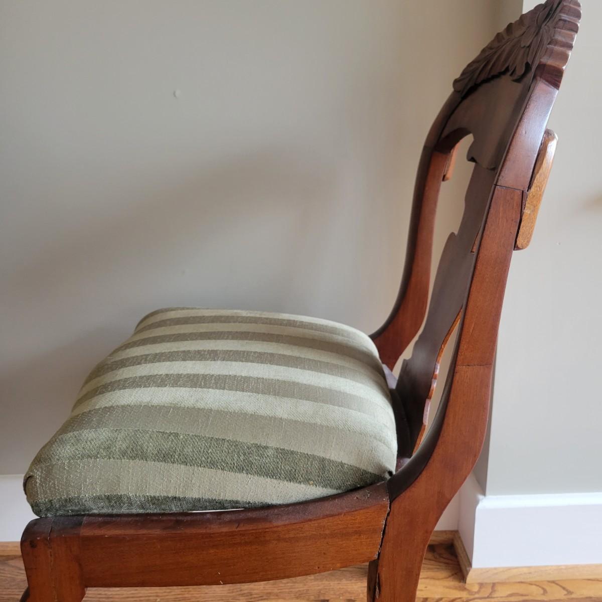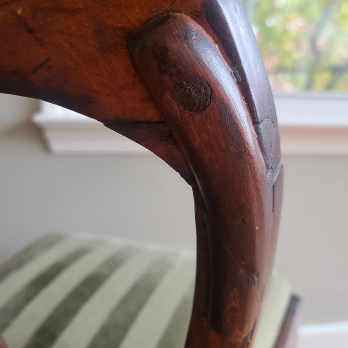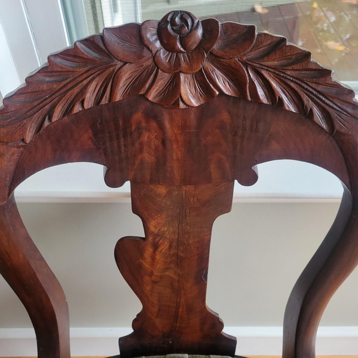 A set of six antique splat back chairs. These chairs feature a rich brown wood veneer with green striped upholstery. The top of each chair features a detailed floral carving. The chairs are in good condition for their age, but have some notable damage. Four chairs have broken pieces, but three of those pieces are with the lot ready to be reattached. Some scratches and the veneer is bubbling on a few of them. Each measure approximately 18" x 18" x 32" with a seat height of 17.5".