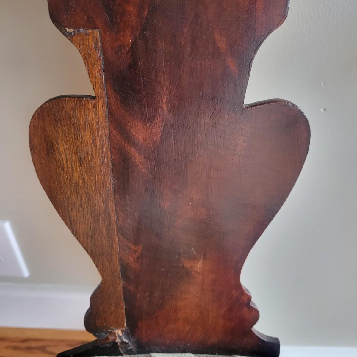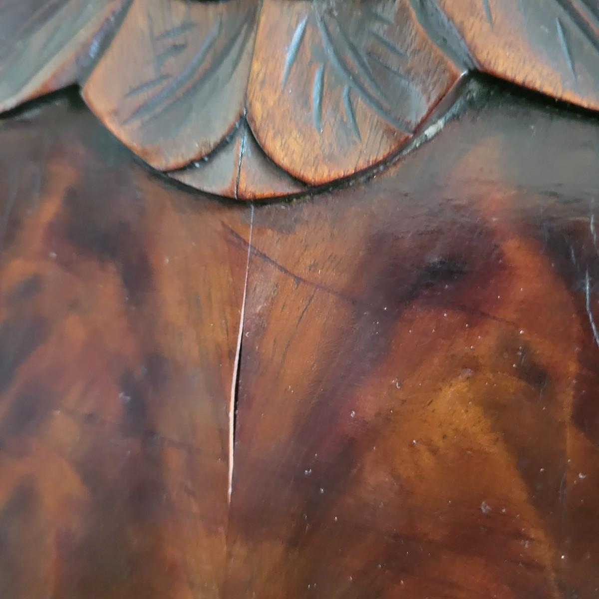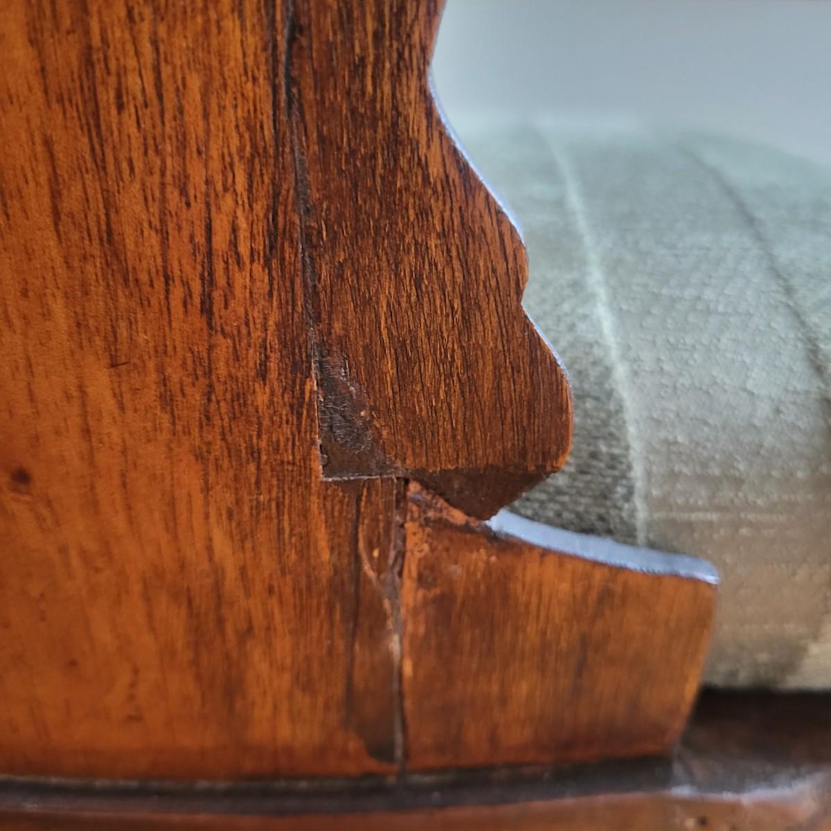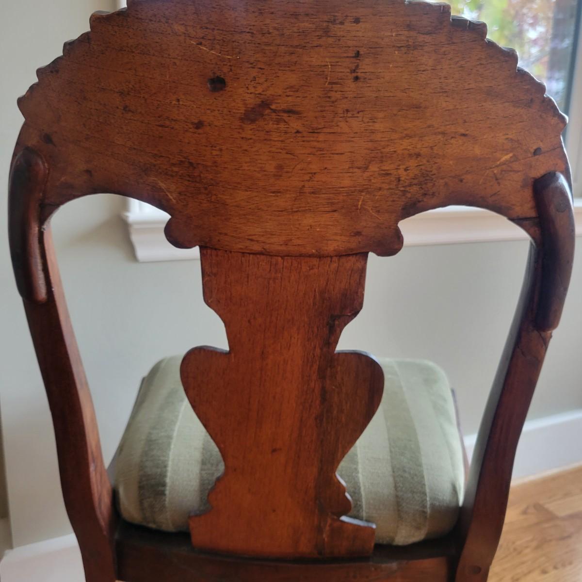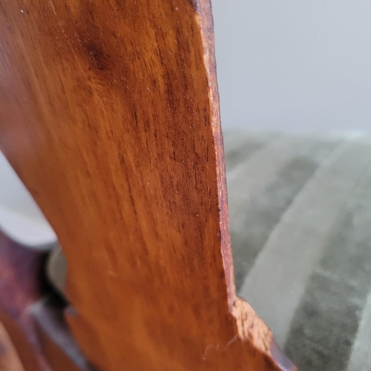 A set of six antique splat back chairs. These chairs feature a rich brown wood veneer with green striped upholstery. The top of each chair features a detailed floral carving. The chairs are in good condition for their age, but have some notable damage. Four chairs have broken pieces, but three of those pieces are with the lot ready to be reattached. Some scratches and the veneer is bubbling on a few of them. Each measure approximately 18" x 18" x 32" with a seat height of 17.5".